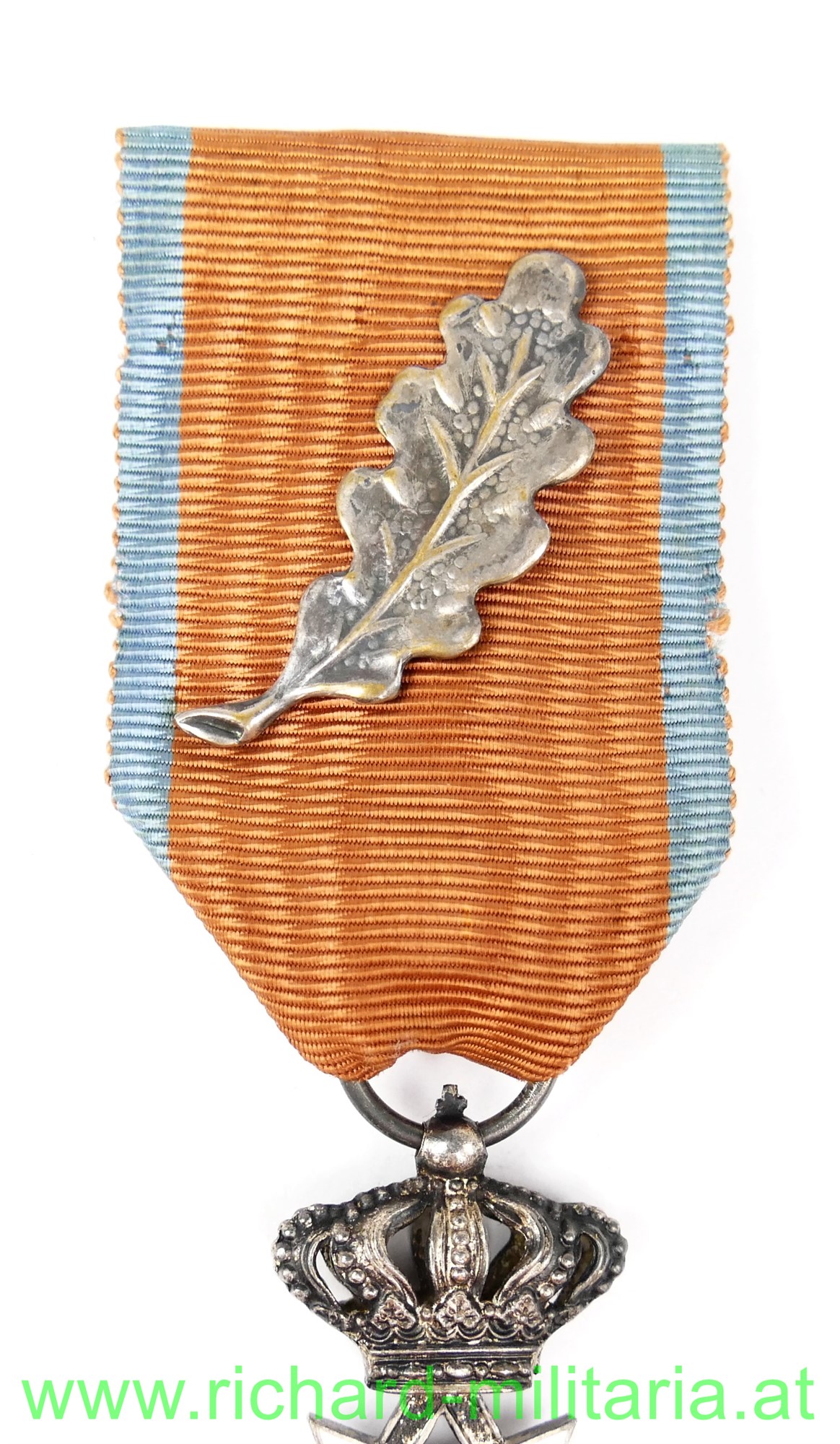 Rumänien - Orden der Krone 2. Modell 1932-47; Ritterkreuz mit Schwertern; Tombak versilbert und emailliert, Reste der Versilberung erkennbar; vergoldete Auflage am Mittelmedaillon; originales Band für militärischen Verdienst mit Bandauflage