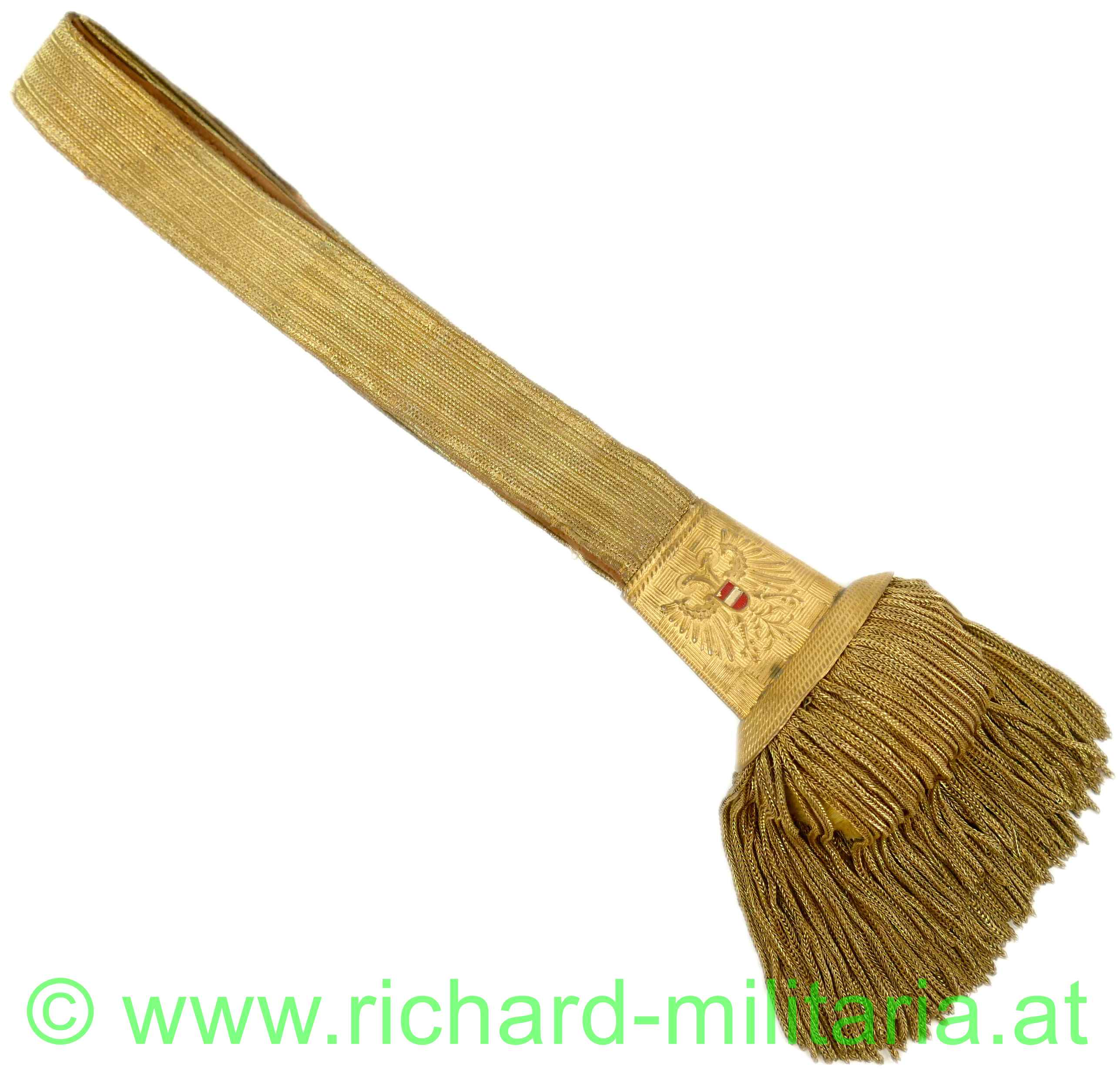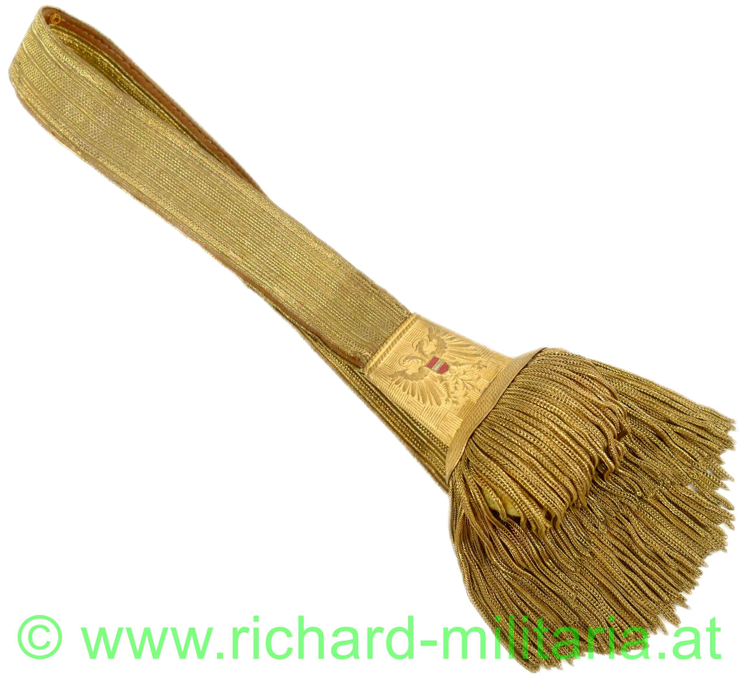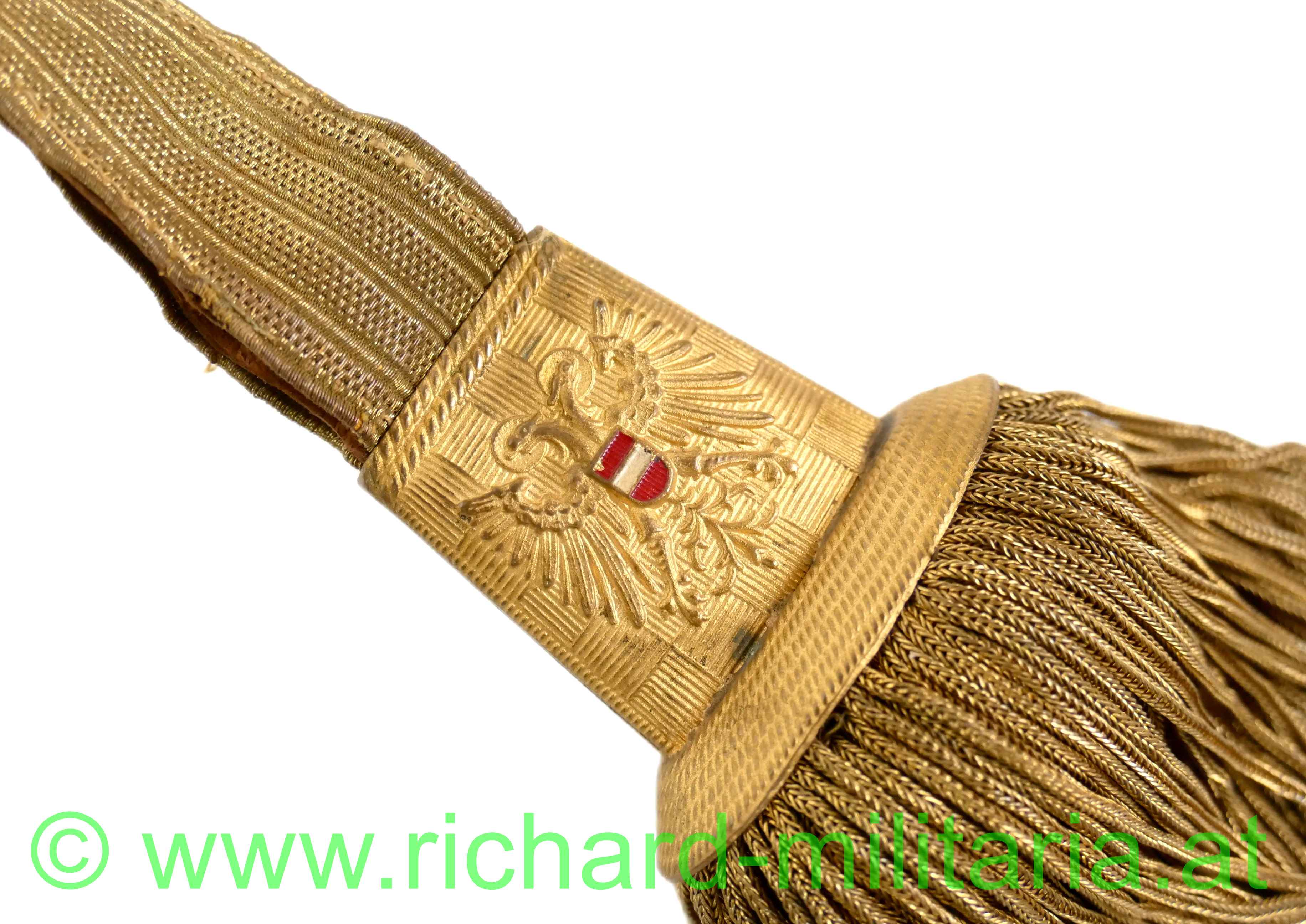 Säbelportepee für Offiziere des österreichischen Ständestaates, 1934-1938; Luxusausführung; Band aus Goldfaden mit 3 goldenen Durchzügen - mit Leder hinterlegt, Metallhülse mit geprägtem Bundesadler - Bindenschild rot-weiß-rot lackiert; Fransen aus vergoldeten Metallfäden - Ketterlportepee; Länge ca.: 46 cm;