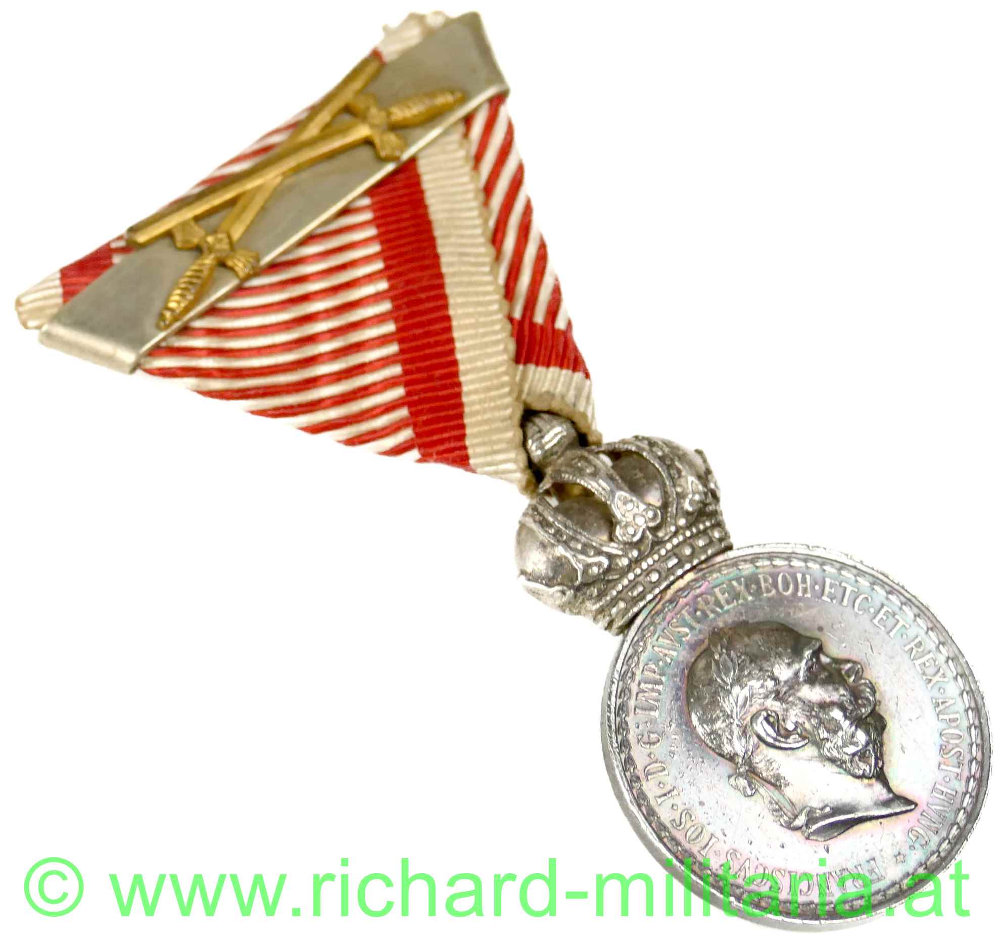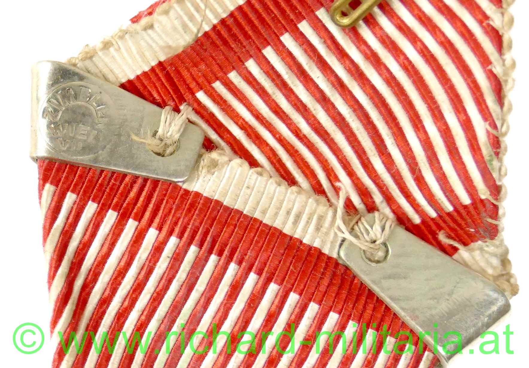 Silbernes Signum Laudis Kaiser Franz Josef mit Wiederholungsspange; Medaille aus Silber; Windhundpunzierung und Herstellerpunzierung "JZ" (Zimbler) am Ring; Wiederholungsspange am originalen Band mit Hersteller "Zimbler" auf der Rückseite der Wiederholungsspange und aufgelegtenSchwertern;