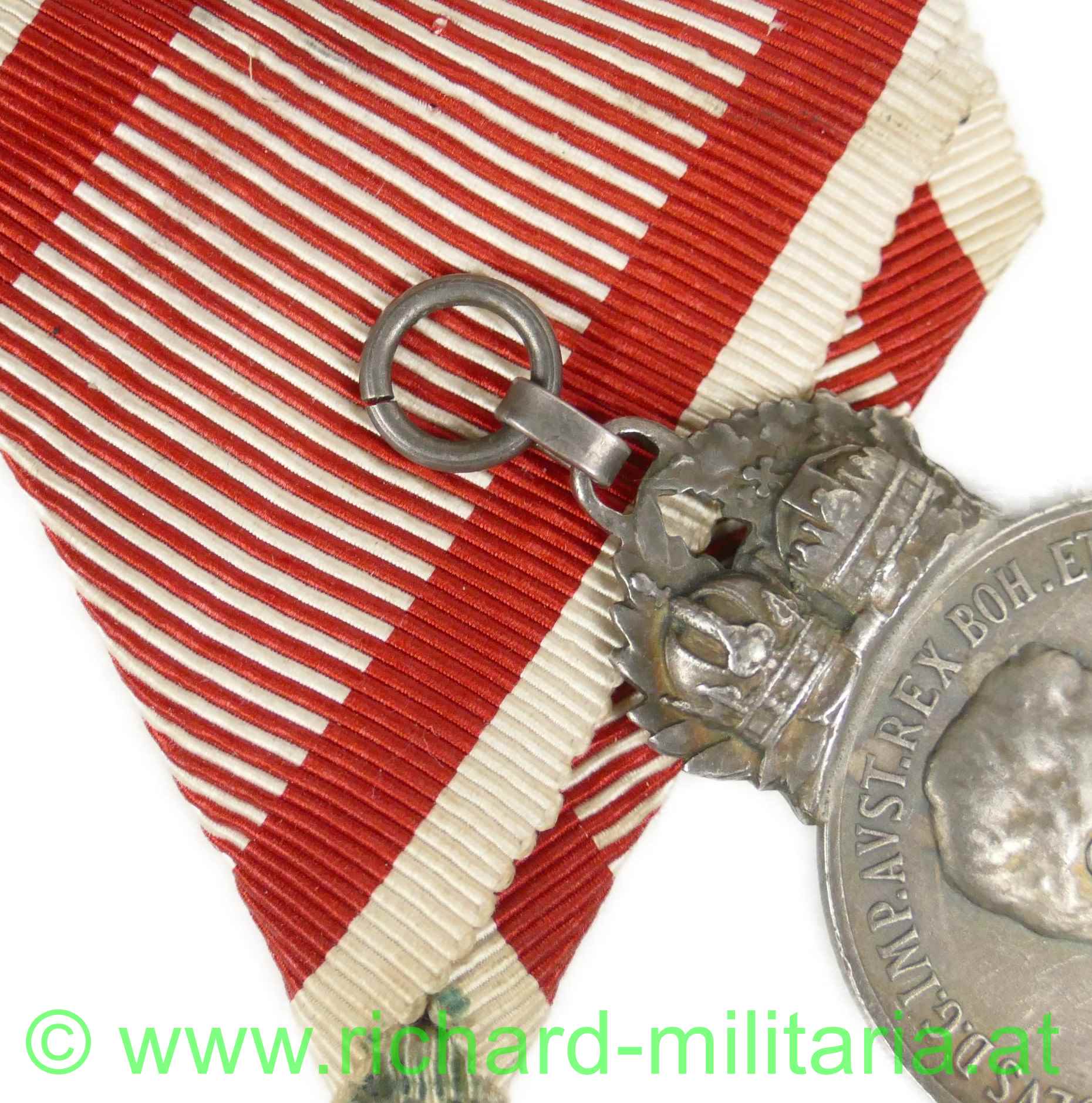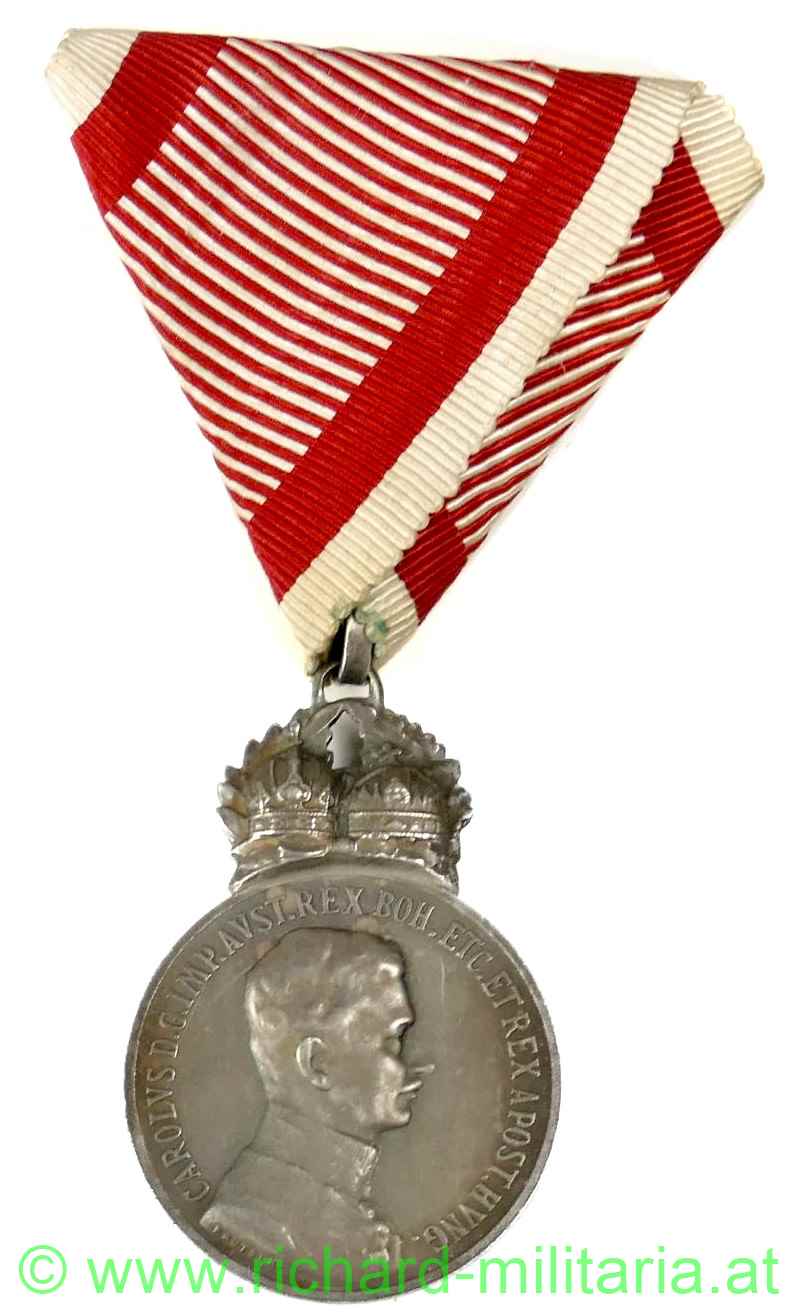 Silbernes Signum Laudis Kaiser Karl; Zink versilbert; ohne Punzierungen; späte Kriegsfertigung am originalen Band;