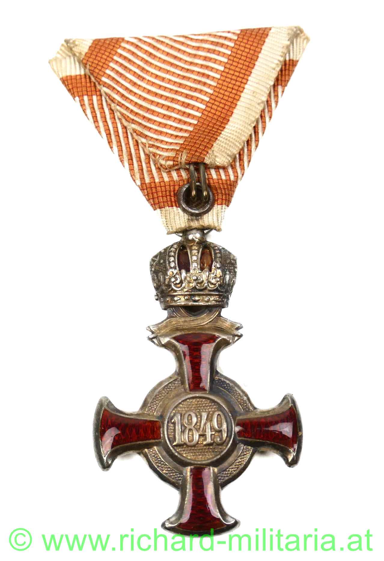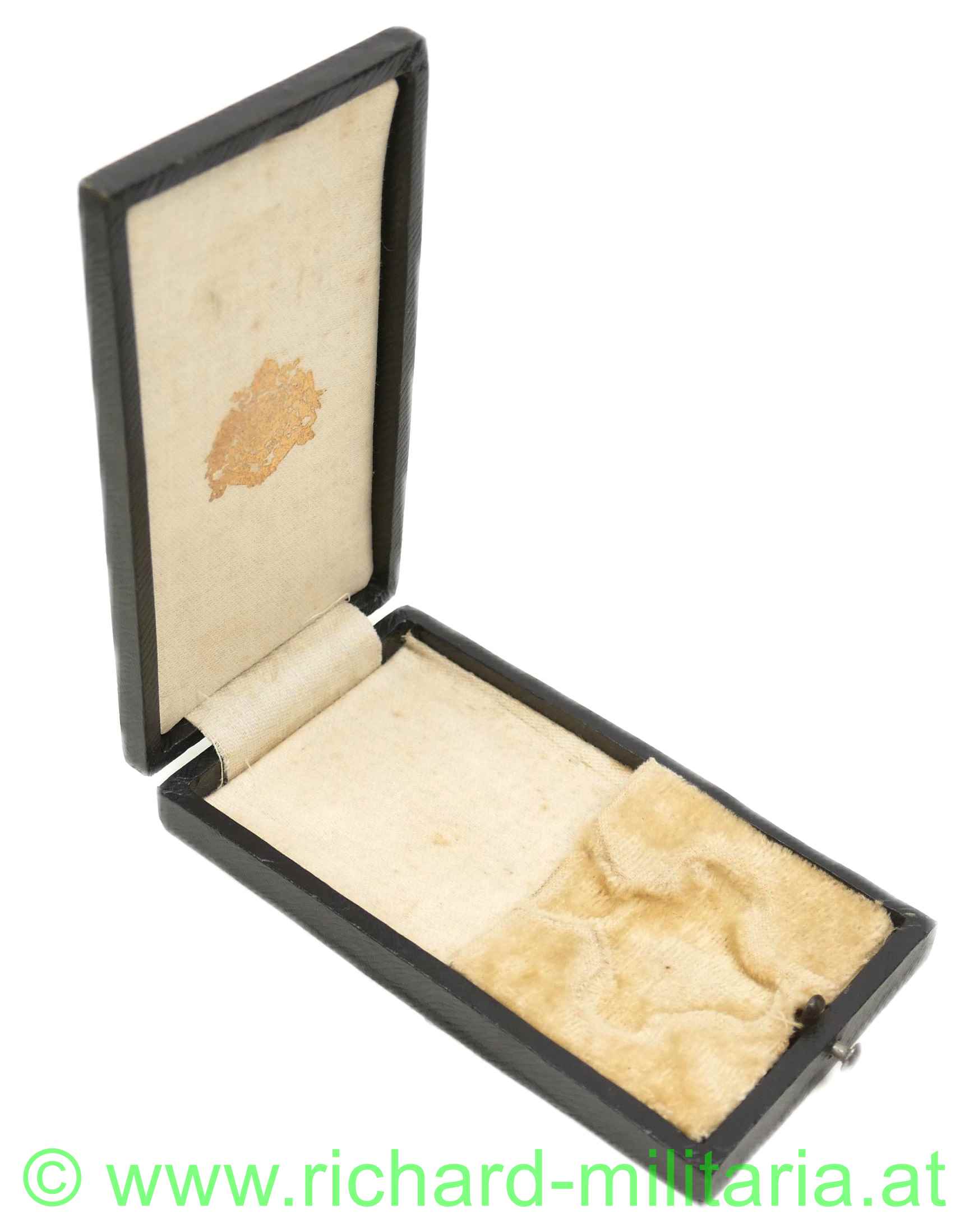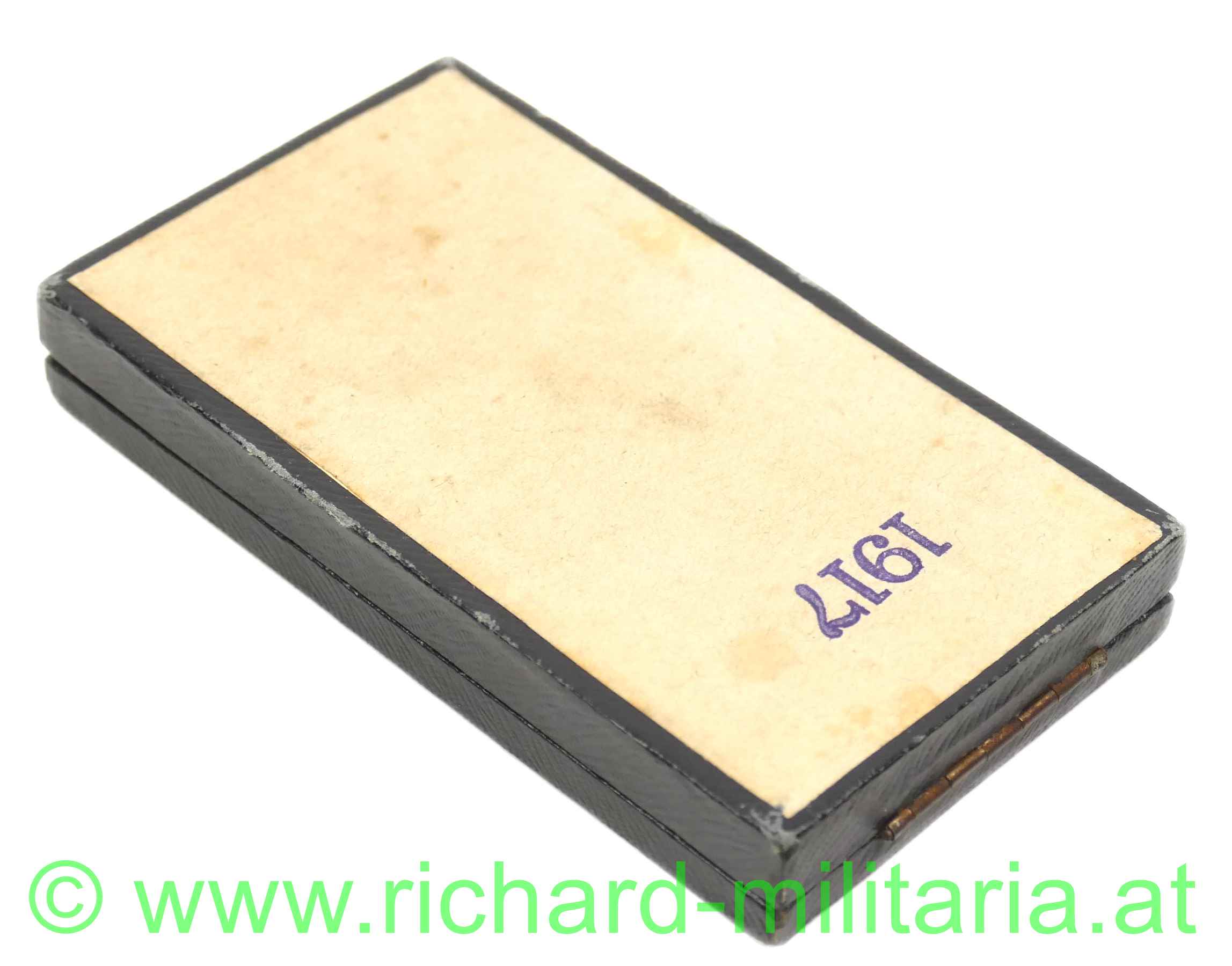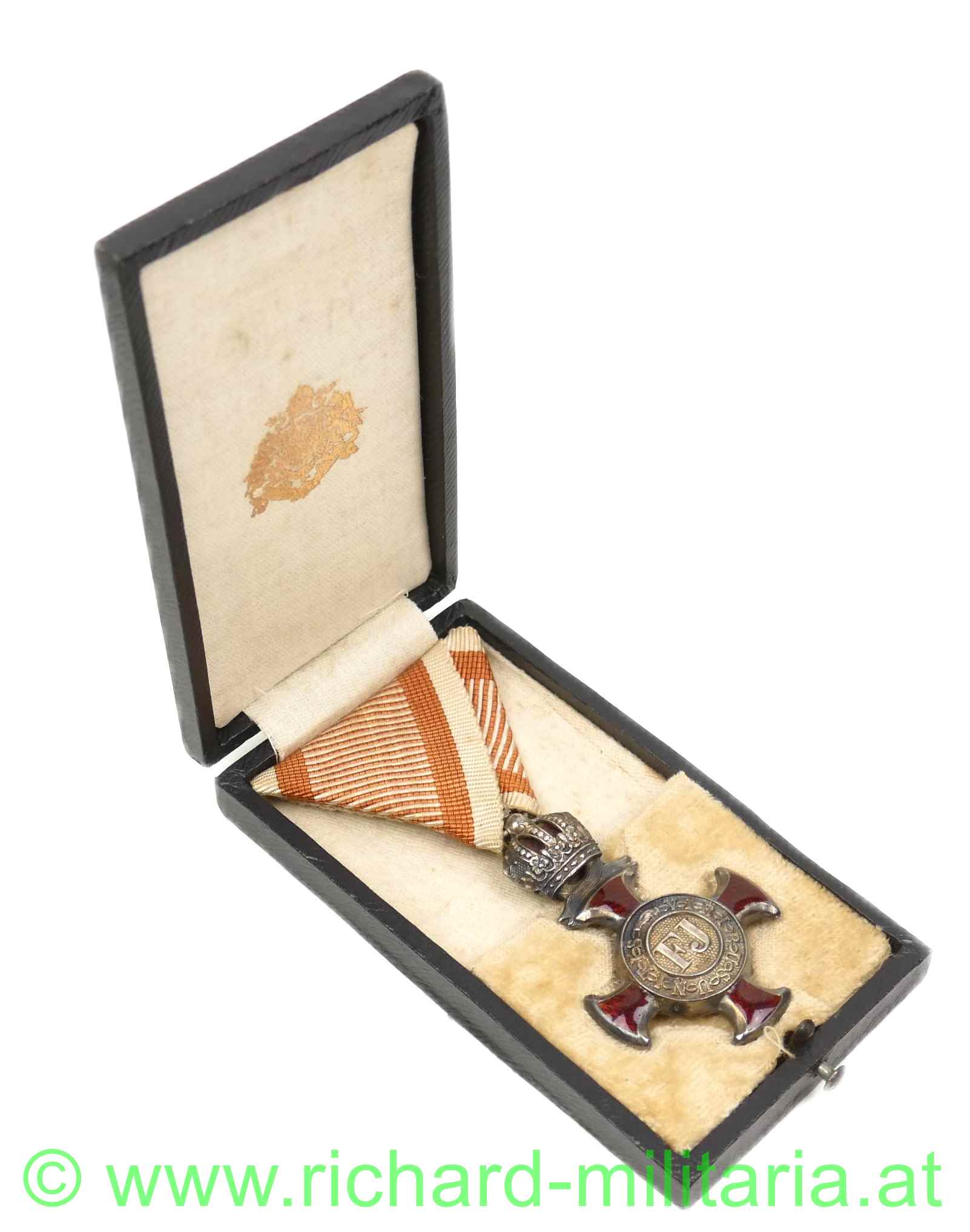 Silbernes Verdienstkreuz mit der Krone im originalen Etui; Silber mit Hersteller Kunz im Ring; innen-emaillierte Krone (auf der Rückseite Emailfehler); typische für Kunzstücke dunkel emaillierte Kreuzarme (ohne Emailschäden); originales spätes Kriegsband; im originalen Etui mit Prägung "V.K. m.d.K." und Bodenstempel "1917".