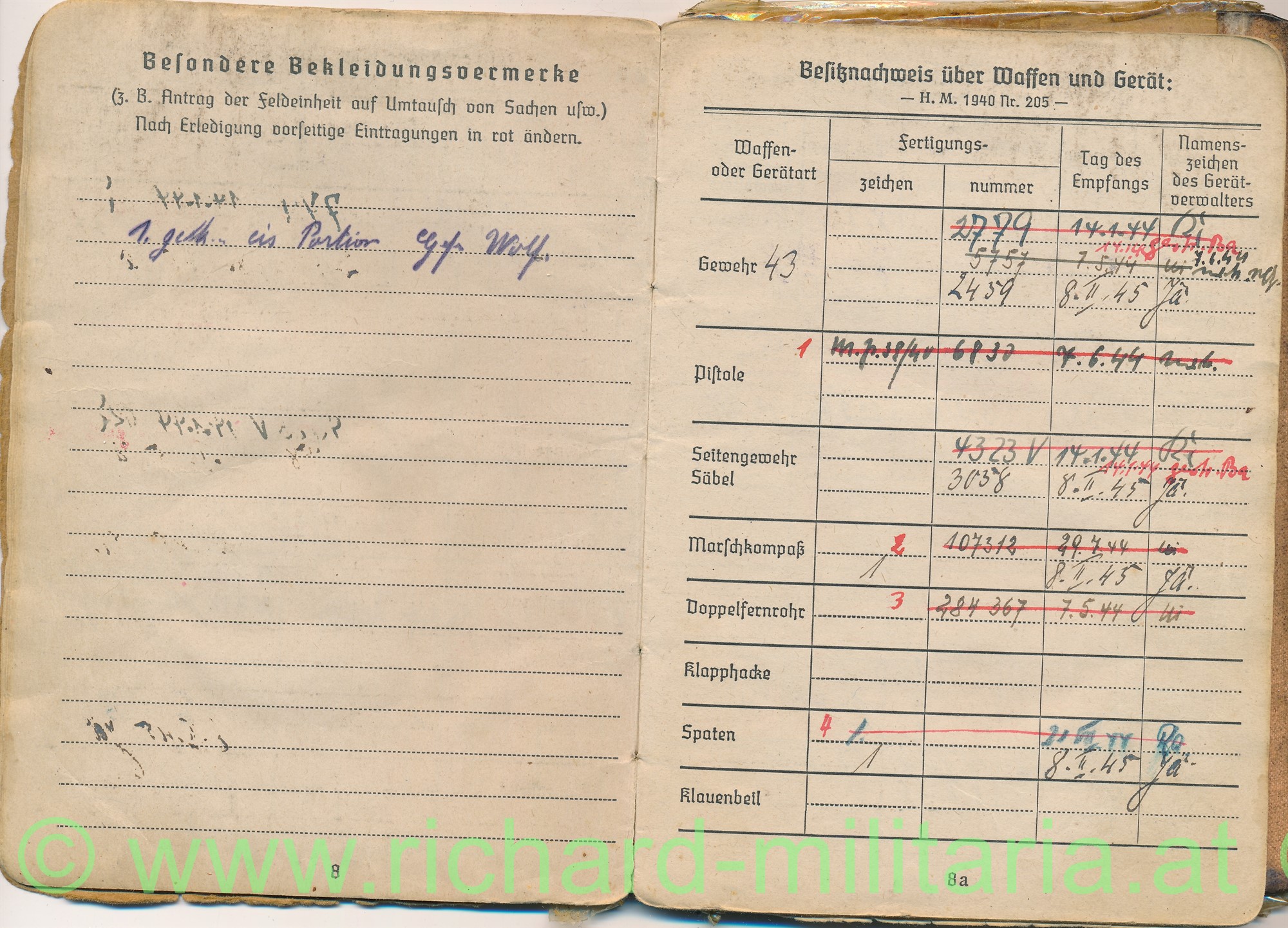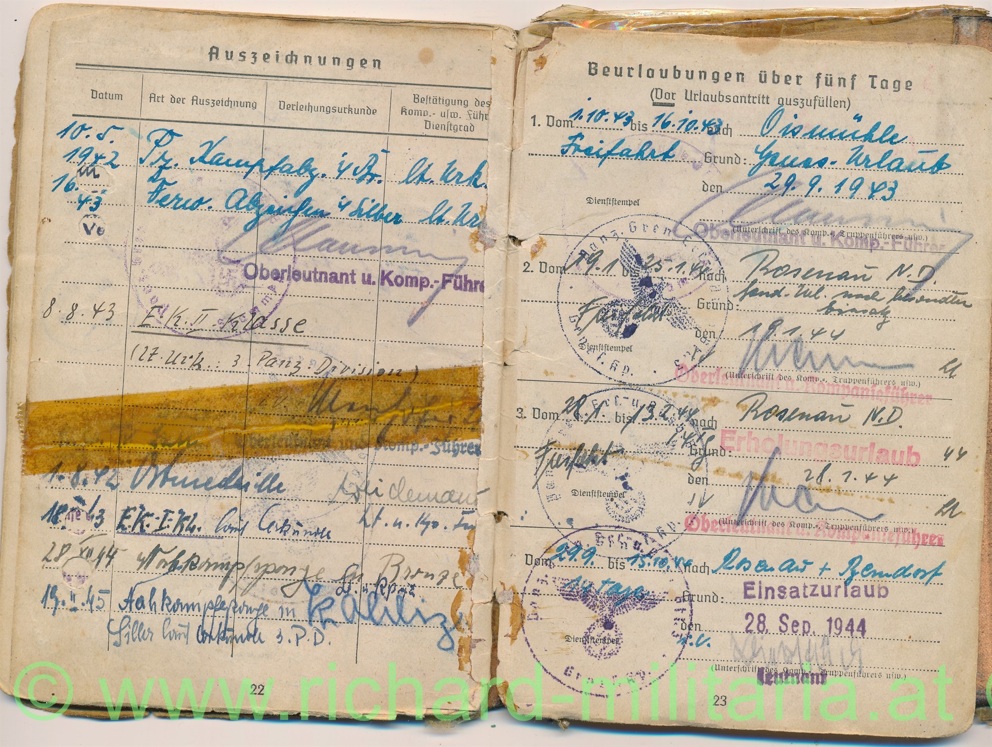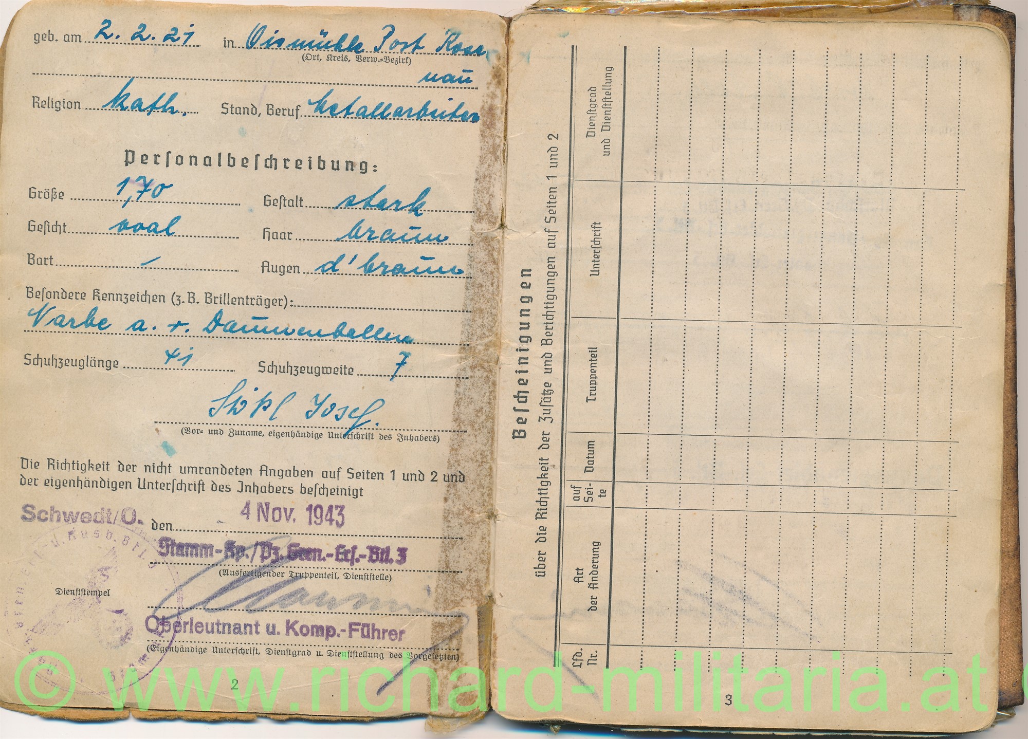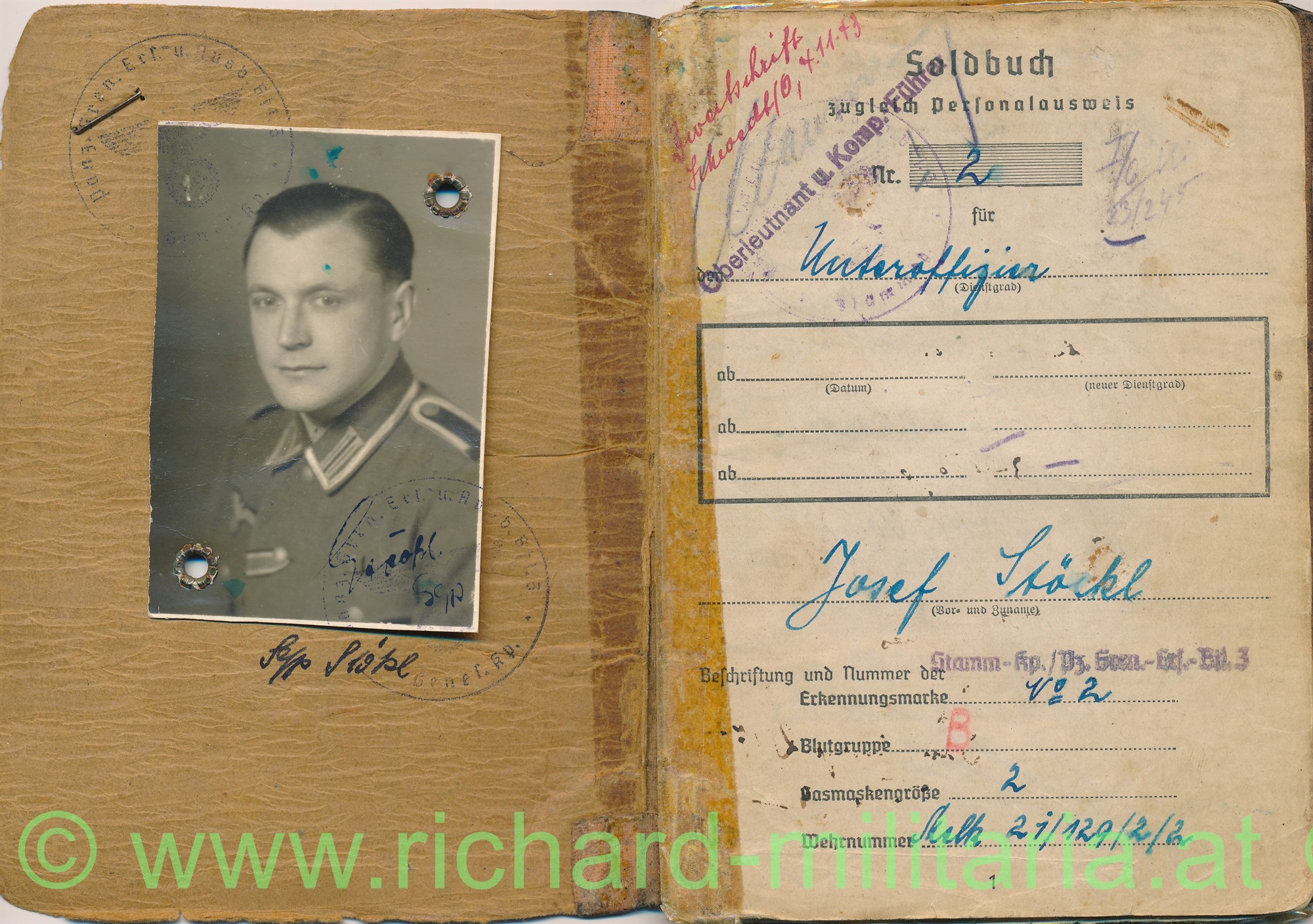 Soldbuch des Unteroffizier Josef Stöckl, Melk; Unteroffizier der Panzergrenadiere in der 3. Panzer Division; ausgestellt am 4.11.1943; vollständig mit Foto; zahlreiche Eintragungen; u.a. auf Seite 8a "GEWEHR 43" (!!!); eingetragene Auszeichnungen: