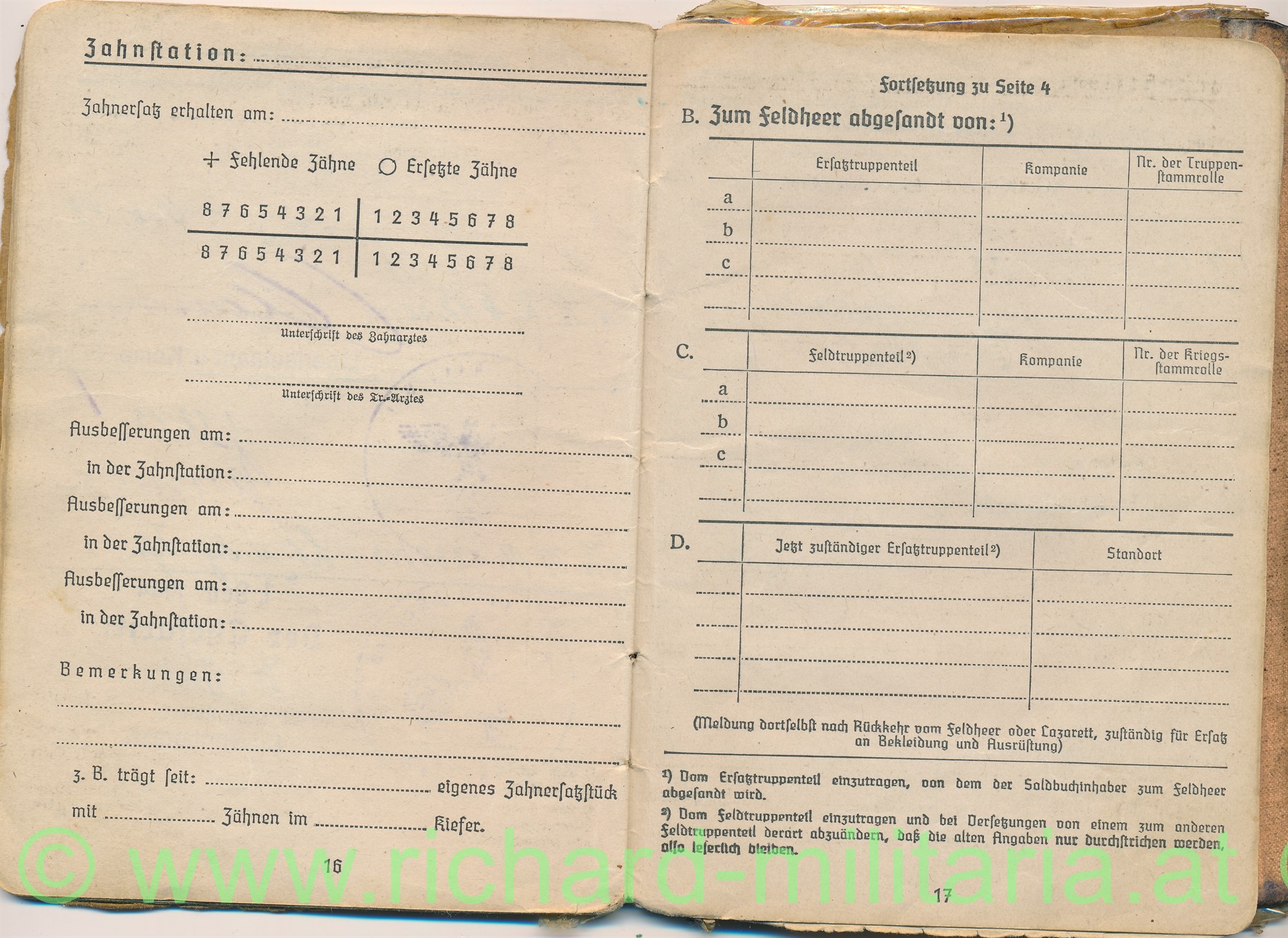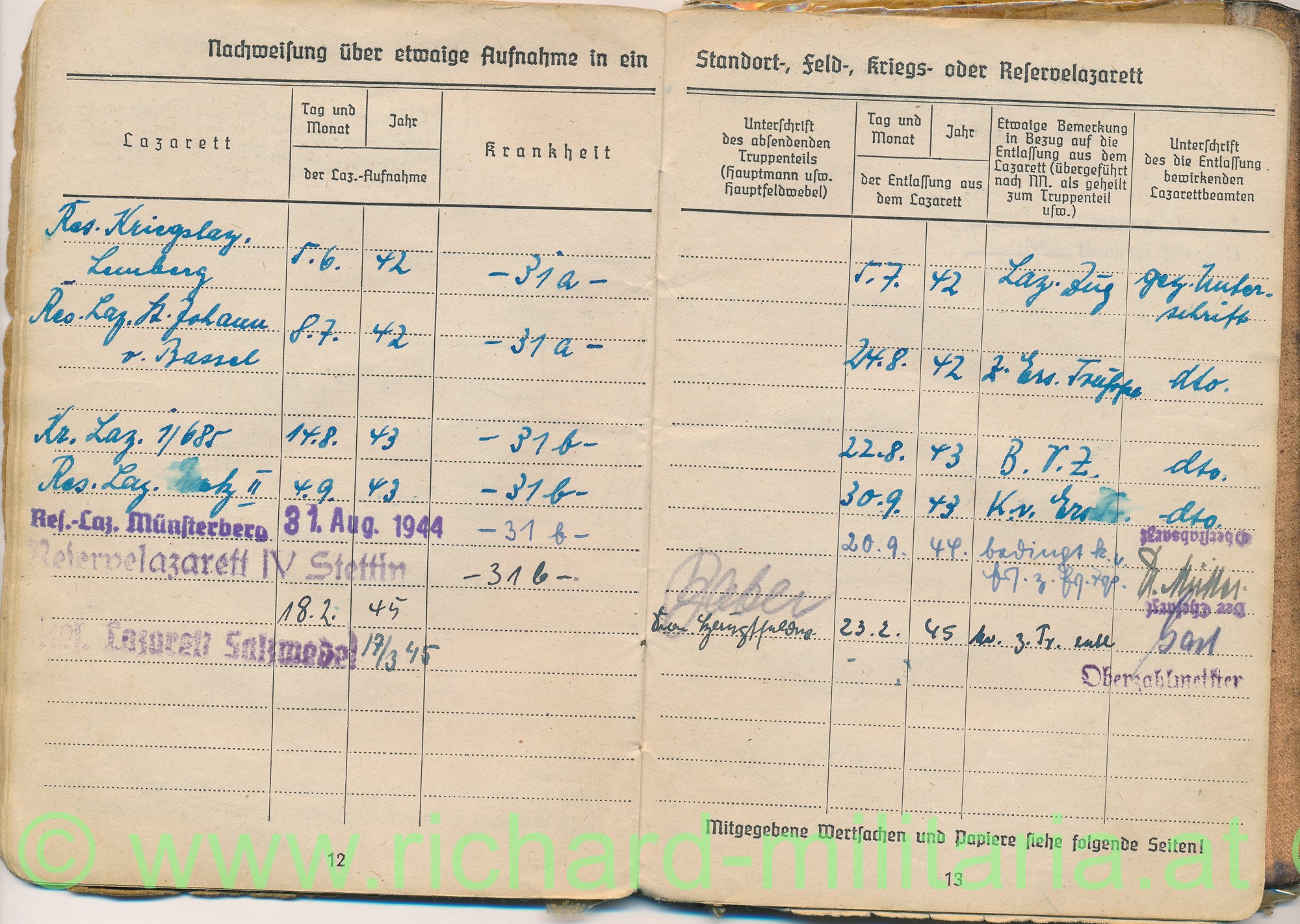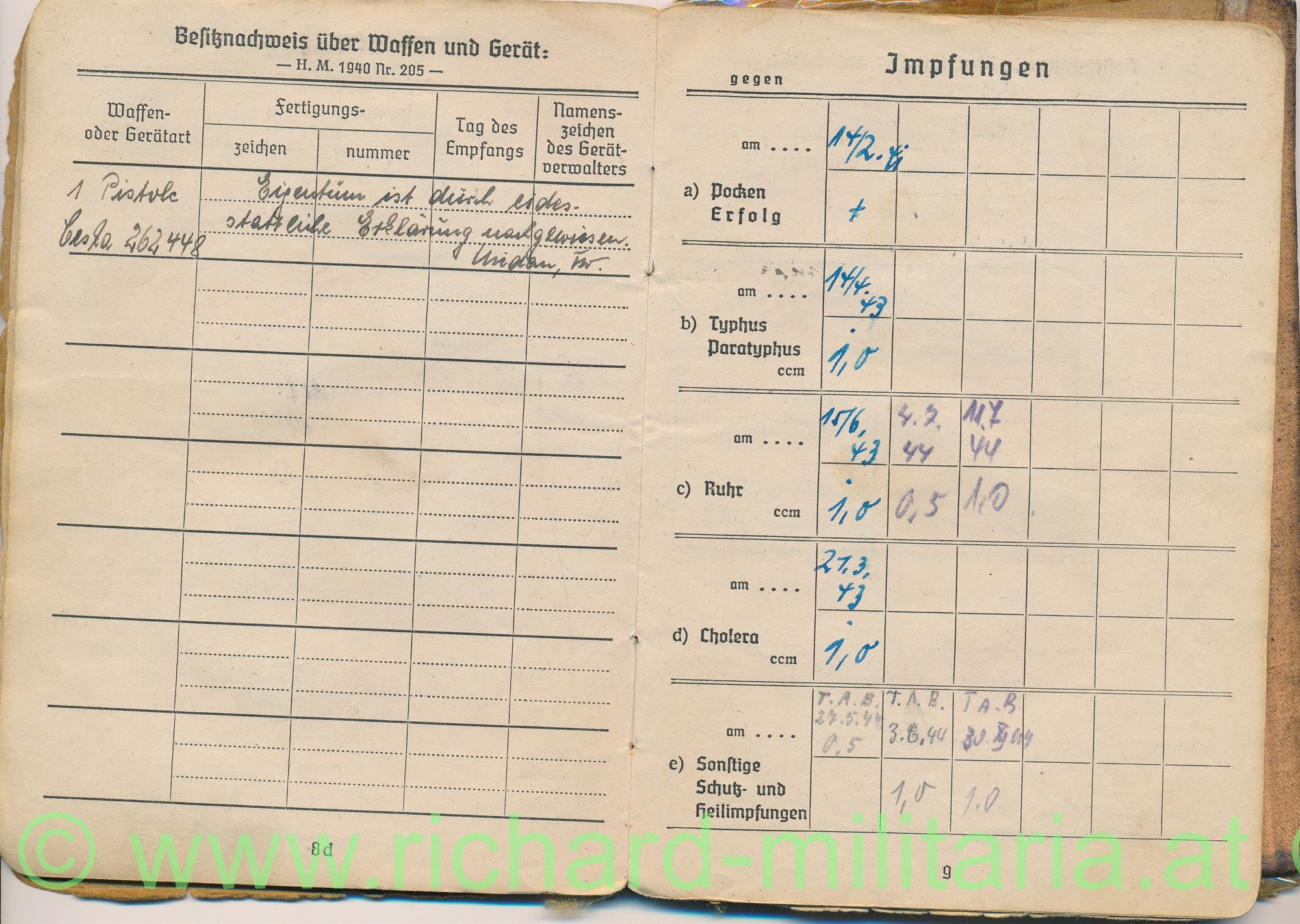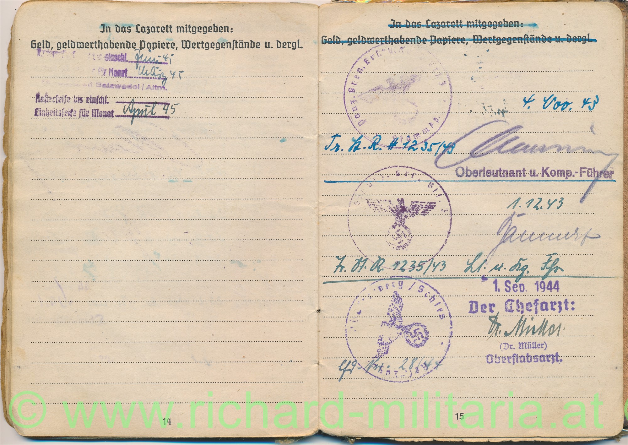 Soldbuch des Unteroffizier Josef Stöckl, Melk; Unteroffizier der Panzergrenadiere in der 3. Panzer Division; ausgestellt am 4.11.1943; vollständig mit Foto; zahlreiche Eintragungen; u.a. auf Seite 8a "GEWEHR 43" (!!!); eingetragene Auszeichnungen: