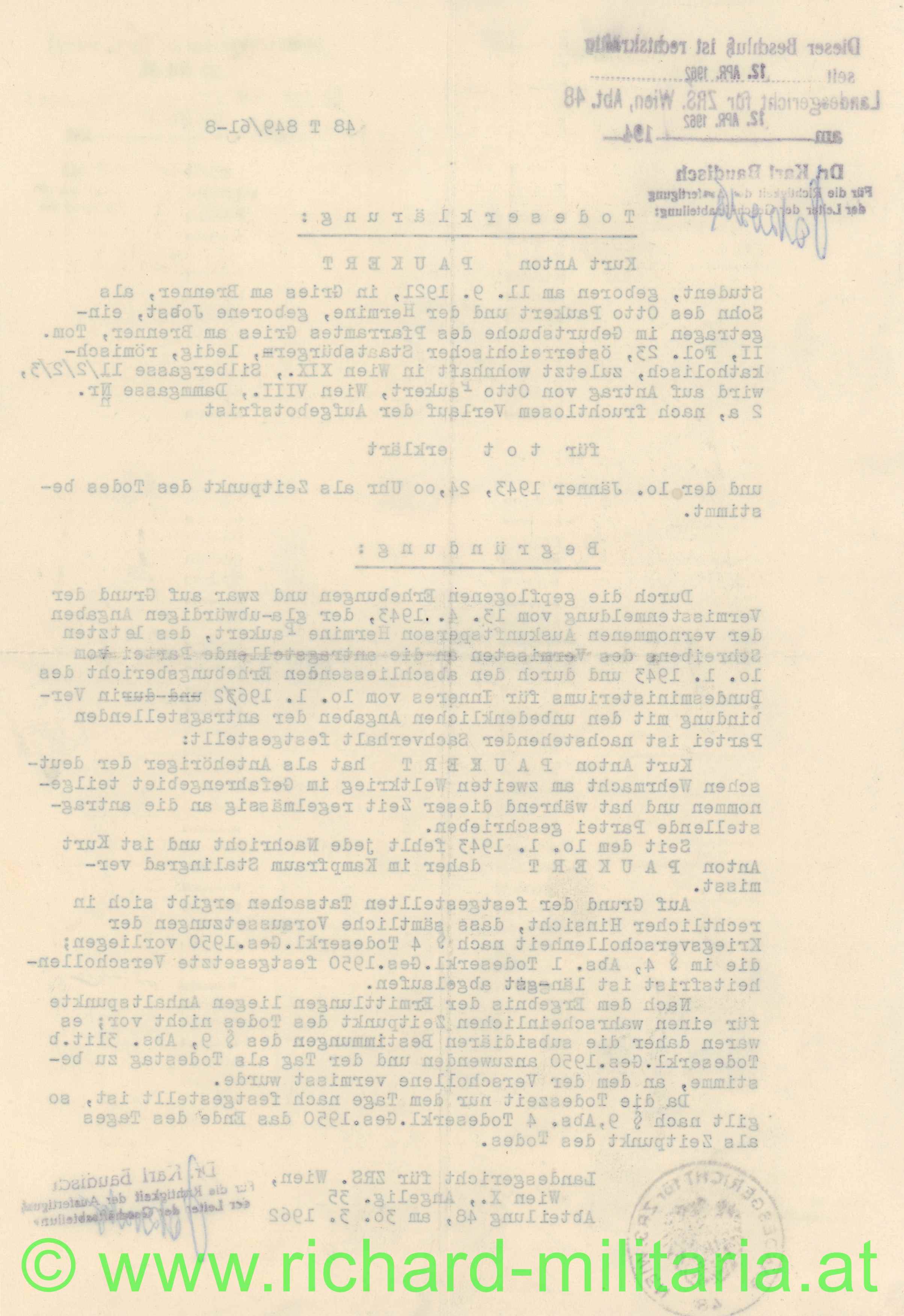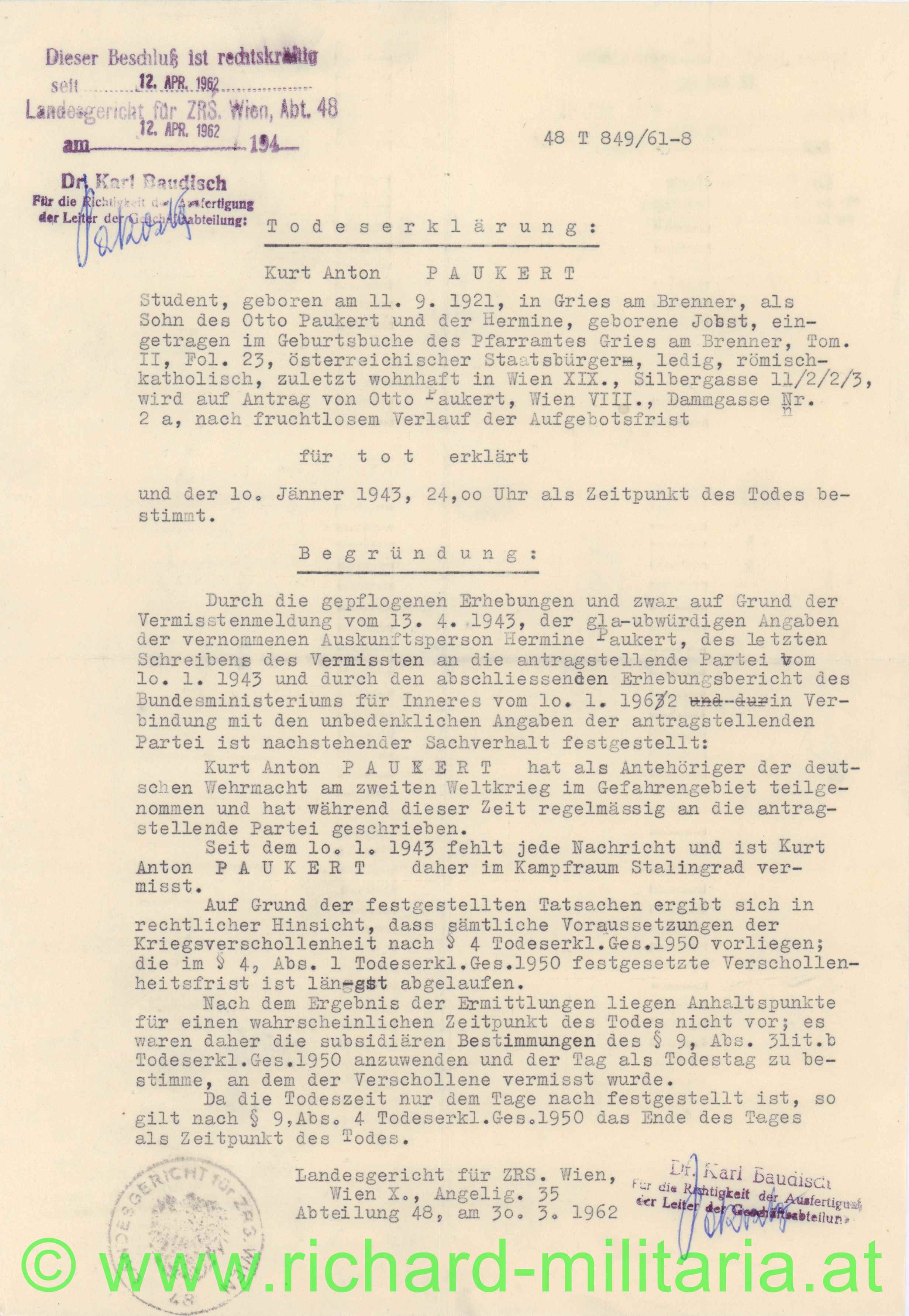 Todeserklärung und letzter Brief des Wehrmacht Soldaten Kurt Anton Paukert von 1962, vermisst seit 10.1.1943 in Stalingrad, sehr guter Zustand