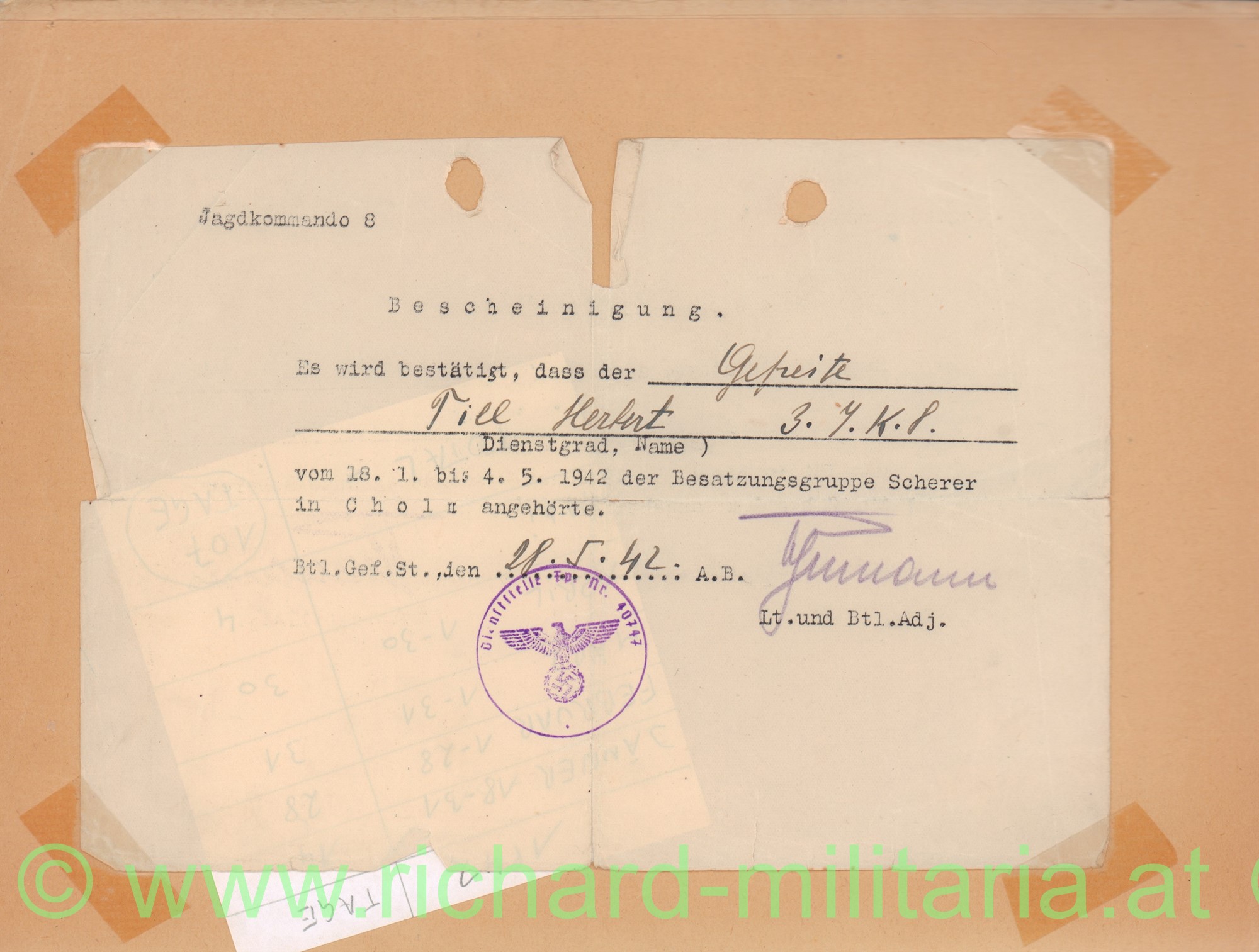 - Bescheinigung über die Zugehörigkeit vom 18.1. bis 4.5.42 zur Besatzungsgruppe Scherer in CHOLM als Gefreiter 3./ Jagdkommando 8; gefaltet, gelocht, eingerissen