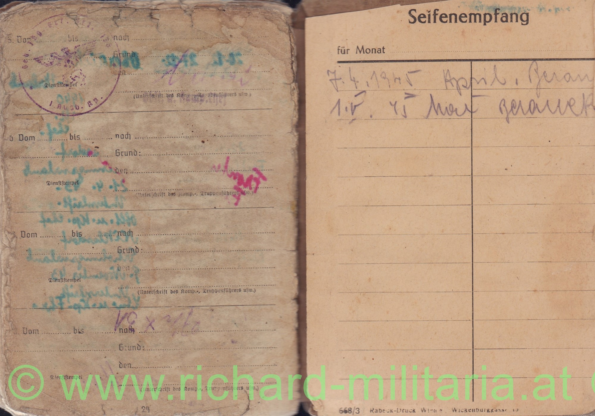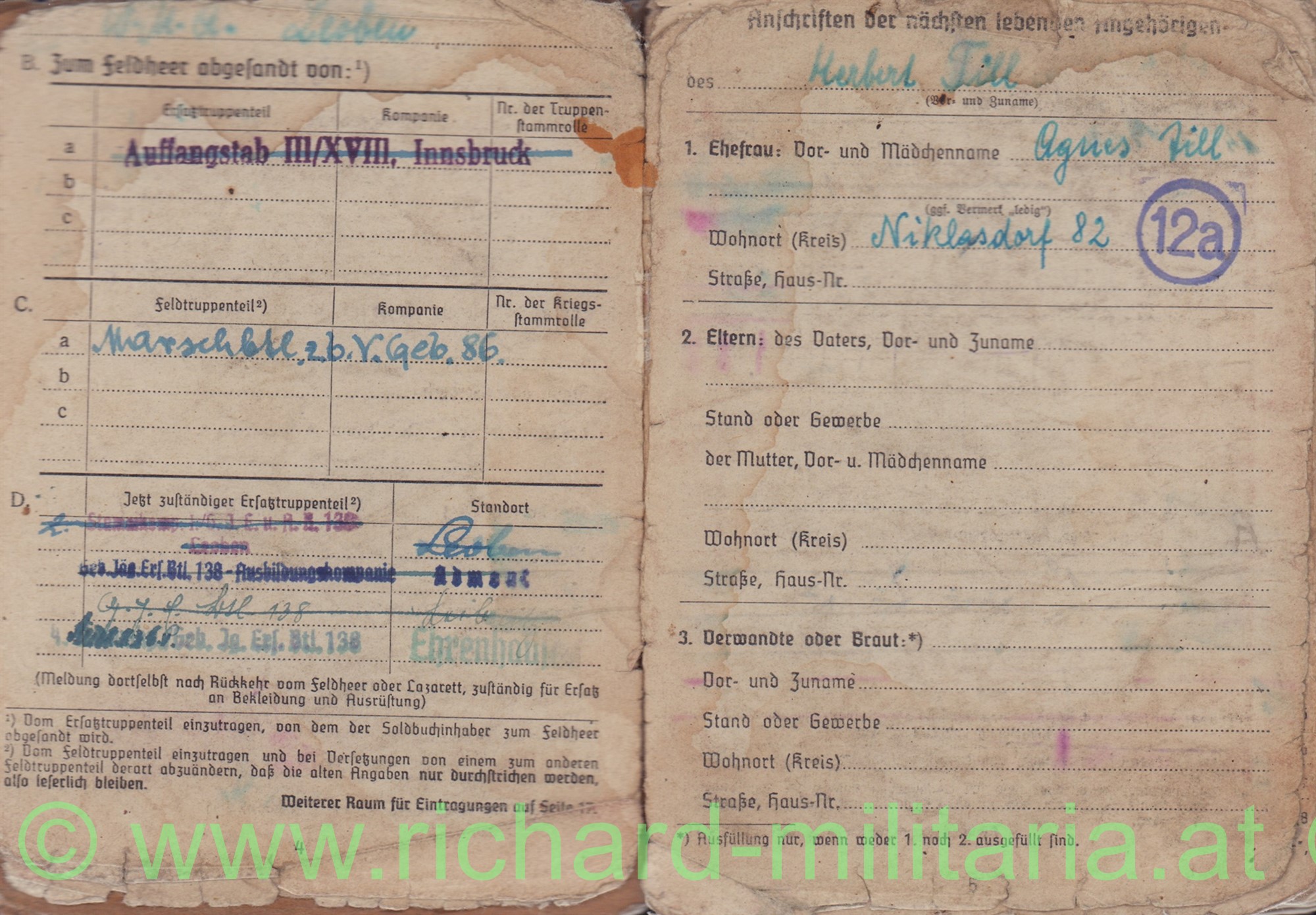 Soldbuch: komplett mit allen Eintragungen und Foto; ausgestellt für 3./JagdKdo 8; 14. Dezember 1943; vollständig mit allen Seiten; Till stammt aus Leoben/Obersteiermark; typische Trage- und Feuchtigkeitsspuren; auf Seite 22 eingetragene Auszeichnungen: