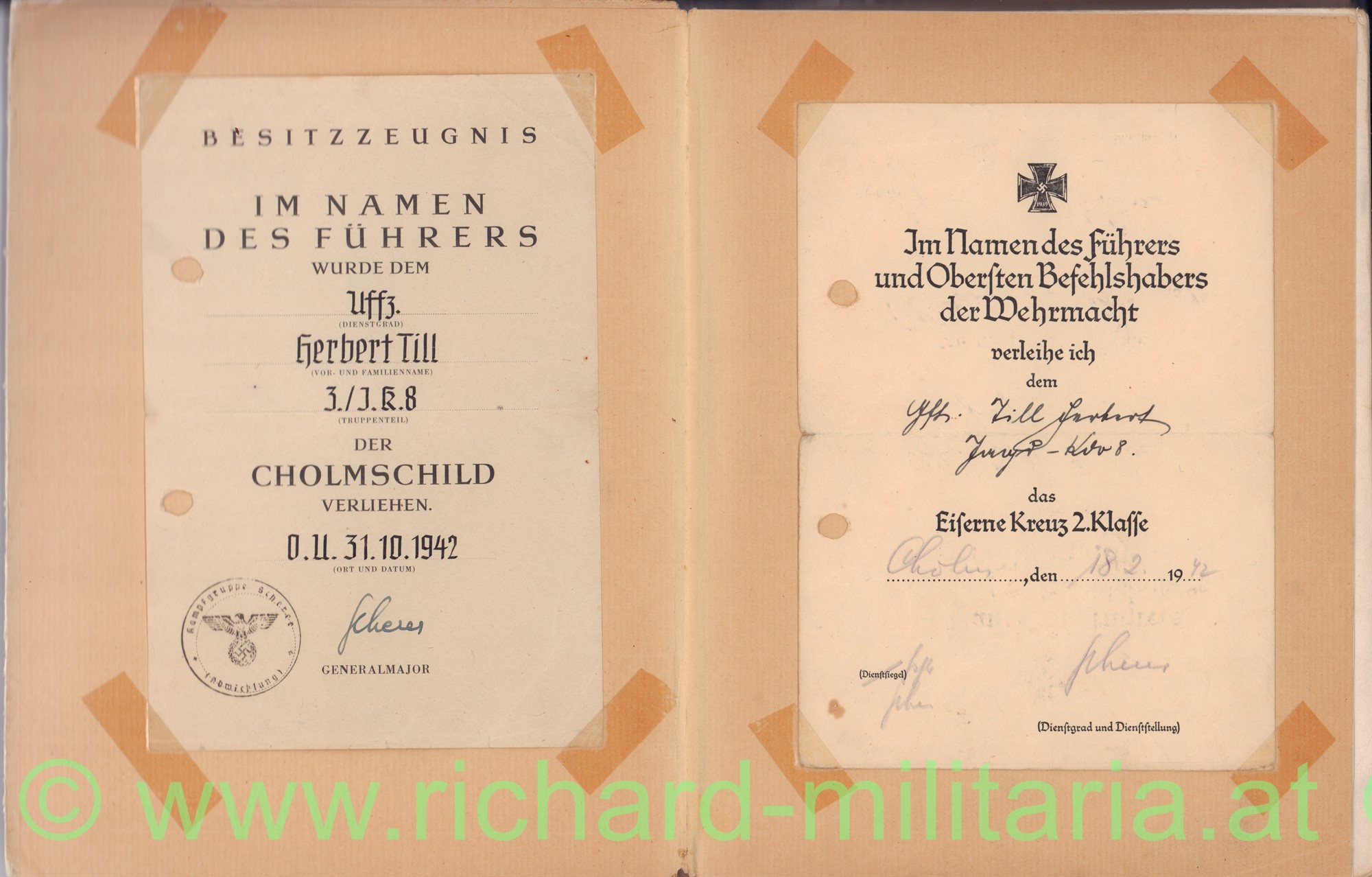 - Eisernes Kreuz II. Klasse - händisch persönlich ausgefüllt von Generalmajor Scherer (!!!) - Ort (CHOLM) und Datum (18.2.42) sowie Unterschrift "SCHERER" sind mit dem gleichen Bleistift und der gleichen Handschrift erstellt!; gelocht