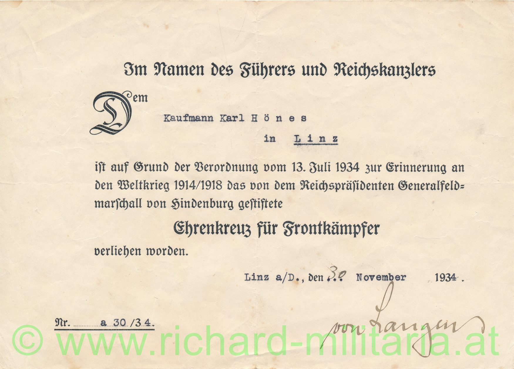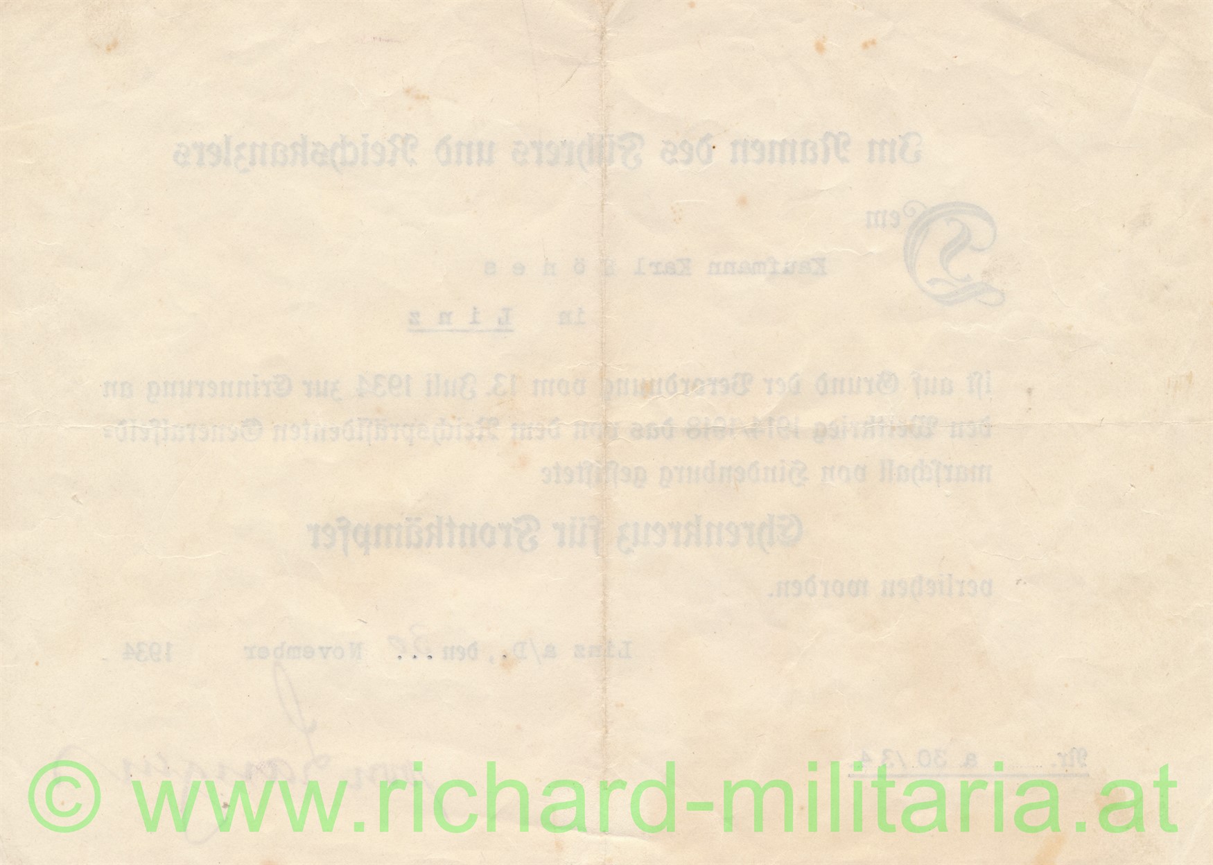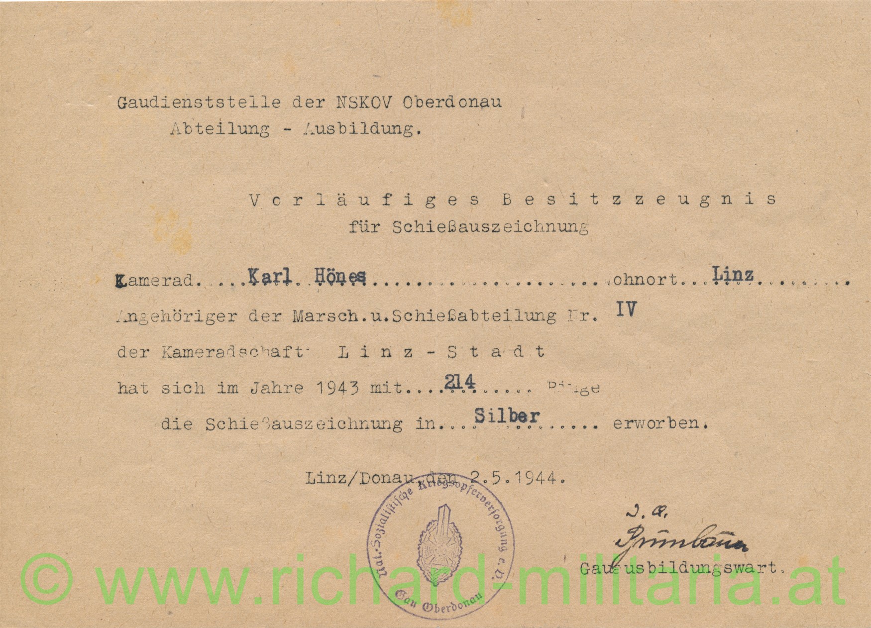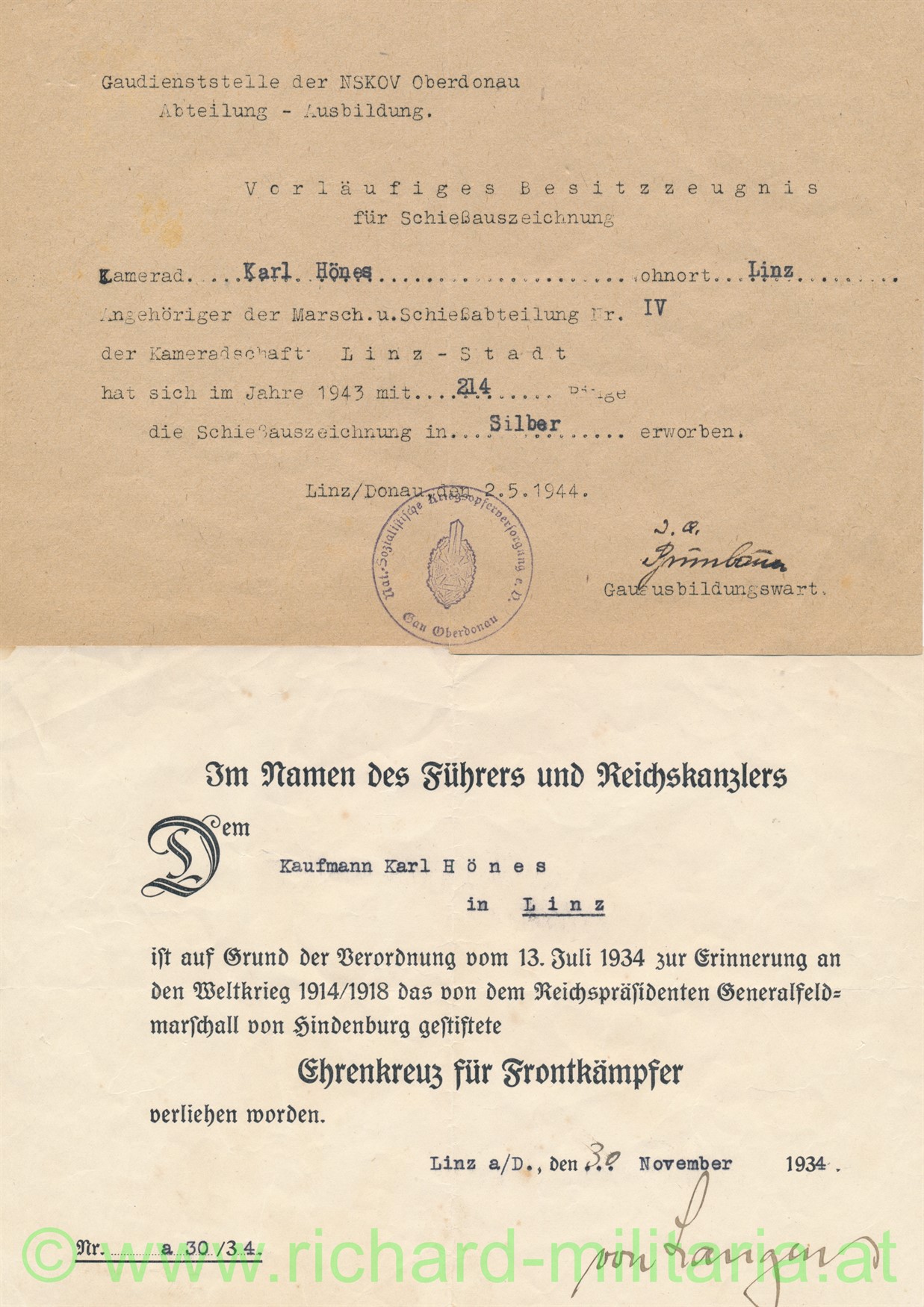 Vorläufiges Besitzzeugnis für Schießauszeichnung in Silber des NSKOV, ausgestellt Linz/Donau 2.5.1944; Format A5 und dazu die Urkunde für das Ehrenkreuz für Frontkämpfer; 30.11.1934; beides für Karl Hönes aus Linz