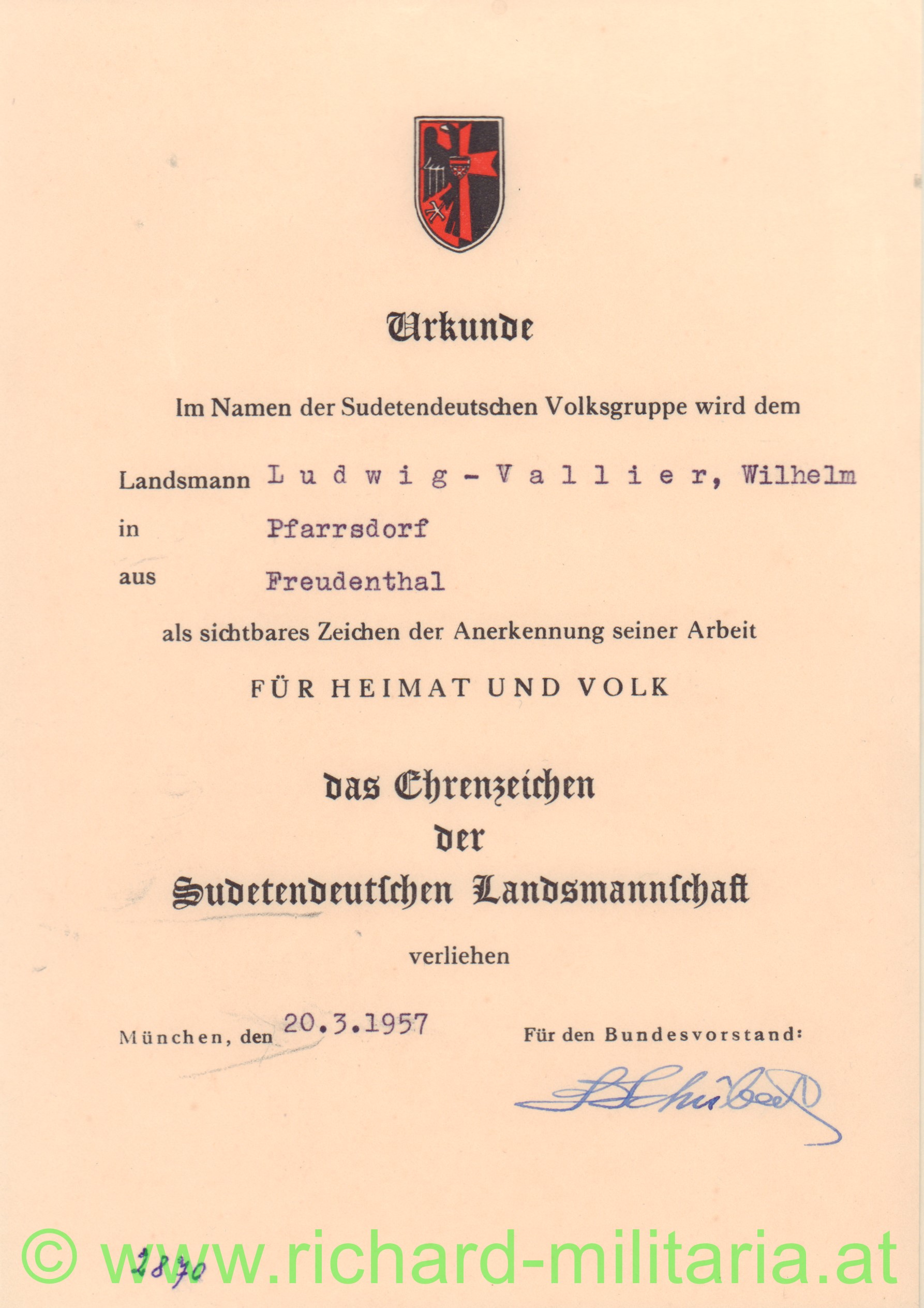 Produktinformationen "Verleihungsurkunde - Ehrenzeichen der Sudetendeutschen Landsmannschaft"