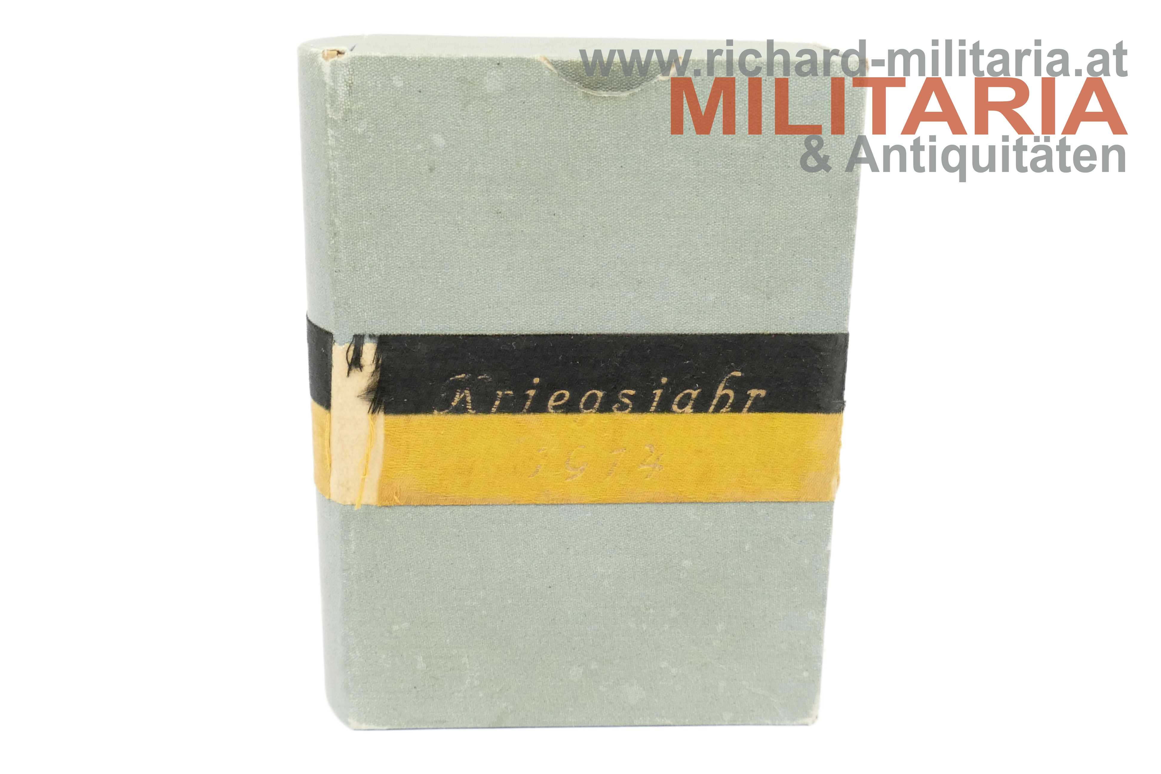 Verpackungsschuber in Buchform mit umlaufenden schwarz/gelben Seidenband mit Aufdruck "Kriegsjahr 1914"; Format ca. 15,3 x 11,5 x 4,3 cm
