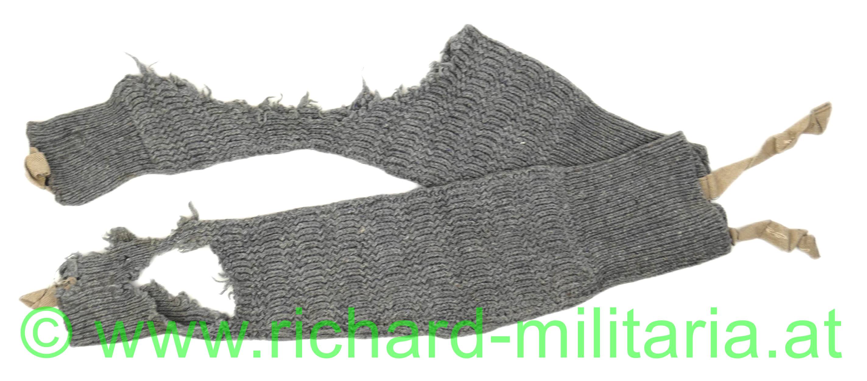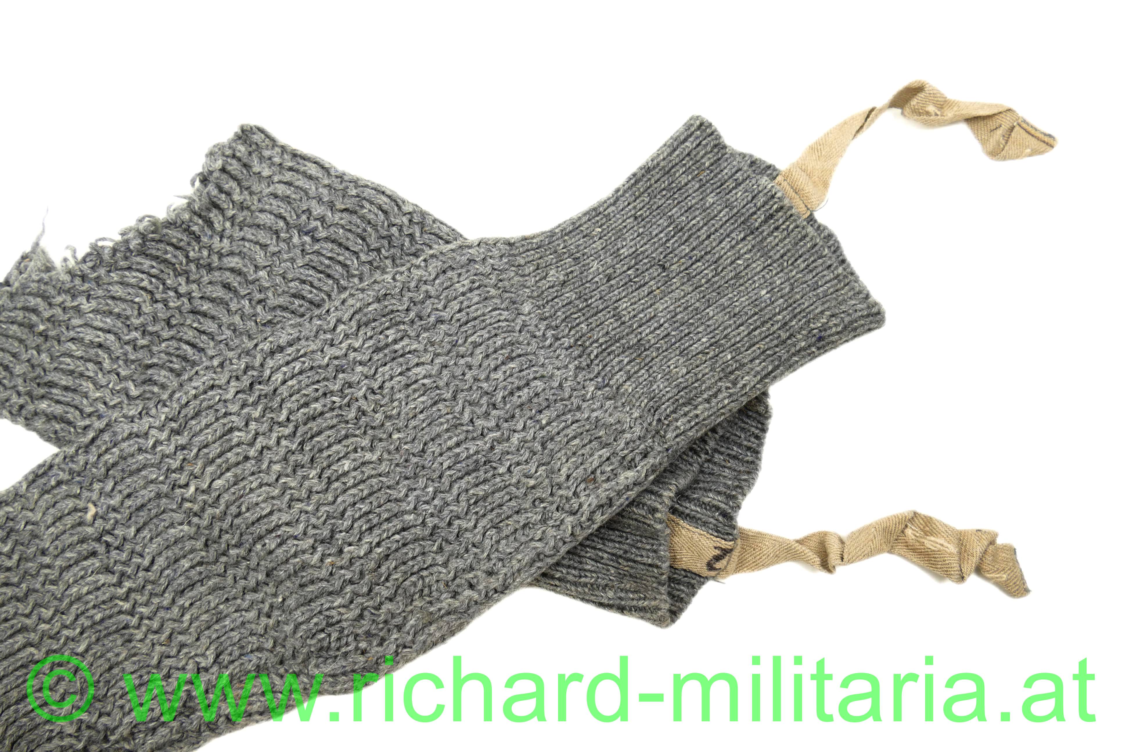 Wadenstutzen für k.k. Landwehrgebirgsstruppen; zusammengehöriges Paar; graue gestrickte Wolle, mit Schlaufe für die Fersenbefestigung und Schlaufe zum Anknöpfen an die Hose - Größenstempel "2", beide Stutzen mit stärkeren Beschädigungen - siehe Fotos!