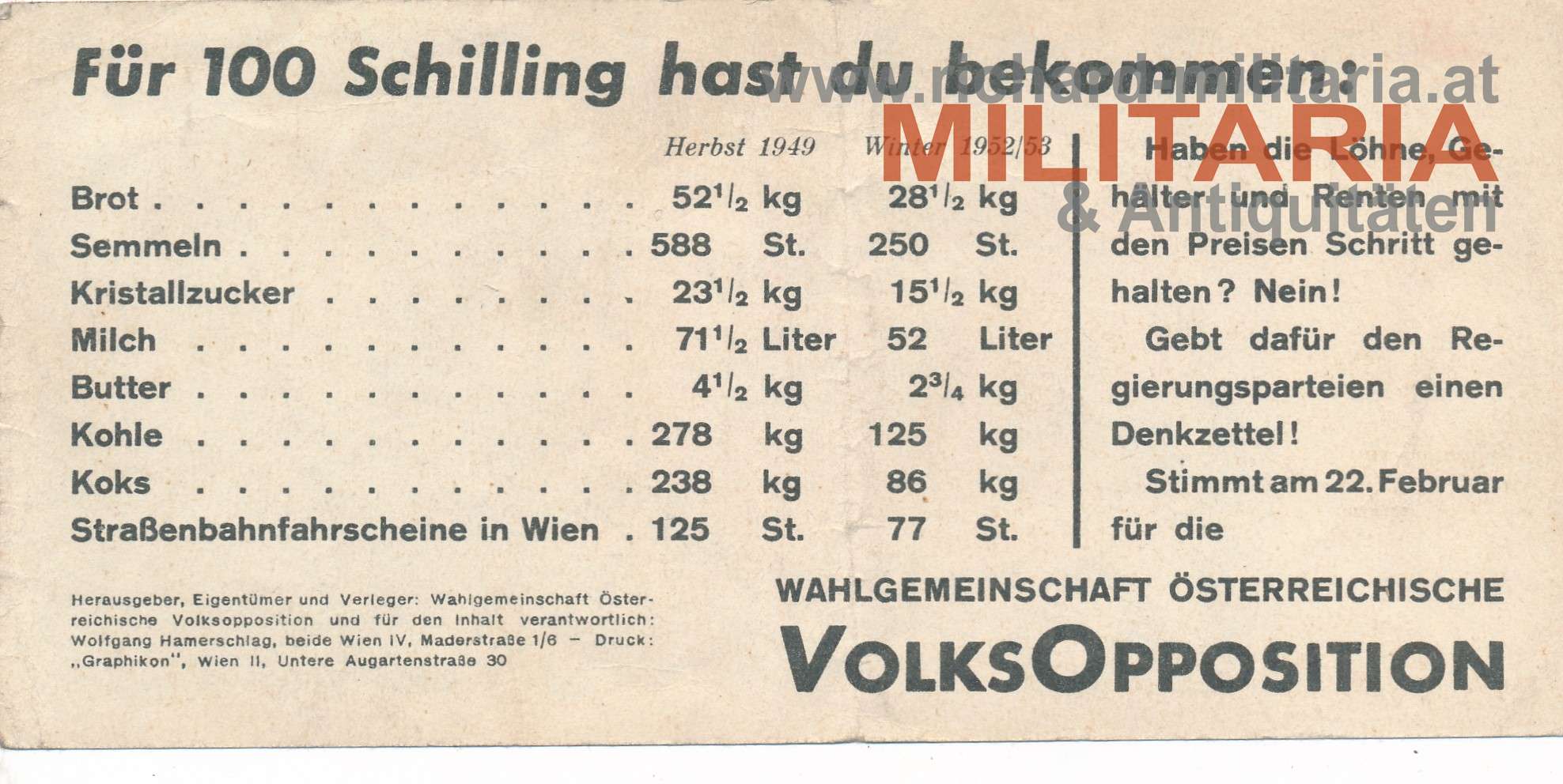 Wahlwerbung der Volksopposition Nationalratswahl 1953; die Wahlgemeinschaft der Volksopposition bestand aus KPÖ, Sozialistischer Arbeiterpartei und Demokratischer Union; in ähnlicher Form eines 100 Schilling Scheines; rückseitig aufgelistet wieviel man "früher" für 100 Schilling bekommen hat;