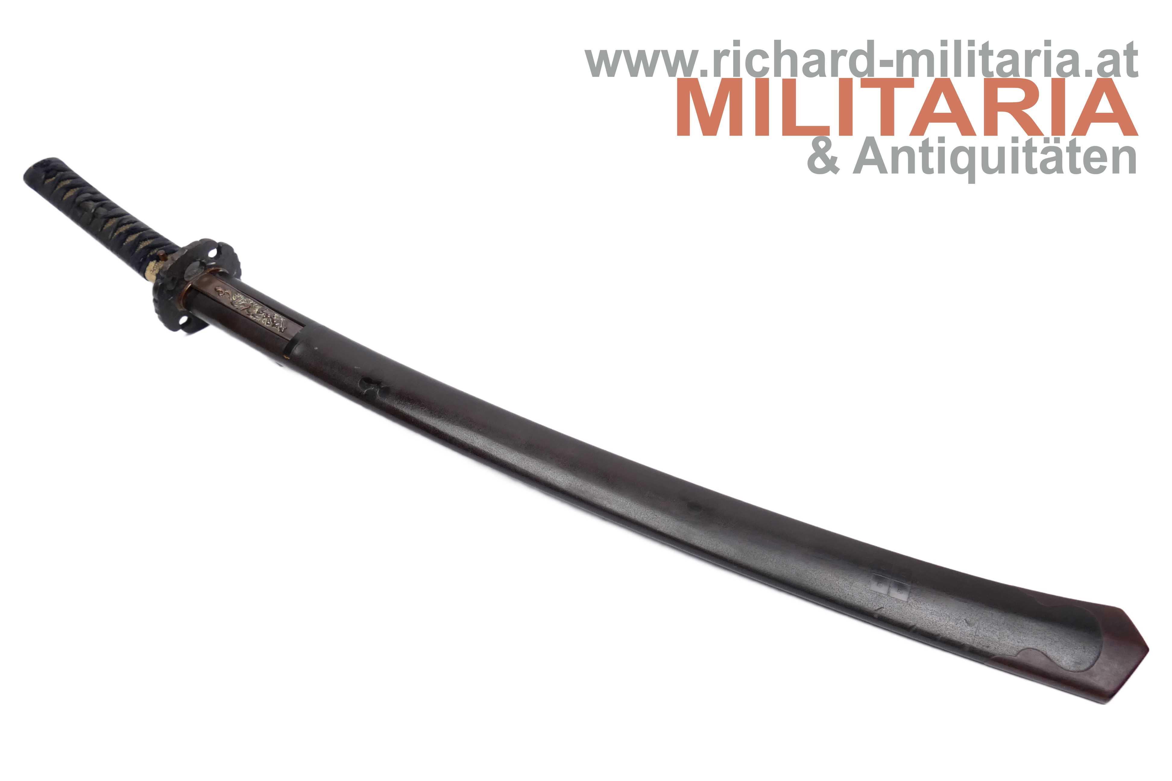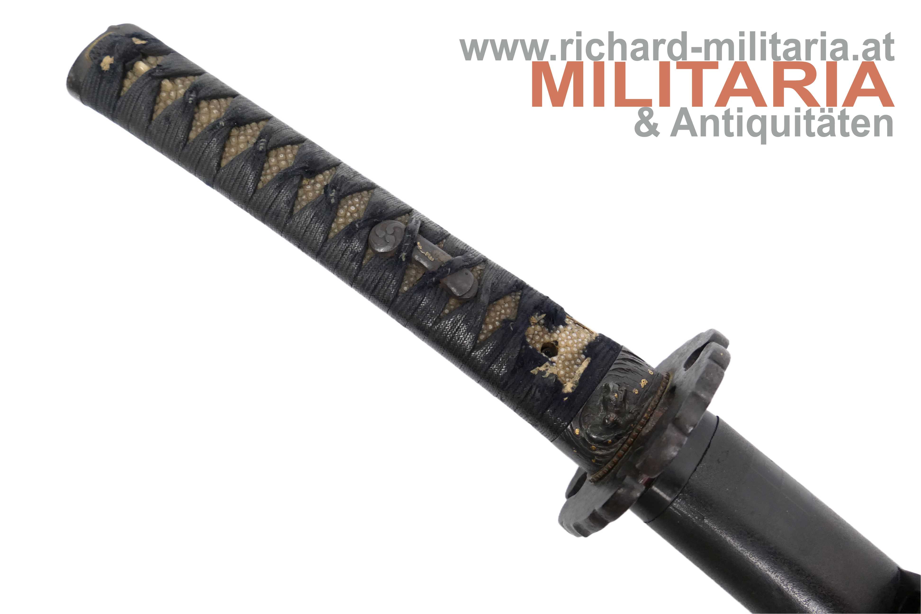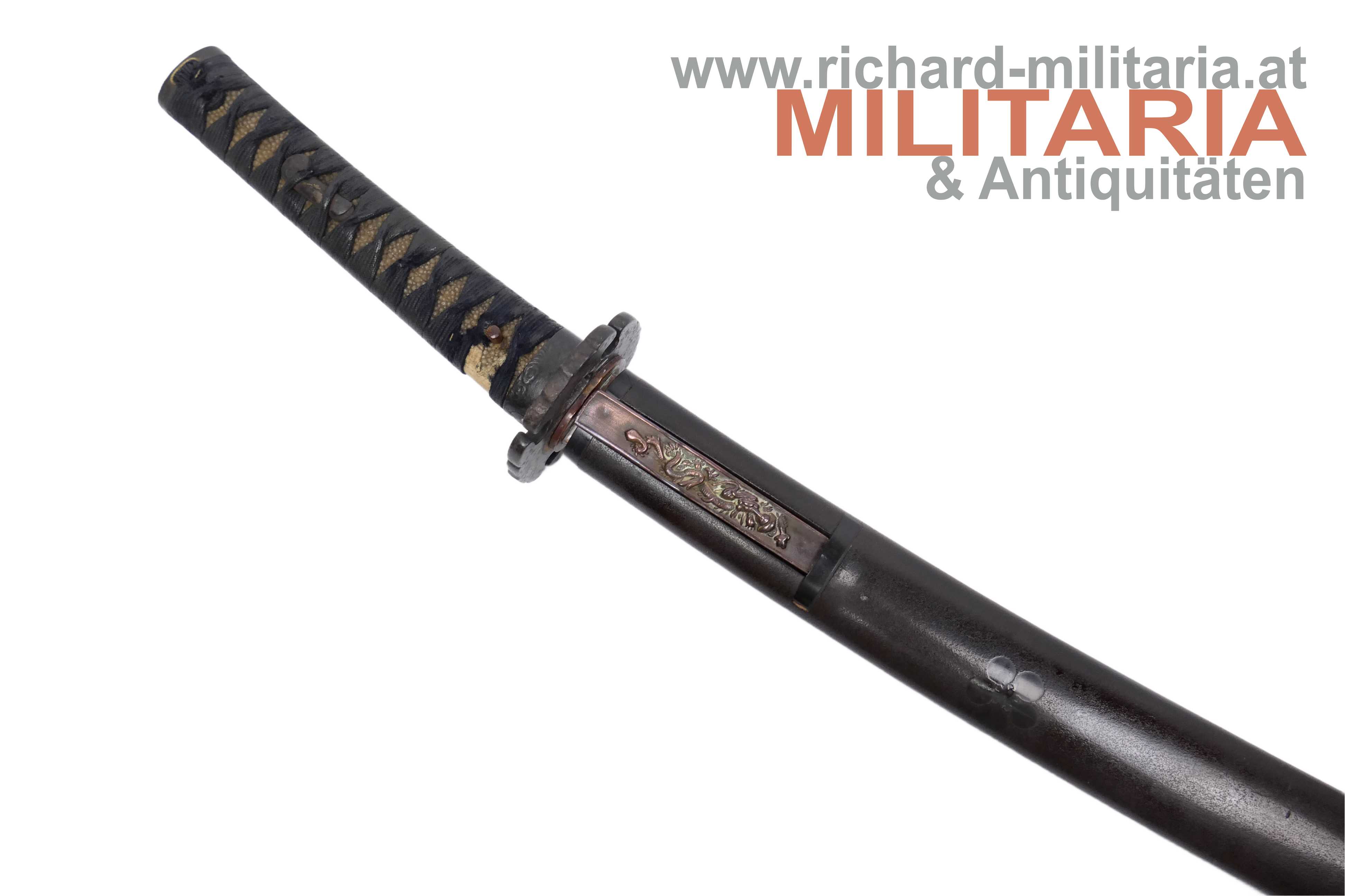 Hōshū Takada-jū Taira Shigeyuki; tsuka-maki mit ito aus schwarzem Baumwoll-Band (im unteren Teil kleine Fehlstelle auf Höhe der mekugi-ana) über heller same-gawa; fuchi und kashira aus Eisen mit Drachendarstellungen und GOLD-Einlagen; 2 menuki aus Eisen mit Wappen und Goldeinlage; bronzene habaki; 2 seppa; eiserne tsuba in massiver Ausführung; dunkelbraune saya mit Blütendekor und quadratischen Mustern; saya zur Spitze hin sich verbreiternd mit hölzenem ishizuki; kurigata aus schwarzem Bein; signiertes kozuka mit Messinggriff mit Darstellung eines Drachen;