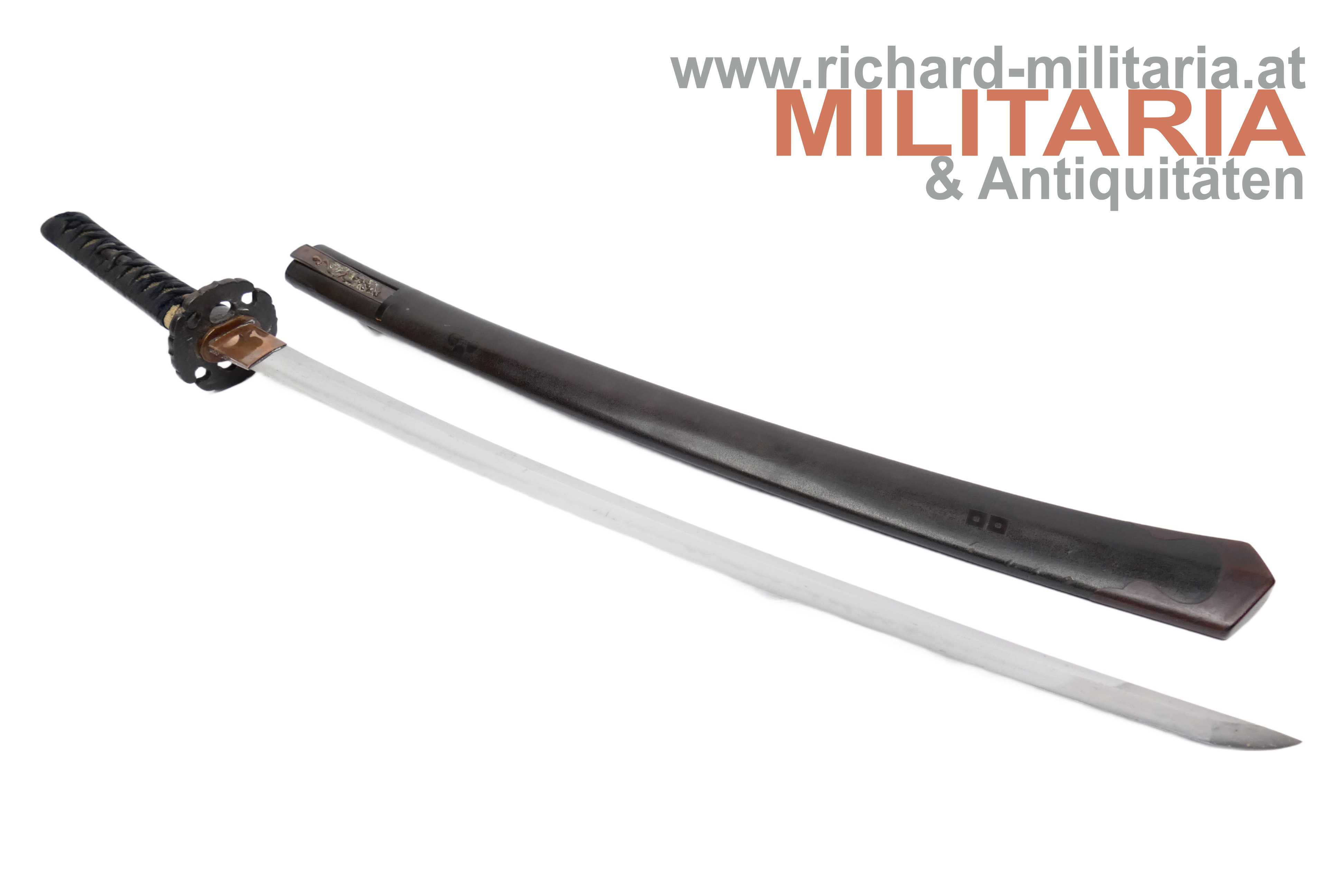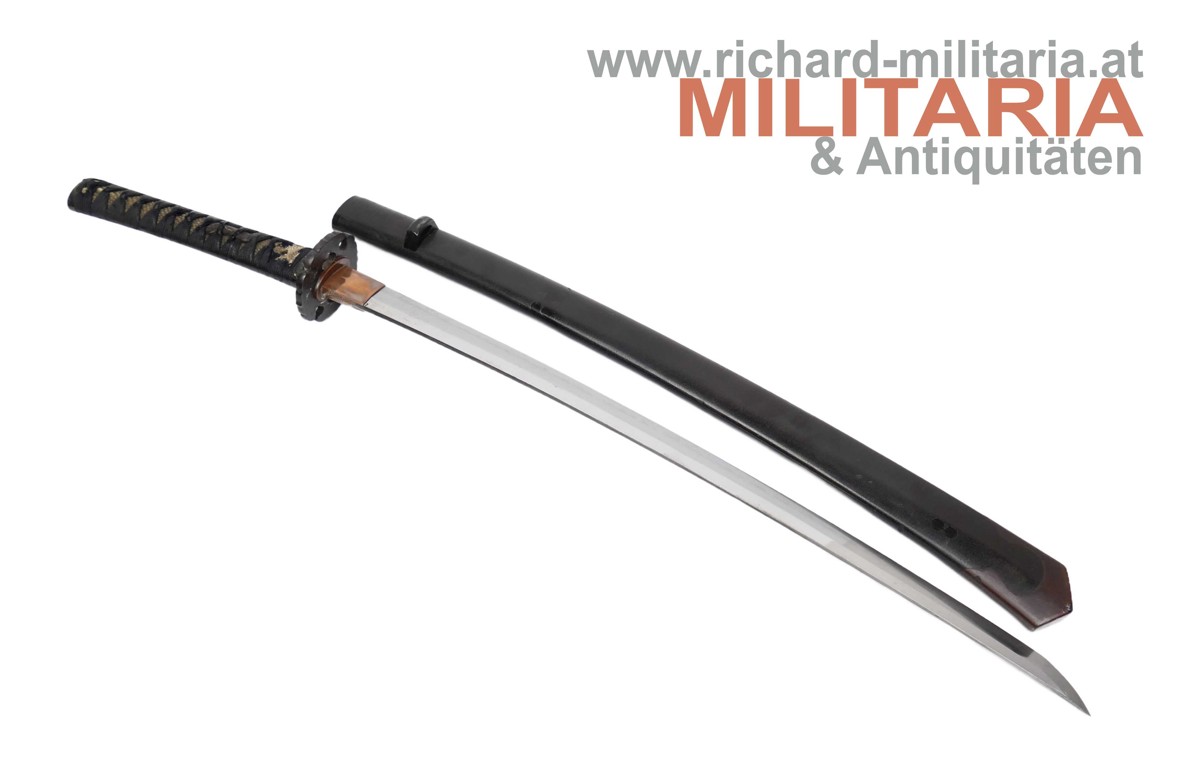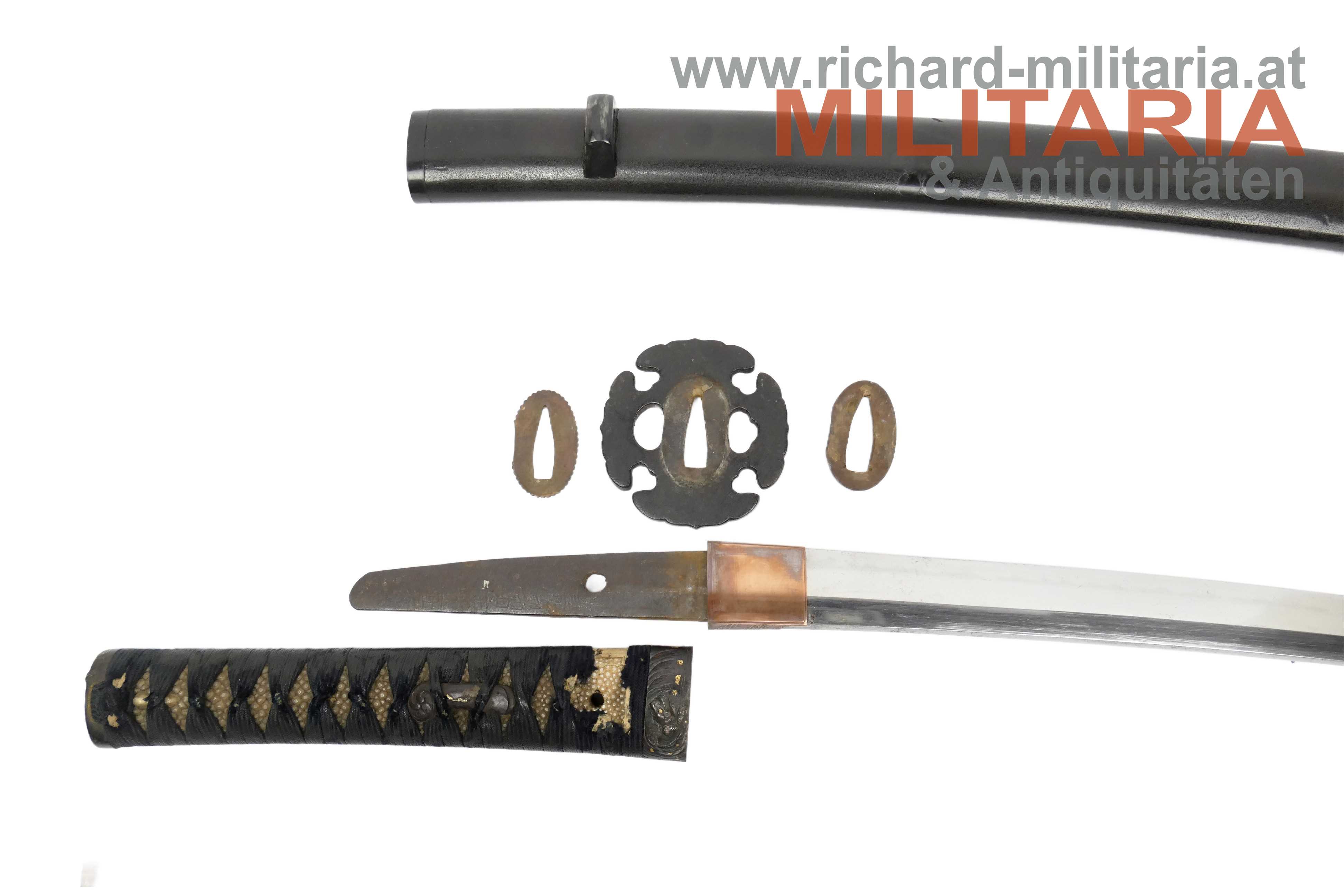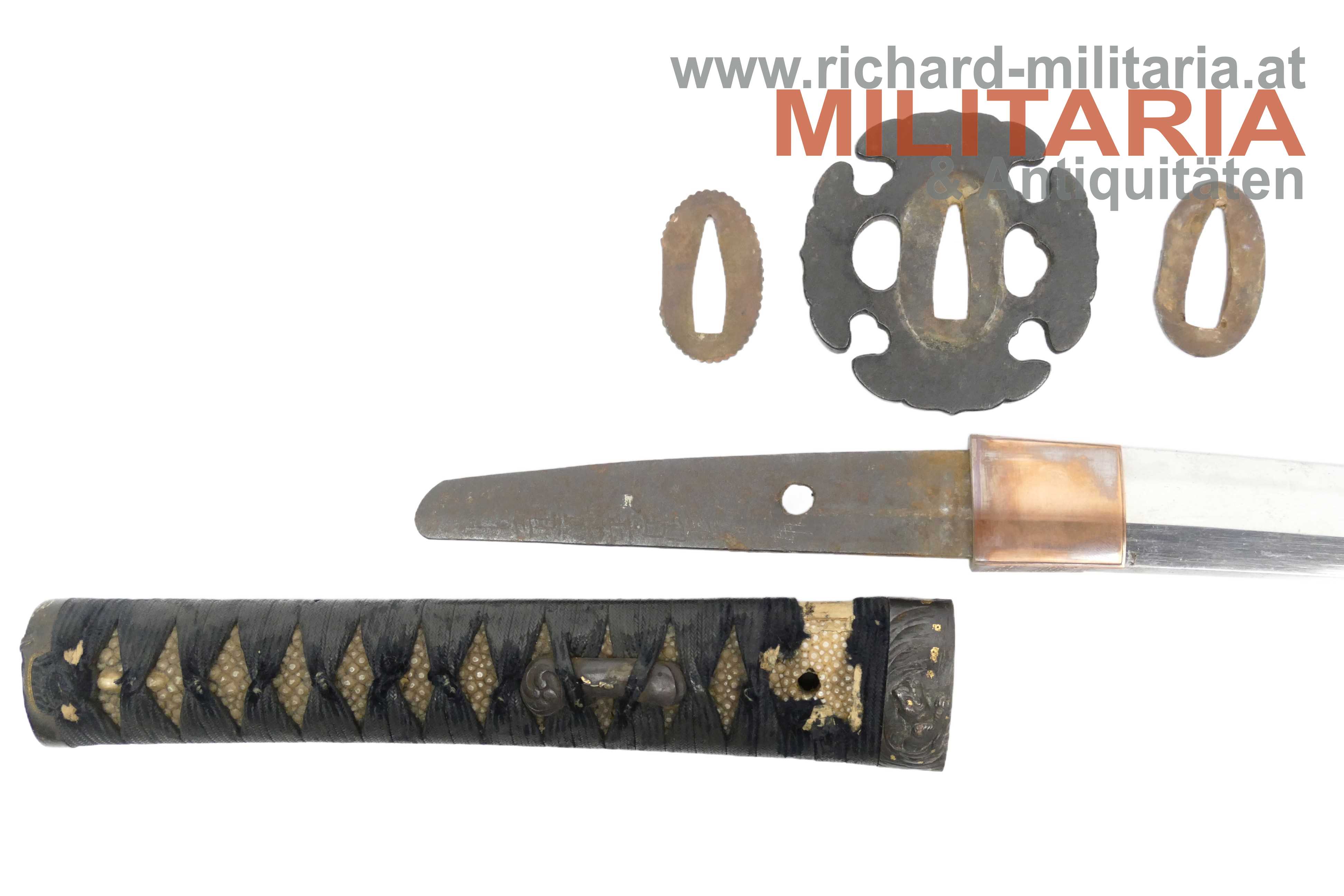 Japan - Wakizashi in koshirae; Muromachi - Periode; sehr schöne handgeschmiedete Klinge mit schön sichtbarem hamon mit sehr schöner Politur (!); signierter nakago mit einem mekugi-ana; Signatur "