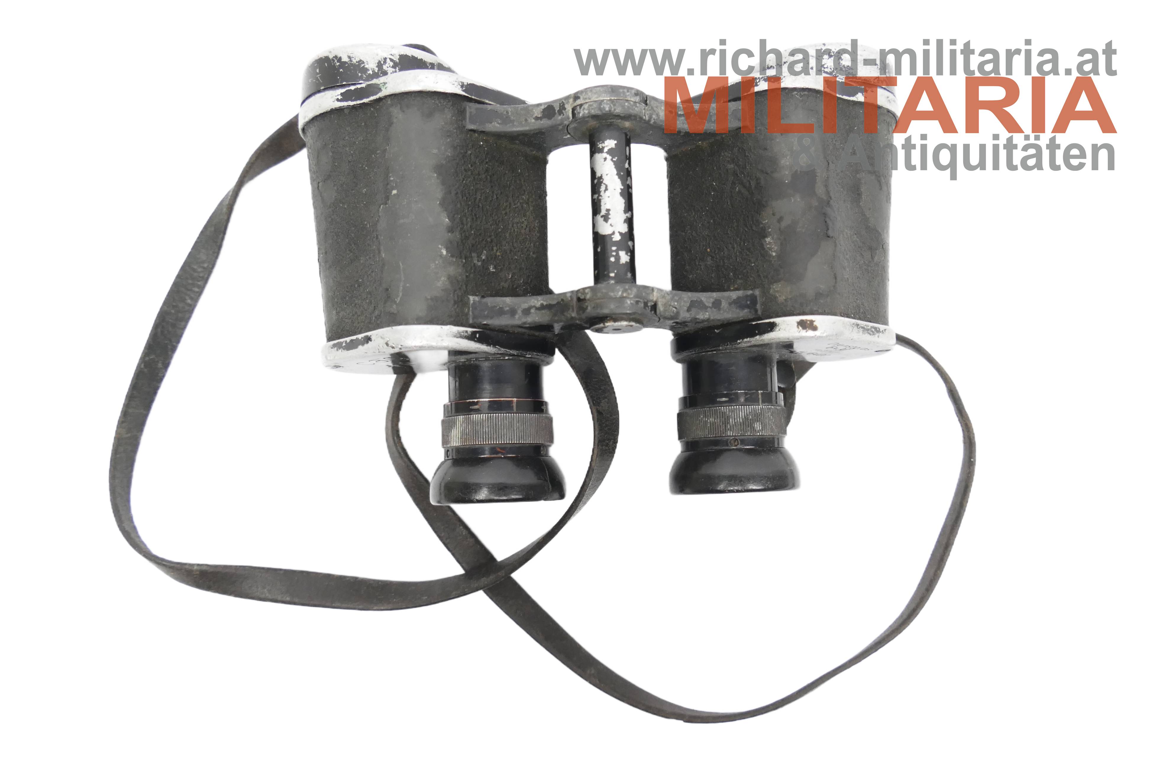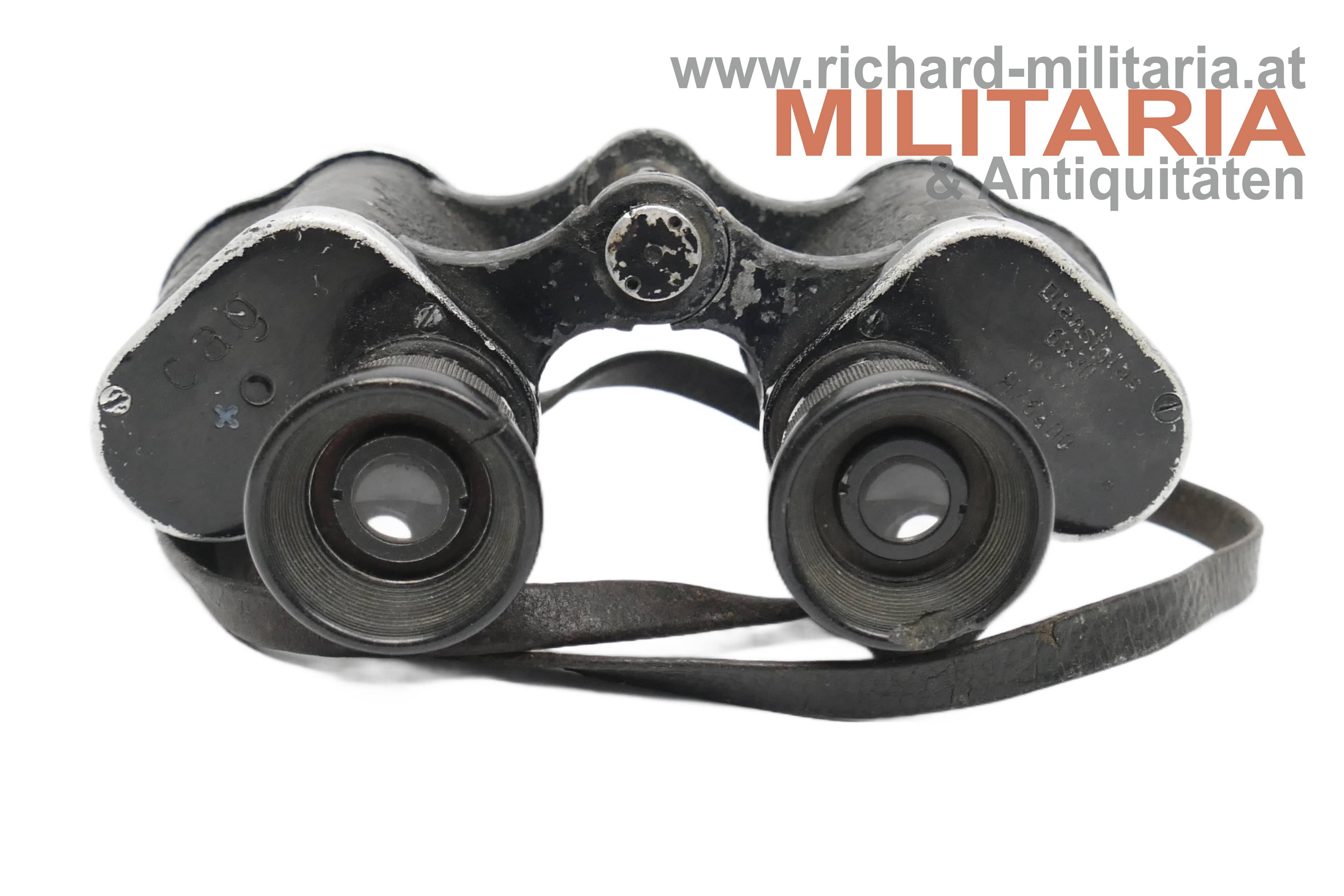 Wehrmacht Dienstglas 6x30; "cag +" = Swarovski; hellblaues "+"; markiert mit "H/6400" und "No 32496"; klare Optik mit Scala im rechten Glas; schwarzer Ledertrageriemen;