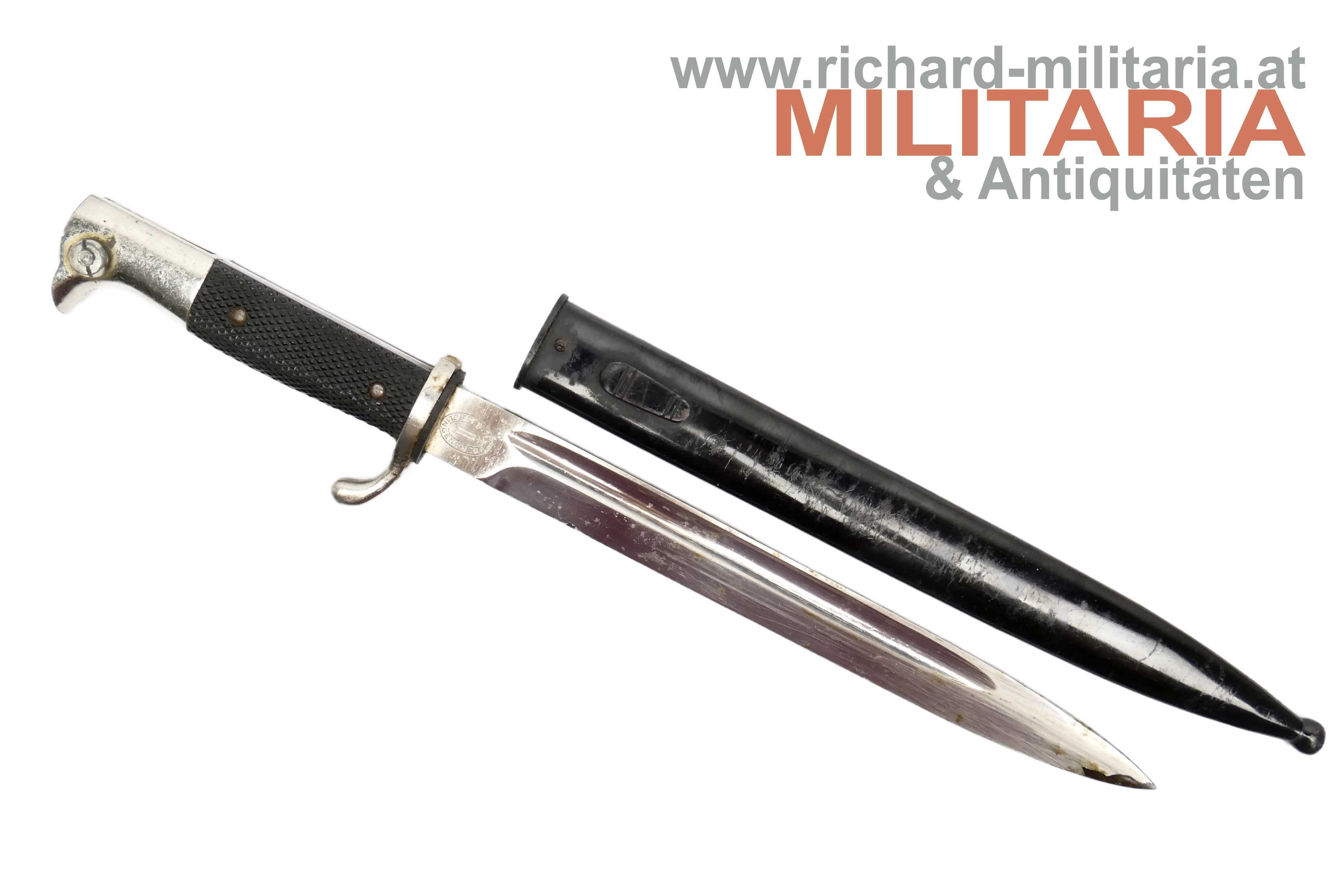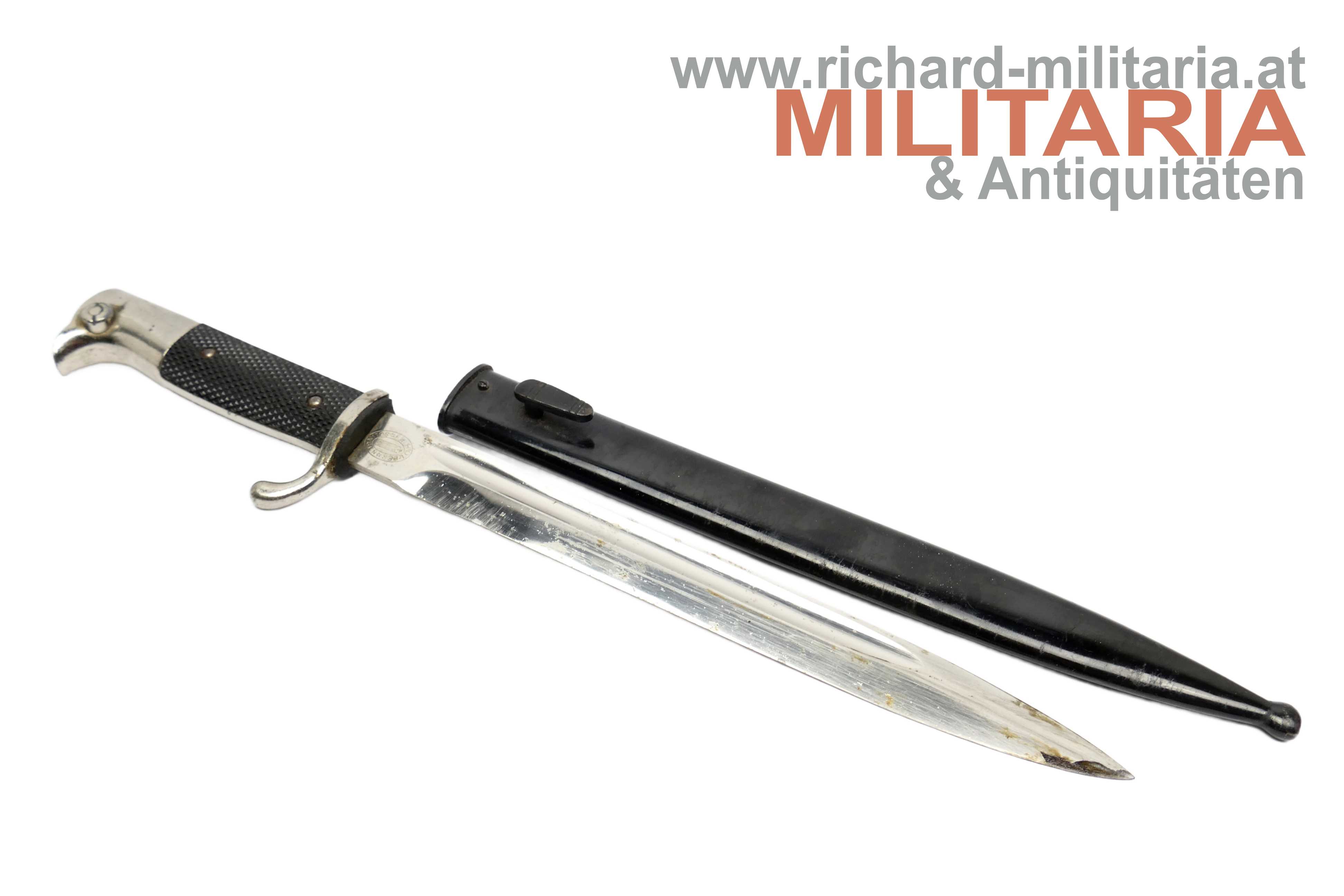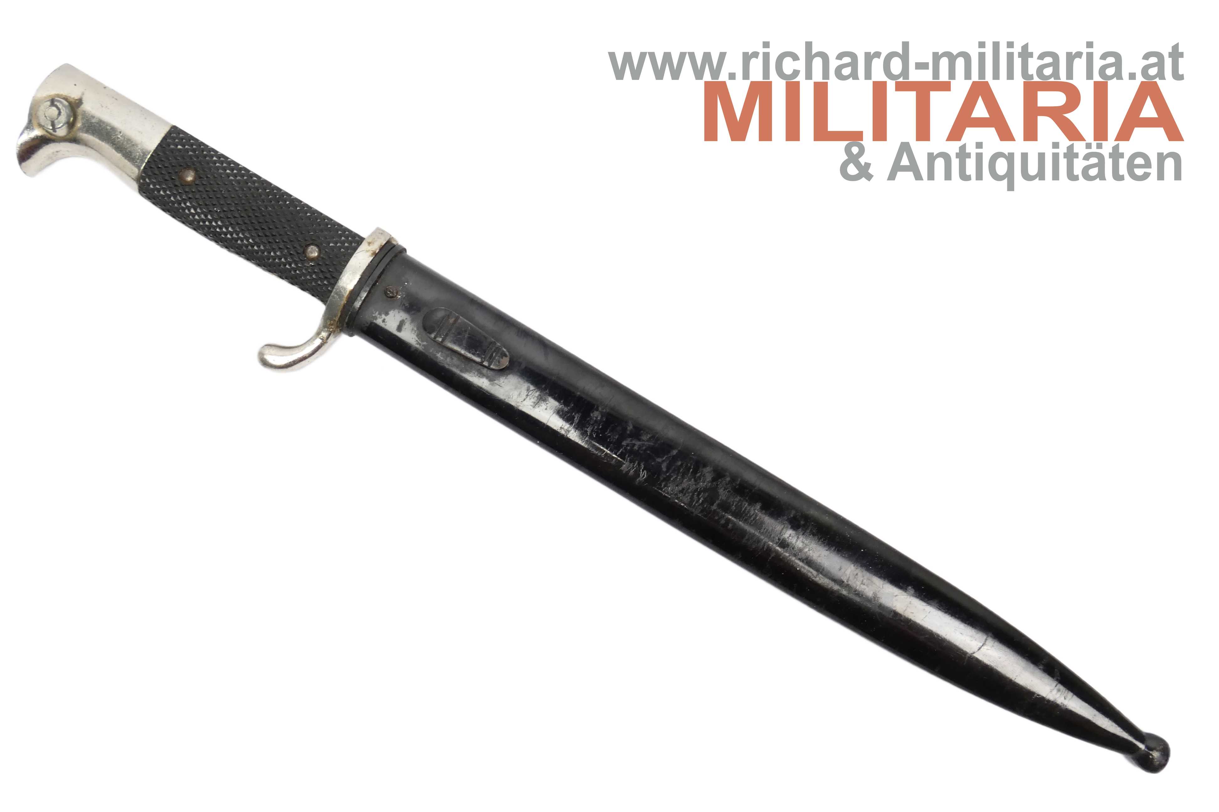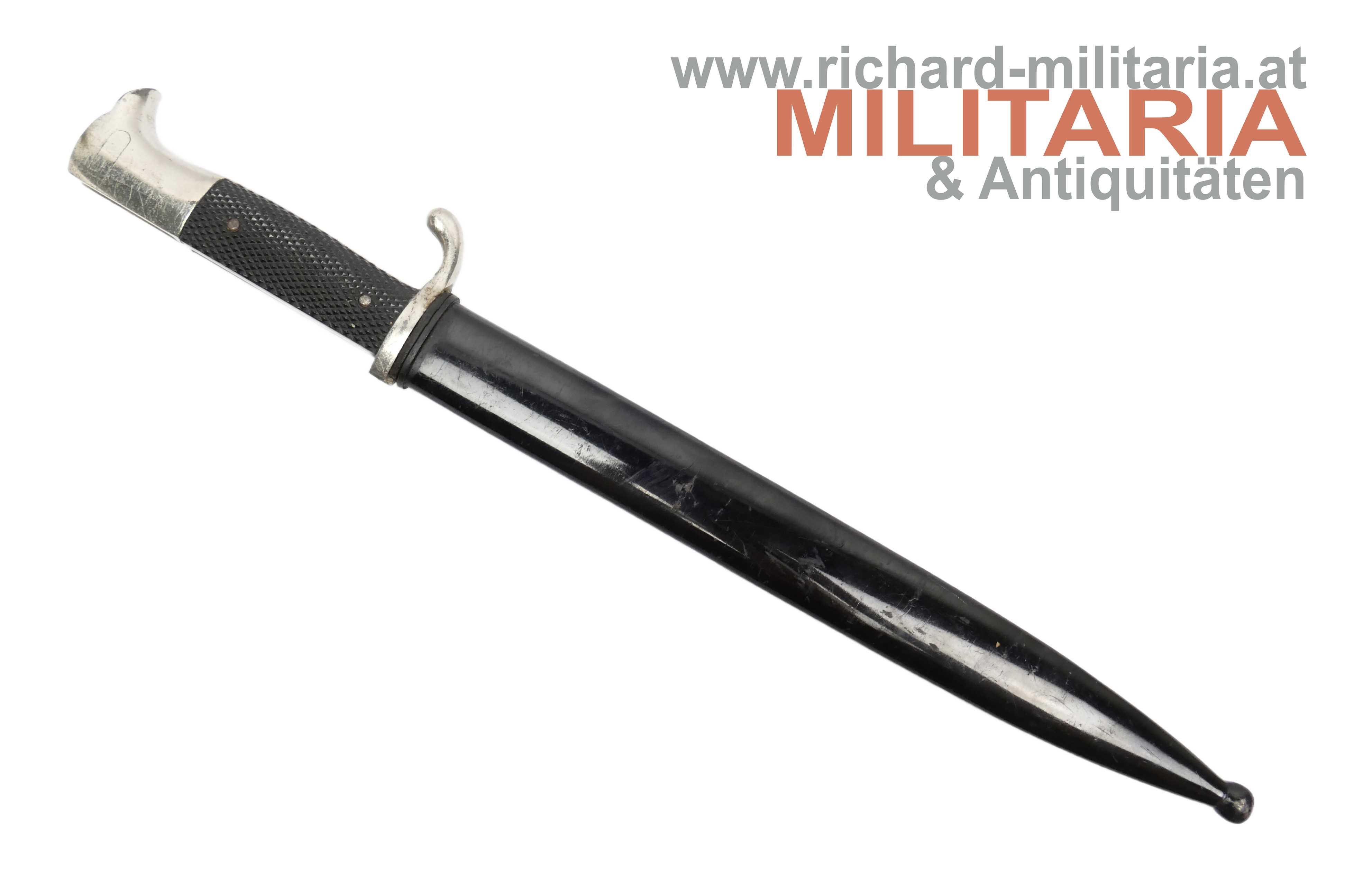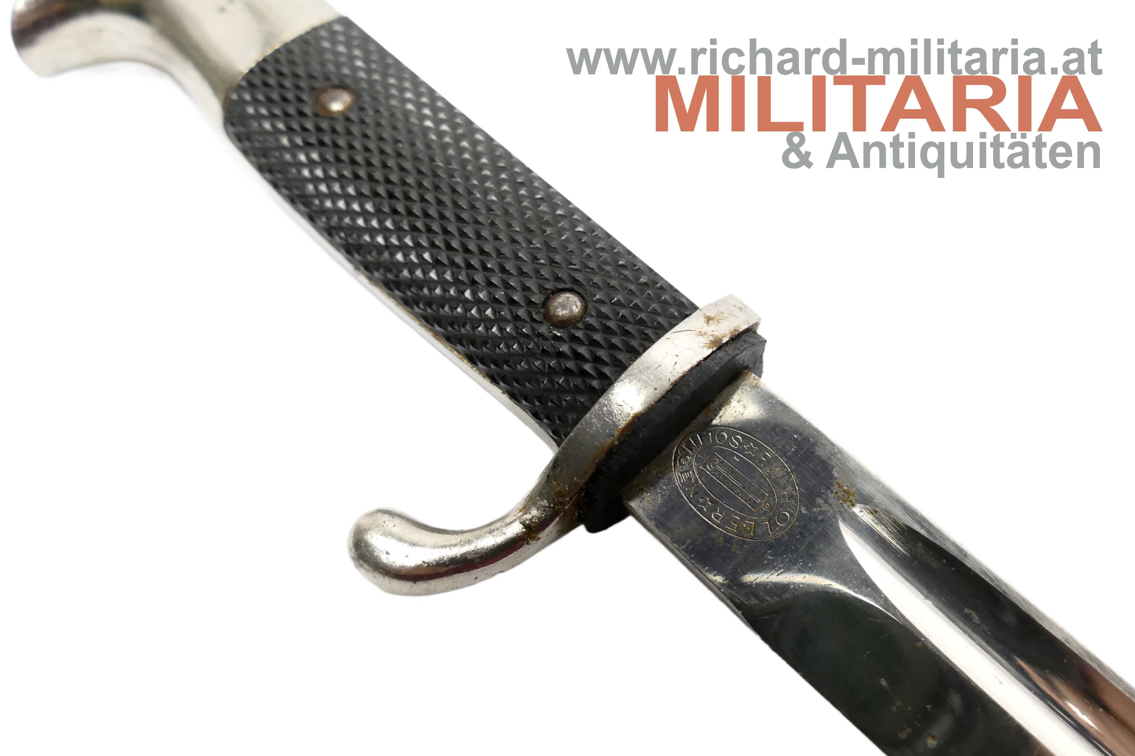 Wehrmacht ESG - lange Ausführung; Hersteller W. Höller; guter ungereinigter Zustand - auf der Klinge noch altes, gestocktes Waffenfett; originales Stoßleder; original lackierte Scheide
