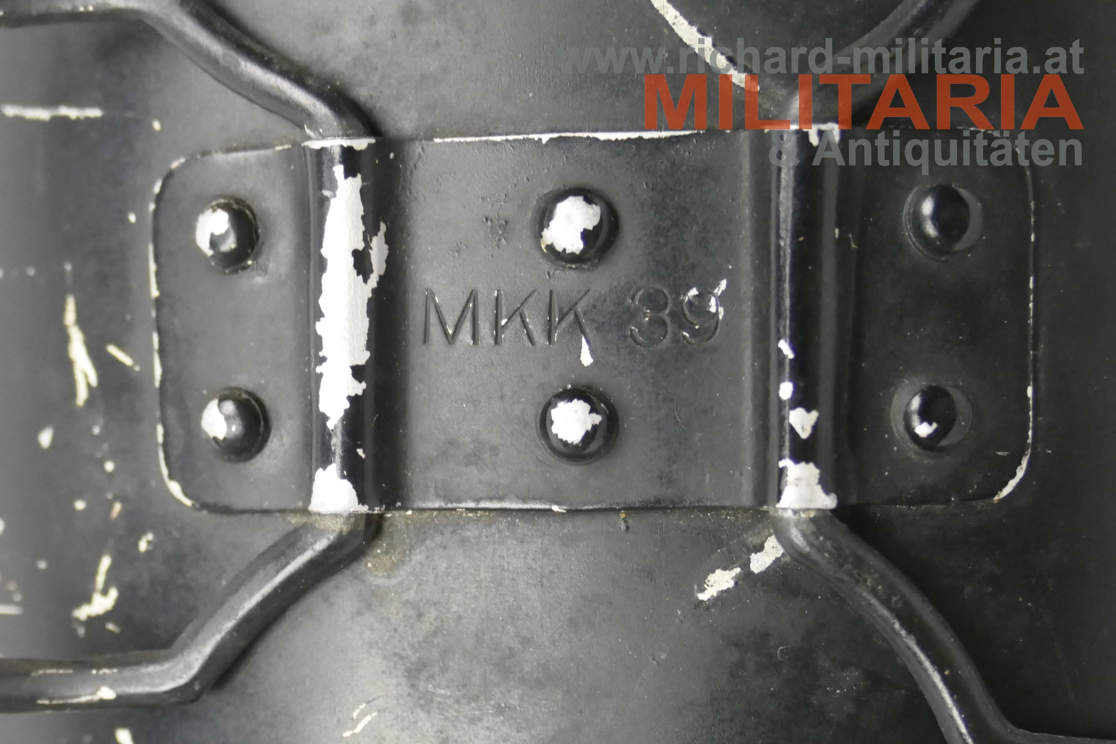 Wehrmacht Feldflasche M31 mit Trinkbecher - "FWBN38"; Aluminiumflasche mit braunem Filzbezug; am Flaschenhals und Stöpsel mit "FWBN38" gestempelt; Lederberiemung mit Karabiner vorhanden; Karabiner mit Herstellerstempel; Trinkbecher mit viel originaler Farbe gestempelt mit "MKK39";
