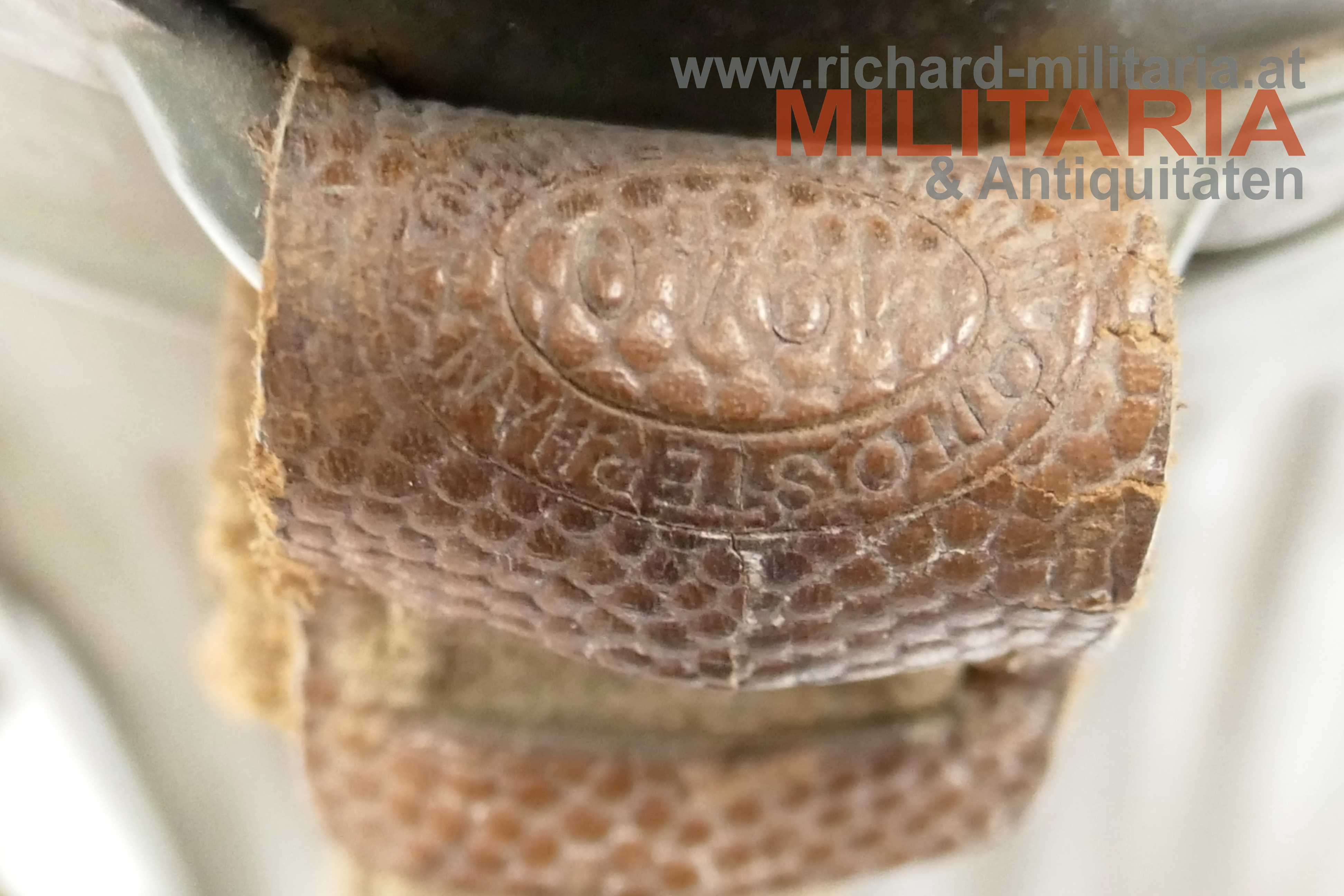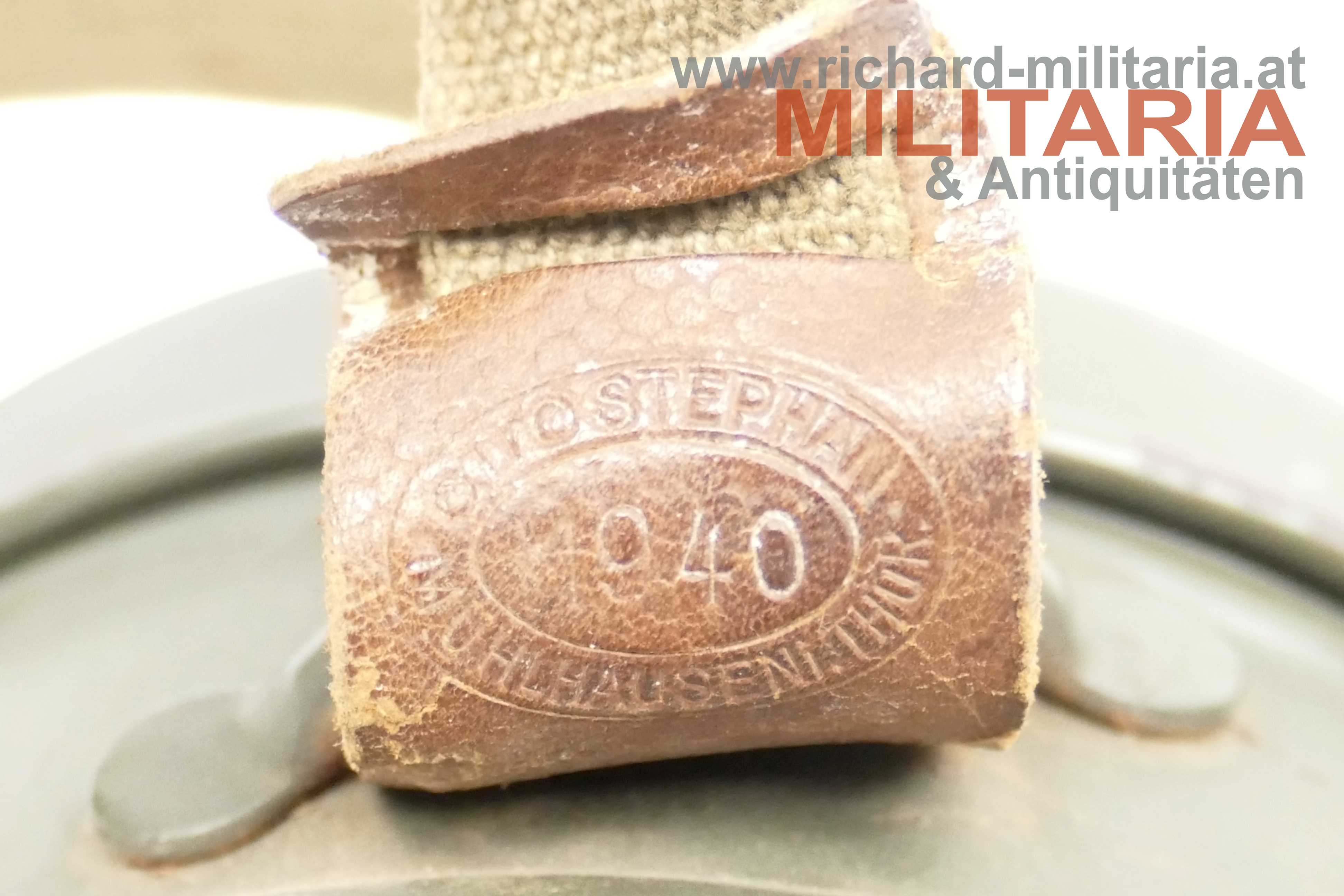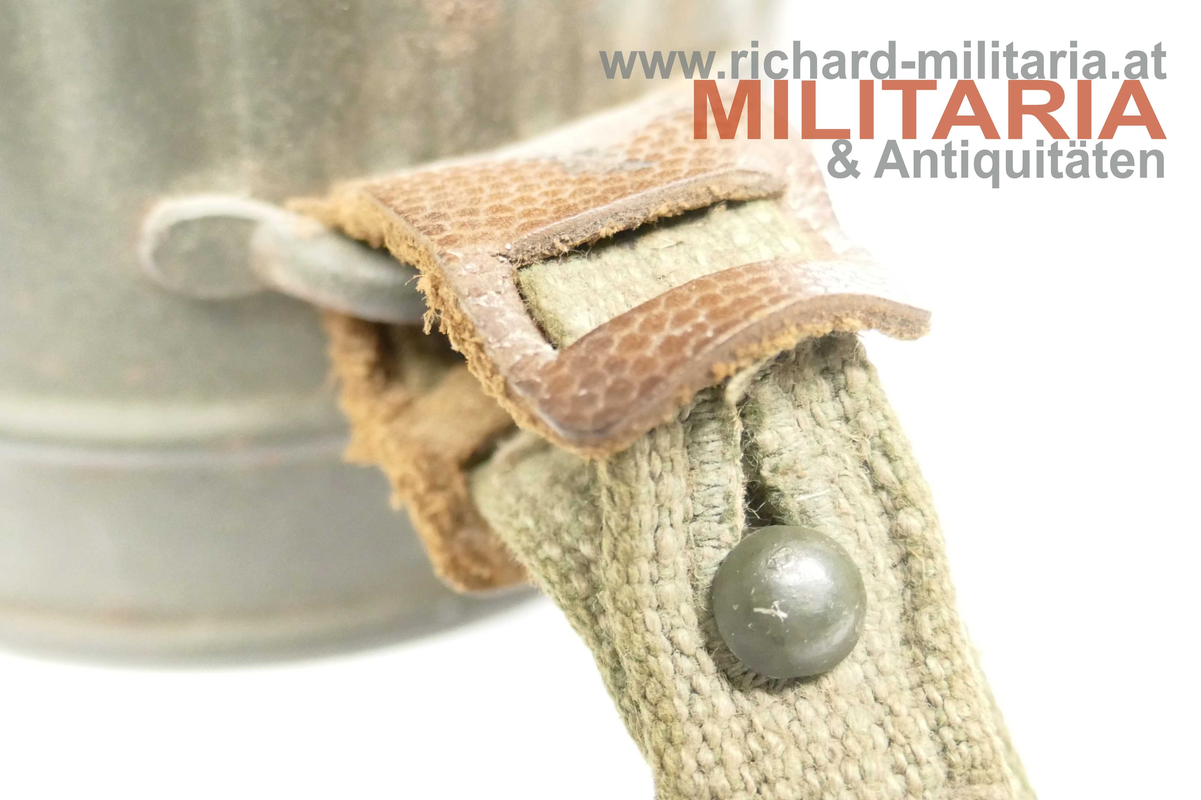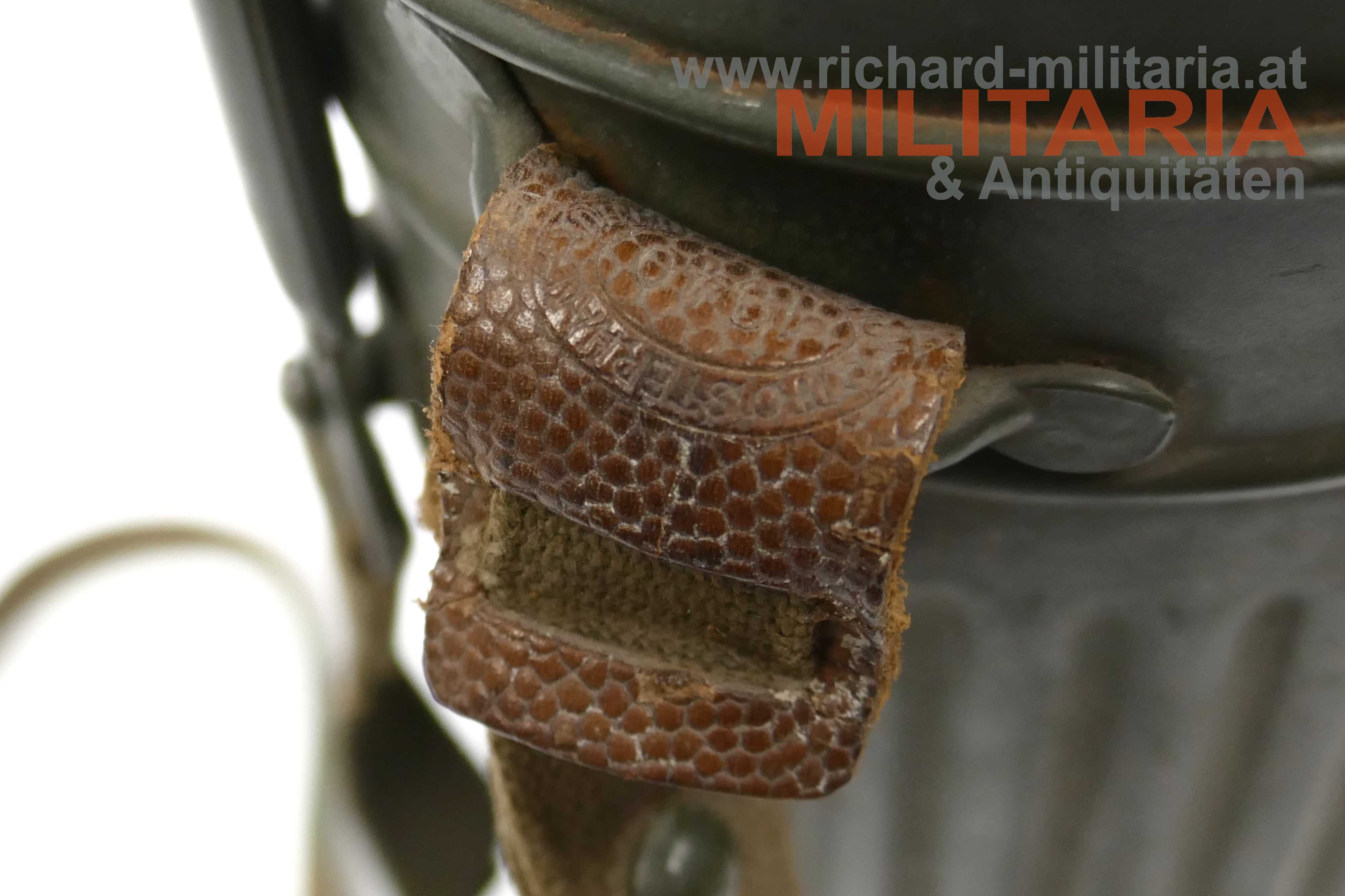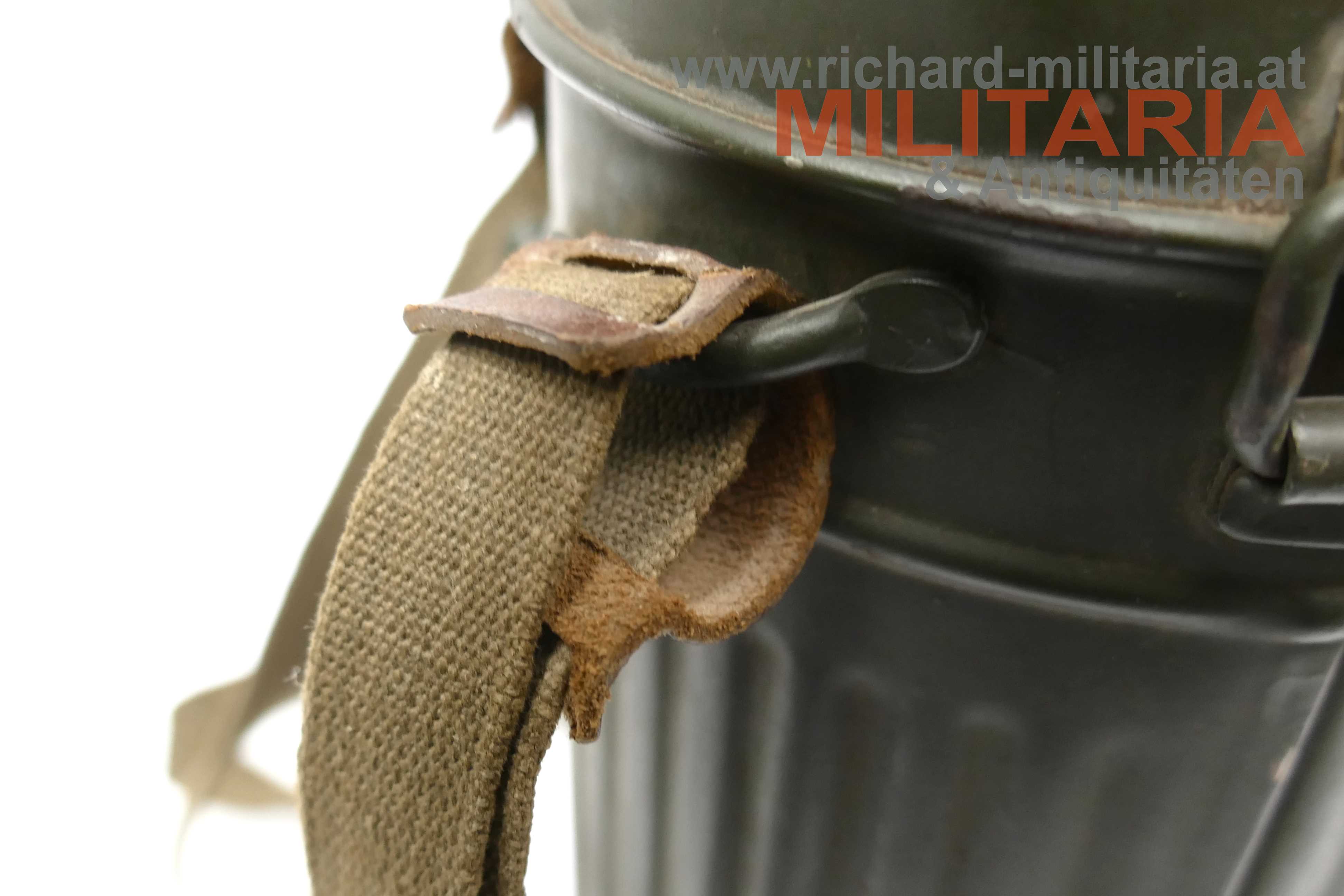 Wehrmacht - Gasmaskendose M38; Eisen feldgrau lackiert; Lackierung sehr gut erhalten; Beriemung vollständig vorhanden; an der Lederhalterung des Trageriemens mit Herstellerstempel "1940"; Ersatzgläser vorhanden; leichte Tragespuren