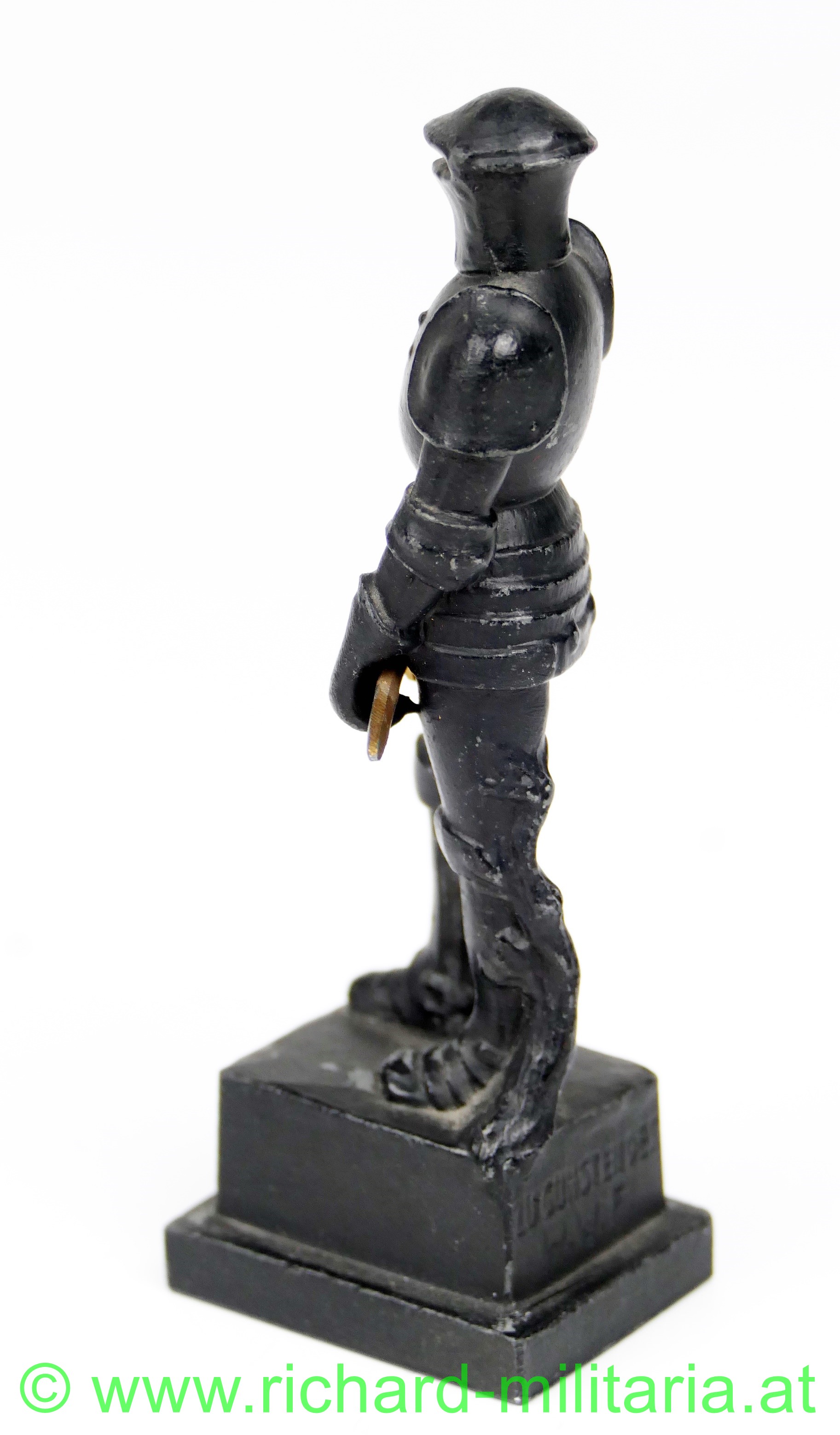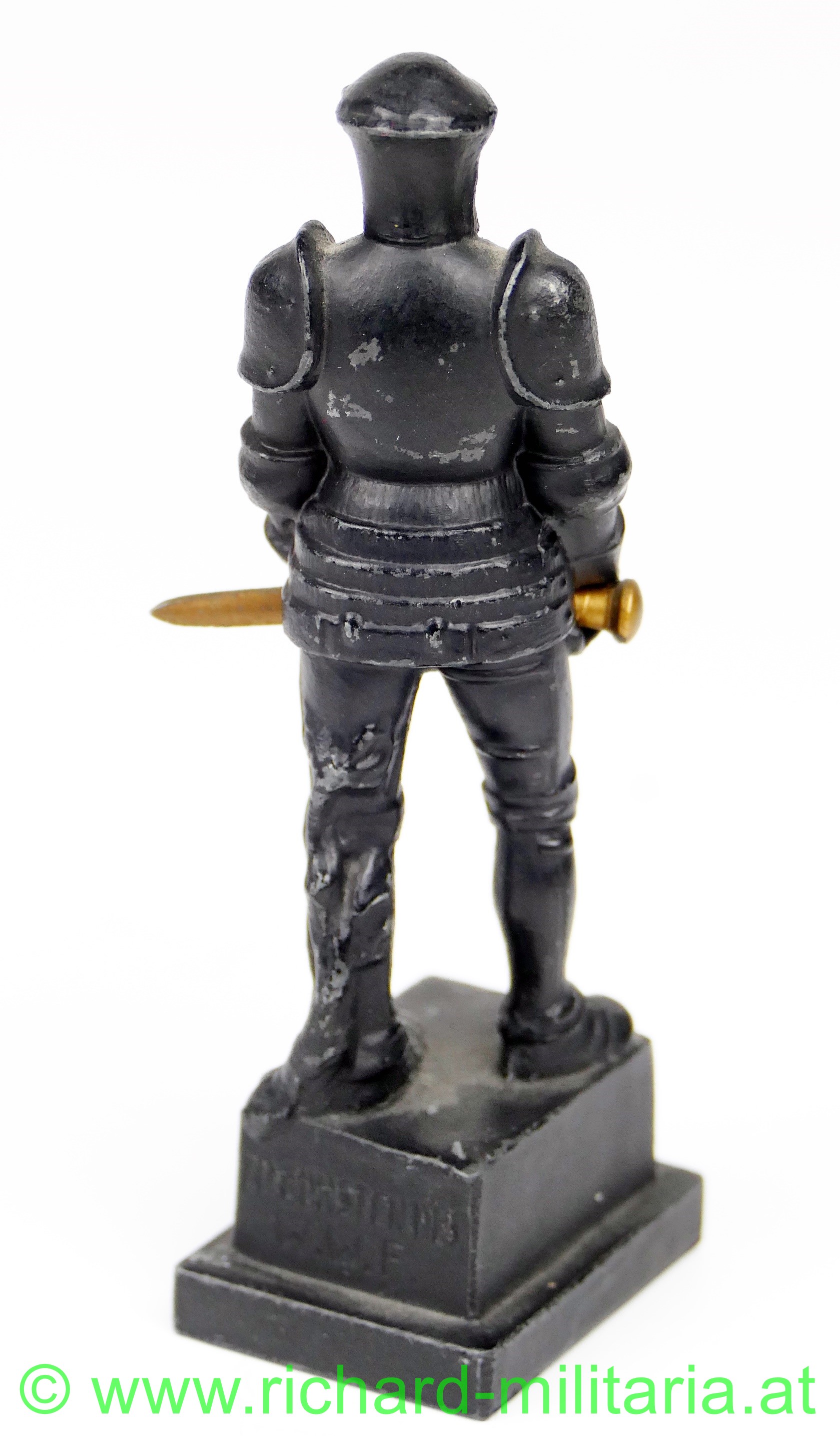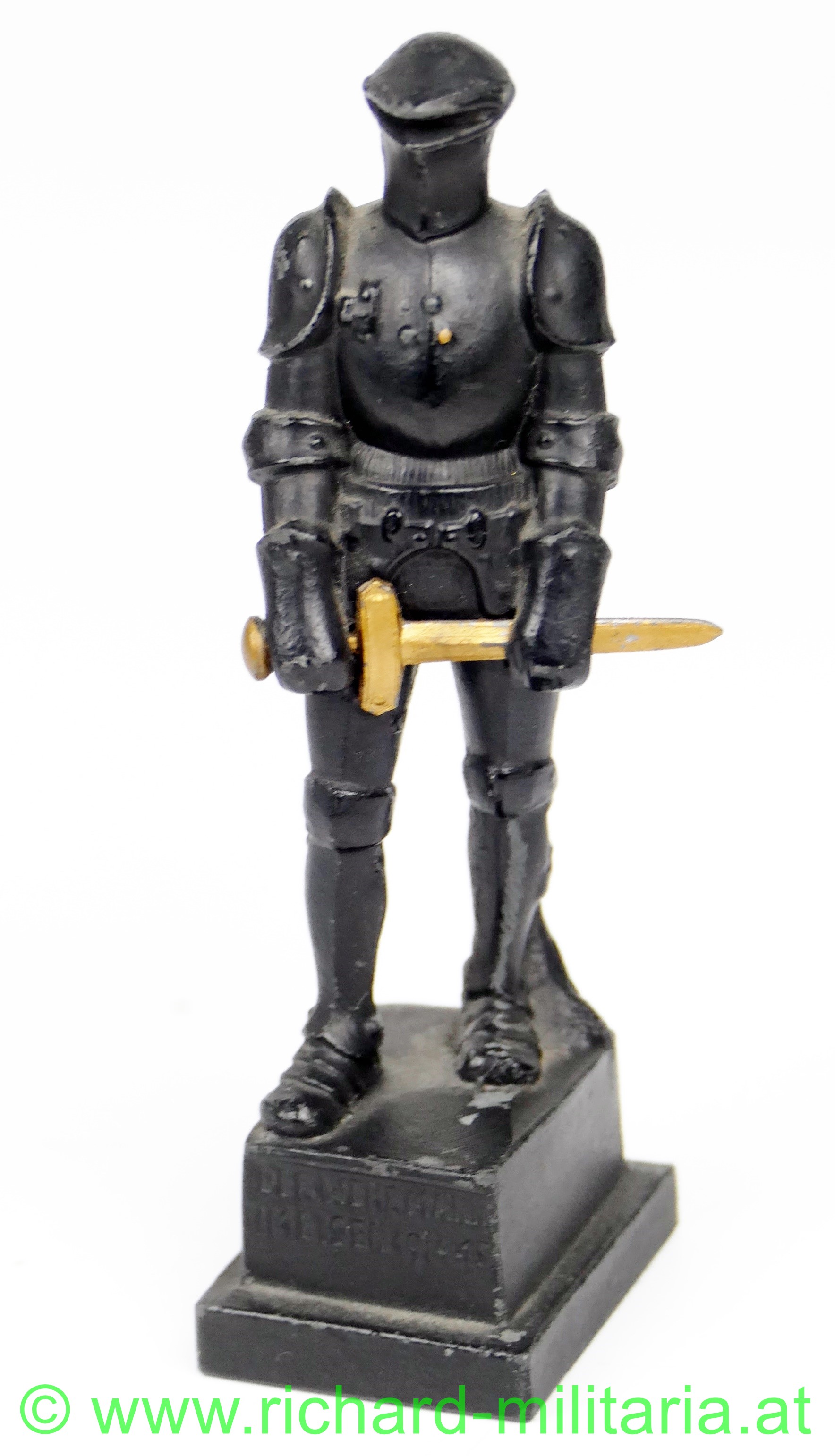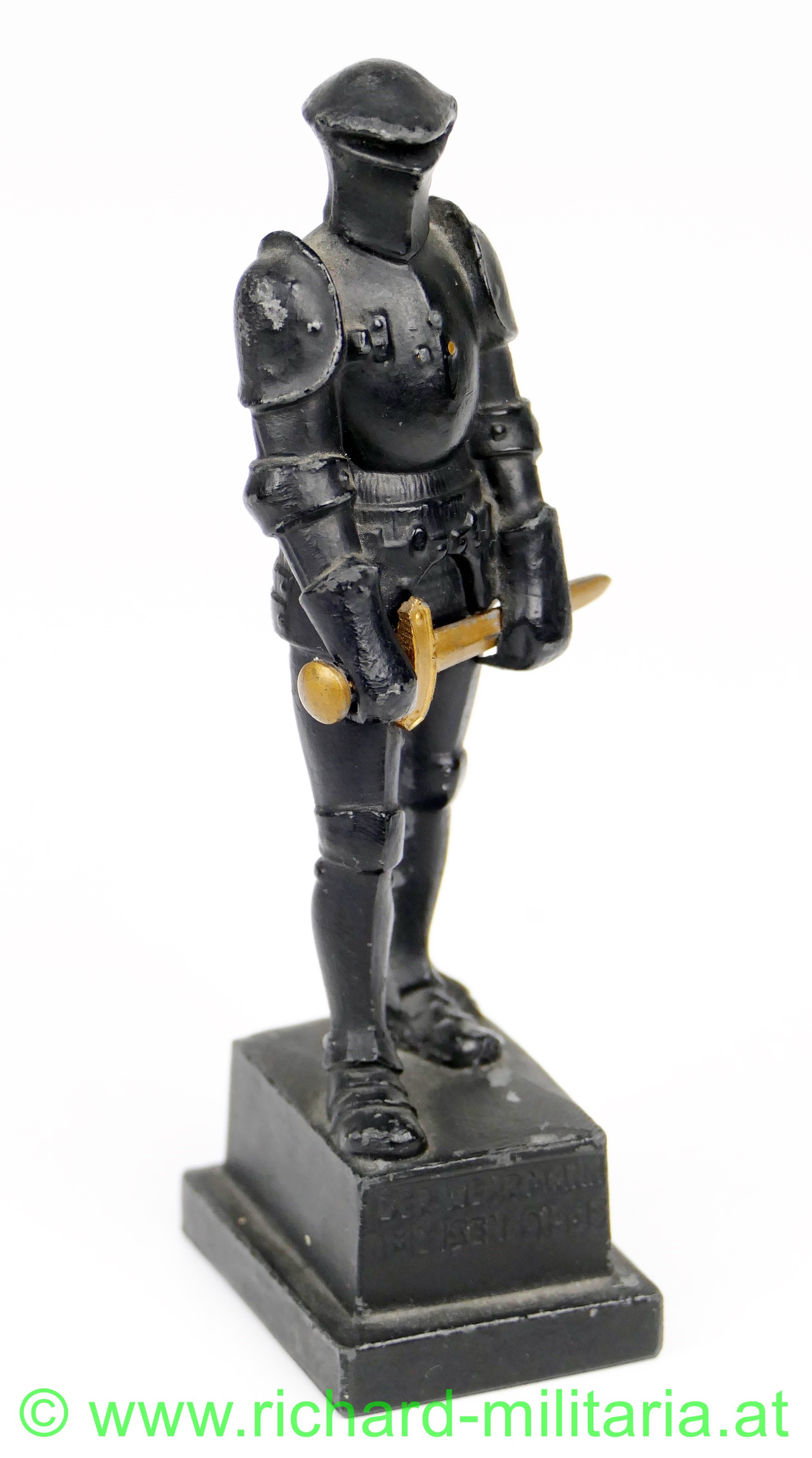 Wehrmann im Eisen 1914-15, kleine Größe, Variante mit den 3 Nieten am Brustpanzer, Zinkguss mit originaler schwarzer Lackierung, vergoldetes Schwert, am Sockel auf der Rückseite Inschrift "Zu Gunsten des W.W.F.", Avers "Der Wehrmann im Eisen 1914-15", ca. 10,5 cm Höhe, wenige kleine Chips in der Lackierung, ansonsten sehr guter Zustand