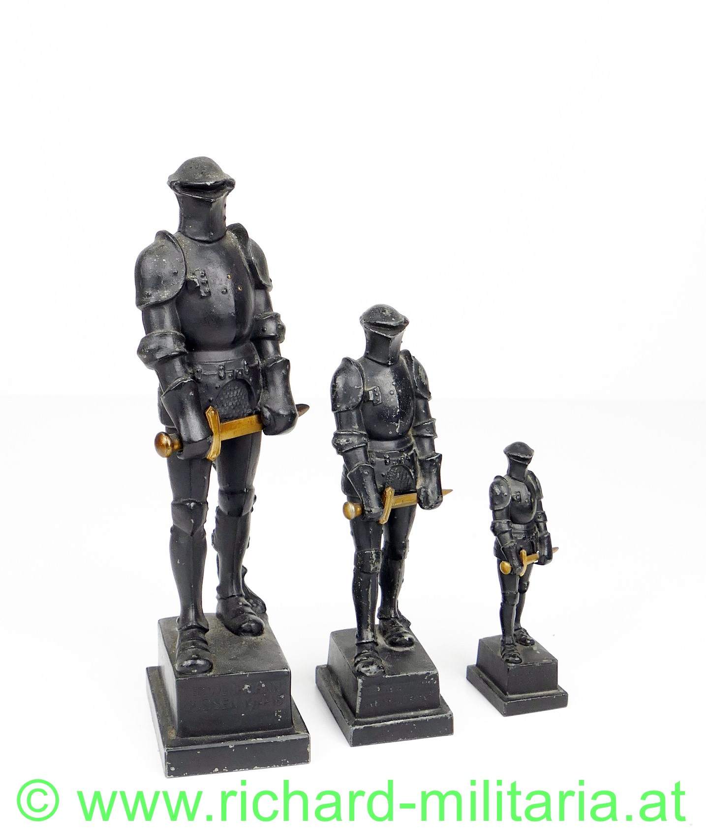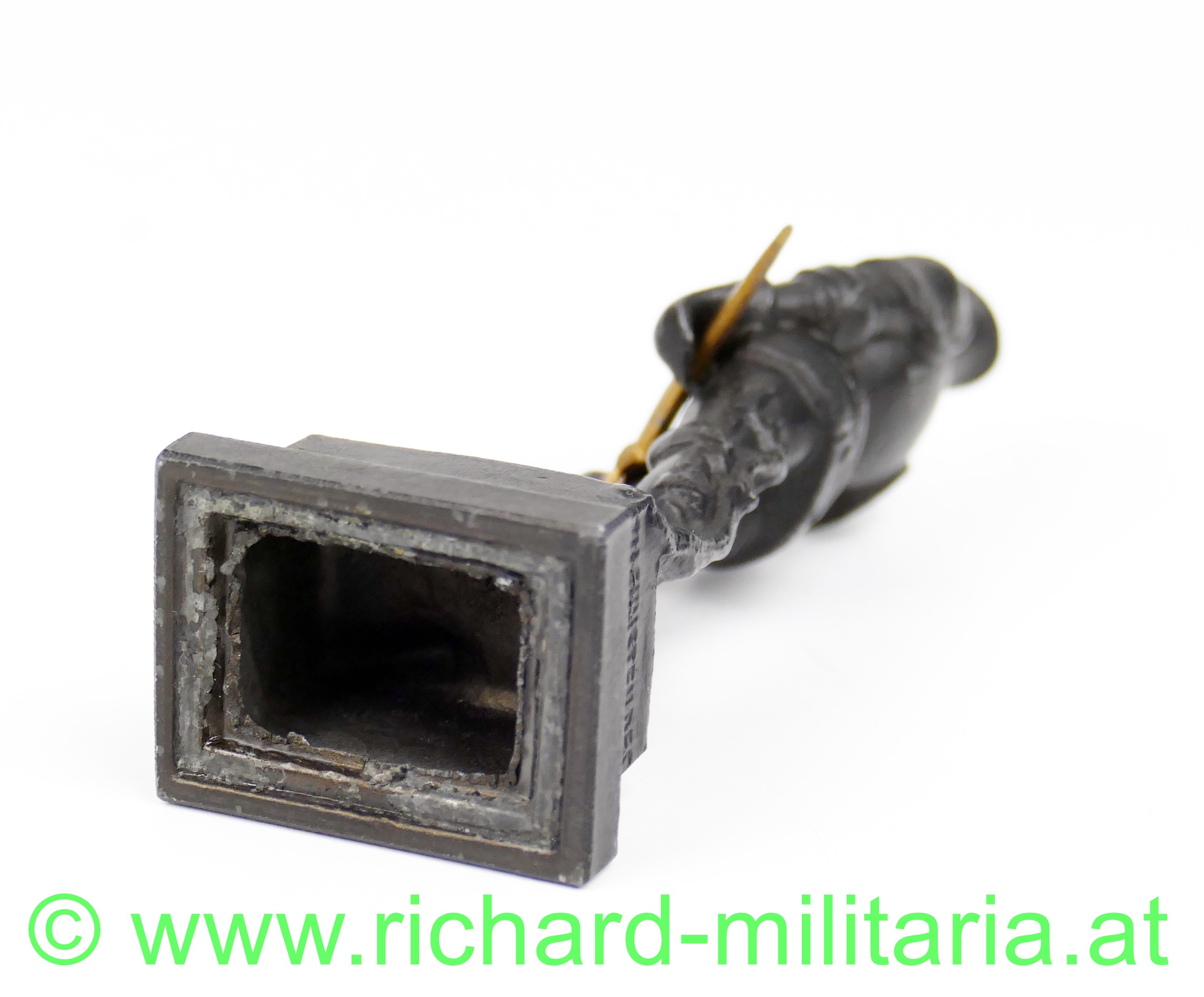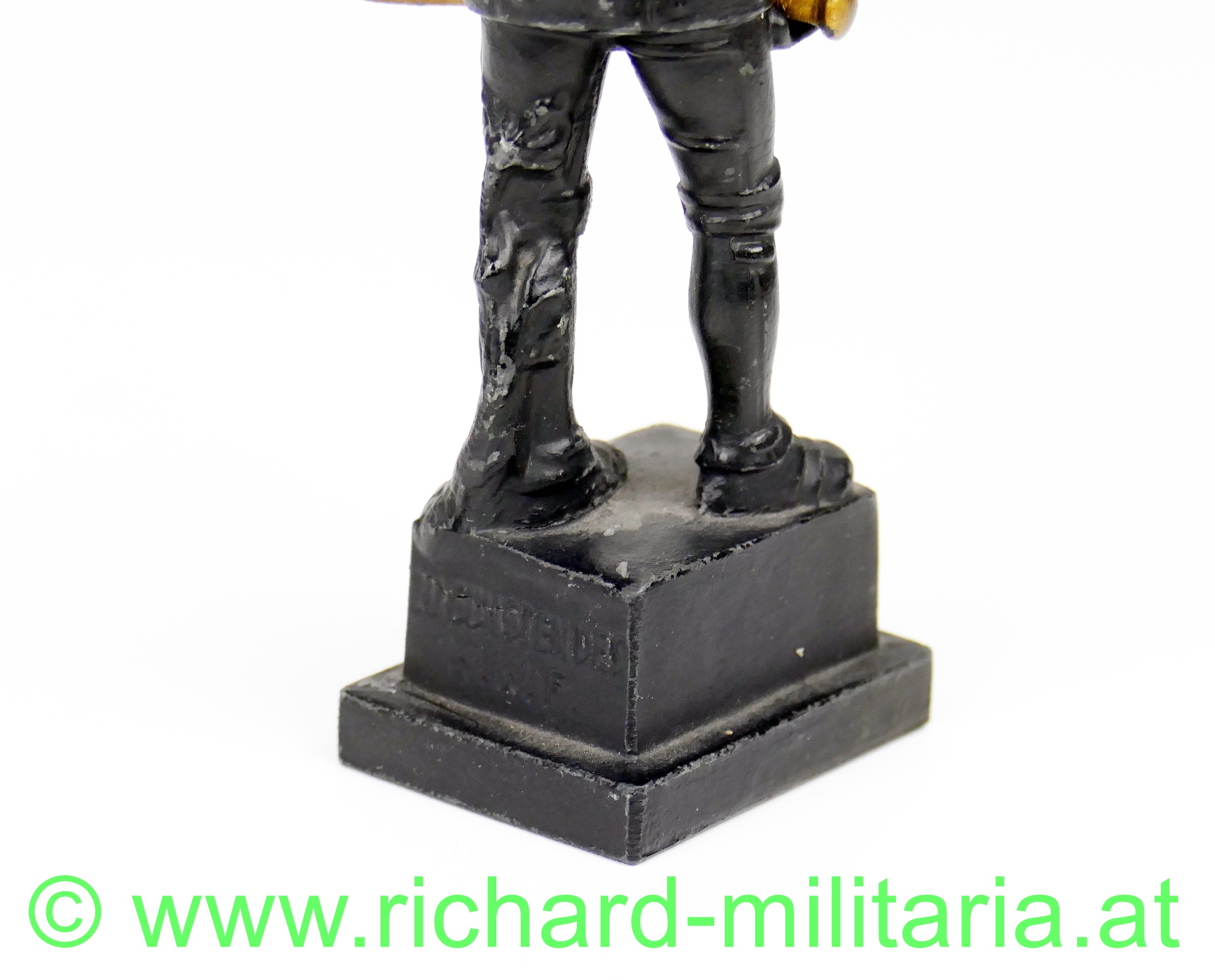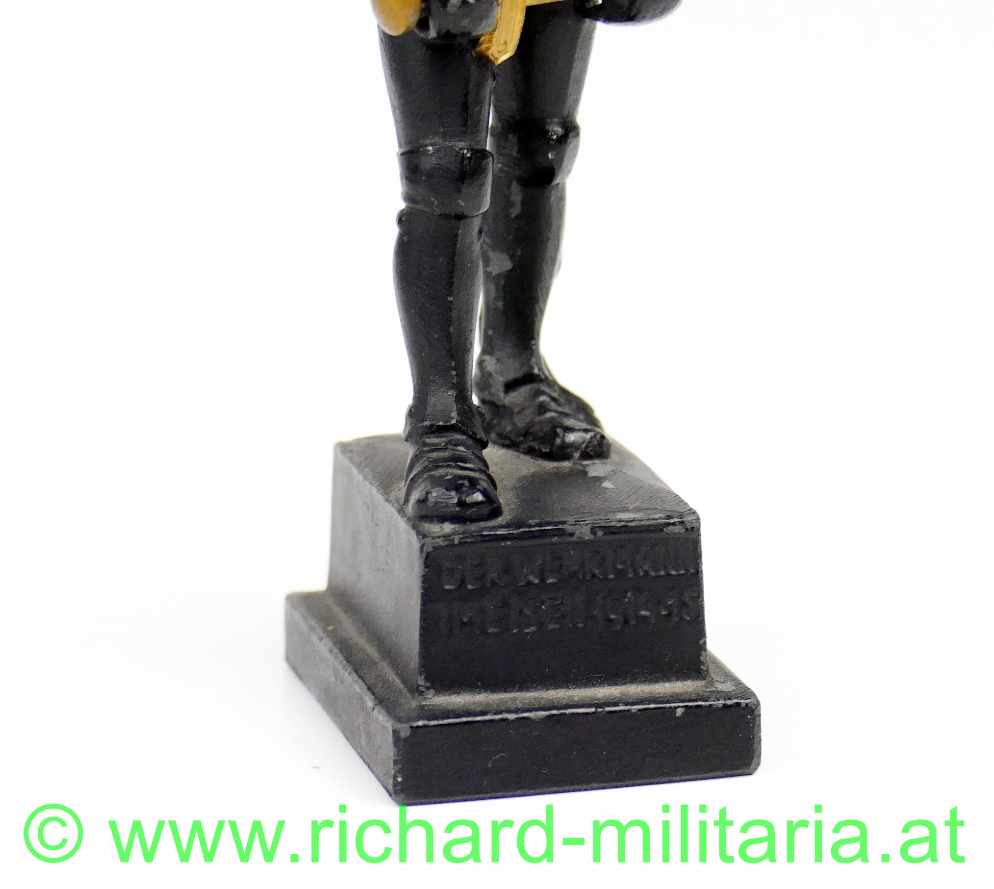 Wehrmann im Eisen 1914-15, kleine Größe, Variante mit den 3 Nieten am Brustpanzer, Zinkguss mit originaler schwarzer Lackierung, vergoldetes Schwert, am Sockel auf der Rückseite Inschrift "Zu Gunsten des W.W.F.", Avers "Der Wehrmann im Eisen 1914-15", ca. 10,5 cm Höhe, wenige kleine Chips in der Lackierung, ansonsten sehr guter Zustand