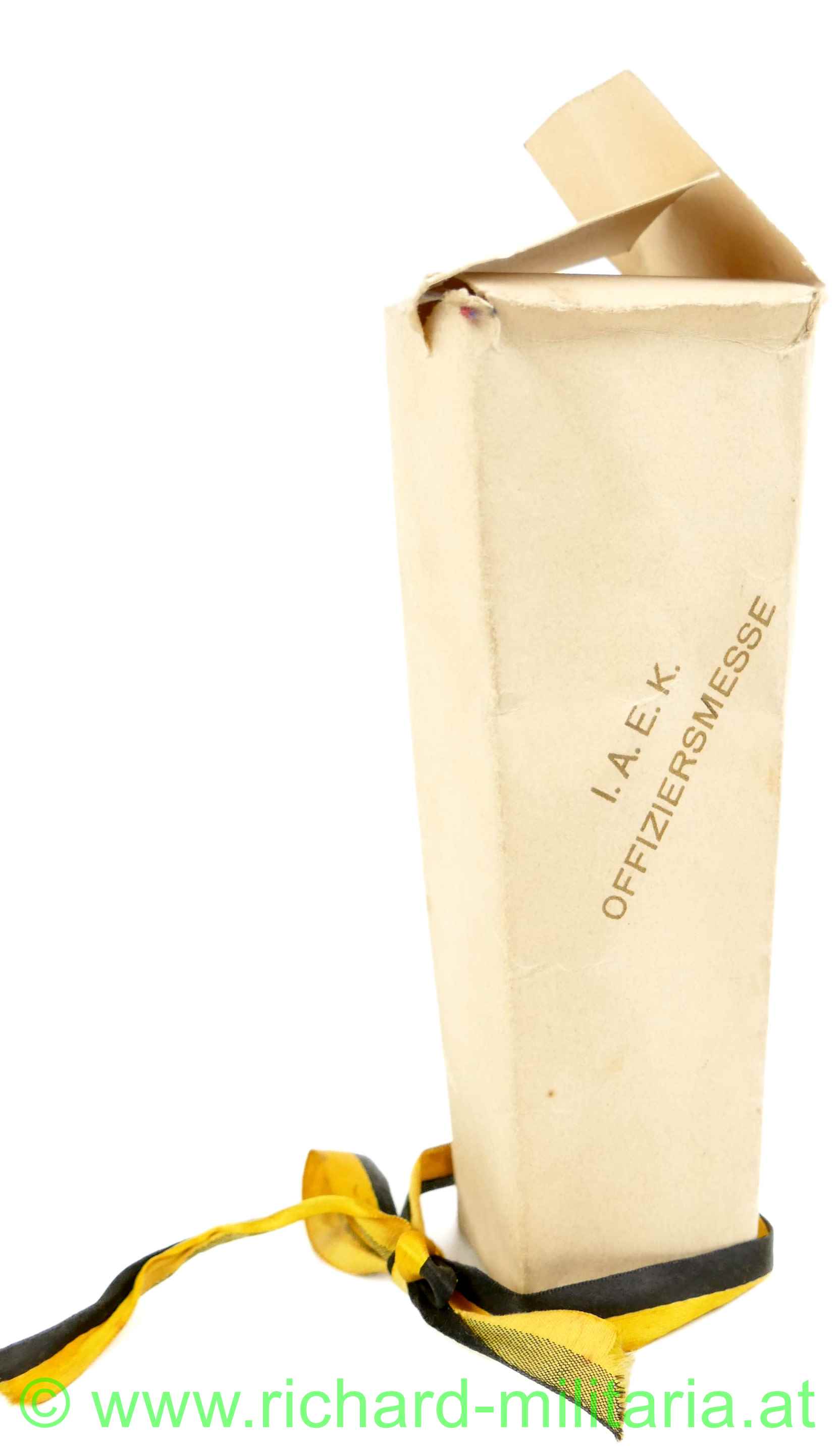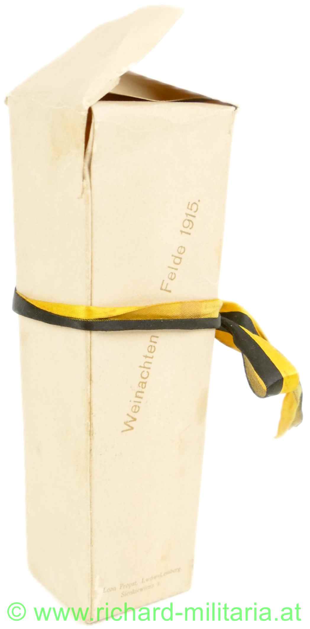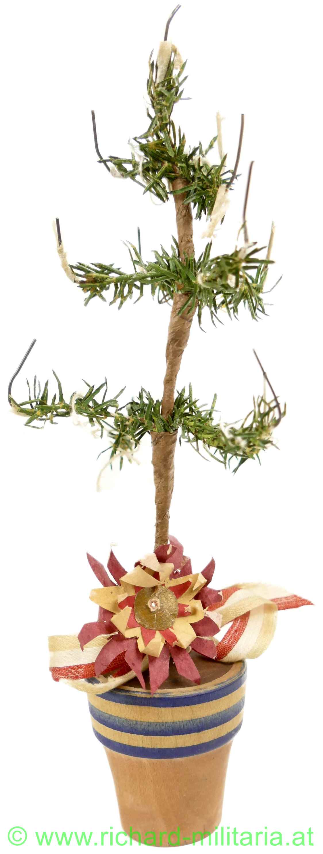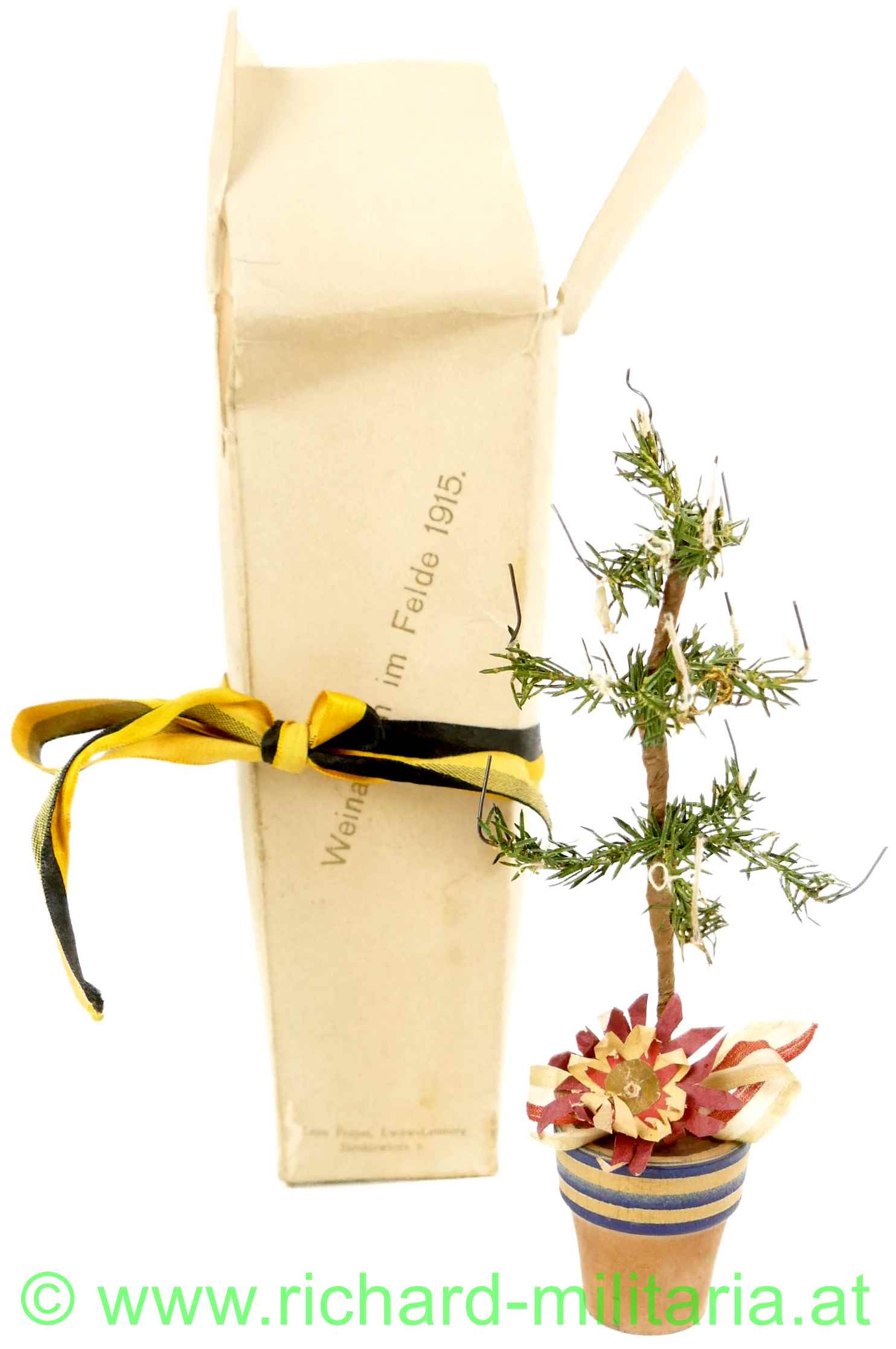 Weihnachten im Felde 1915 - Miniaturchristbaum mit Überkarton, Holz lackiert, Draht umwickelt; Grabenweihnachtsbaum mit Seidenmasche in ungarischen Farben, dazugehöriger Überkarton: "Weihnachten im Felde 1915" u. "I.A.E.K. OFFIZIERSMESSE" - Karton noch mit einer Seidenschleife in den Kaiserfarben geschmückt;