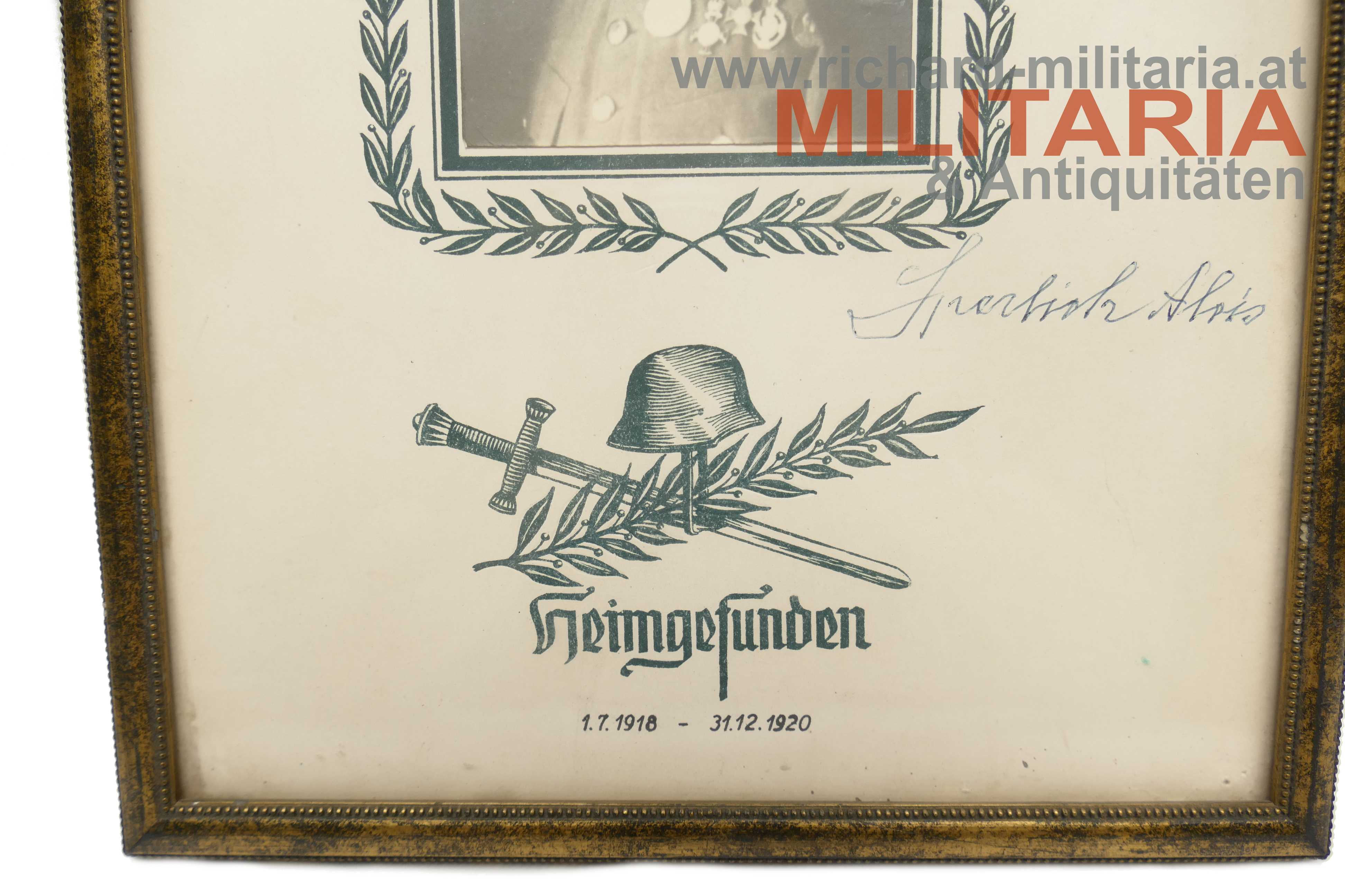 Weltkriegserinnerungsbild - Gendarmerie - 1. Republik - 1.7.1918-31.12.1920, Schmuckvordruck mit steirischen Panther hinter Glas mit Bildnis des Gendarmeriebeamten; Auszeichnungen aus dem 1. Weltkrieg und der Zwischenkriegszeit; Unterschrift: "Sperlich Anton"; schwarz/goldener dezenter Rahmen;