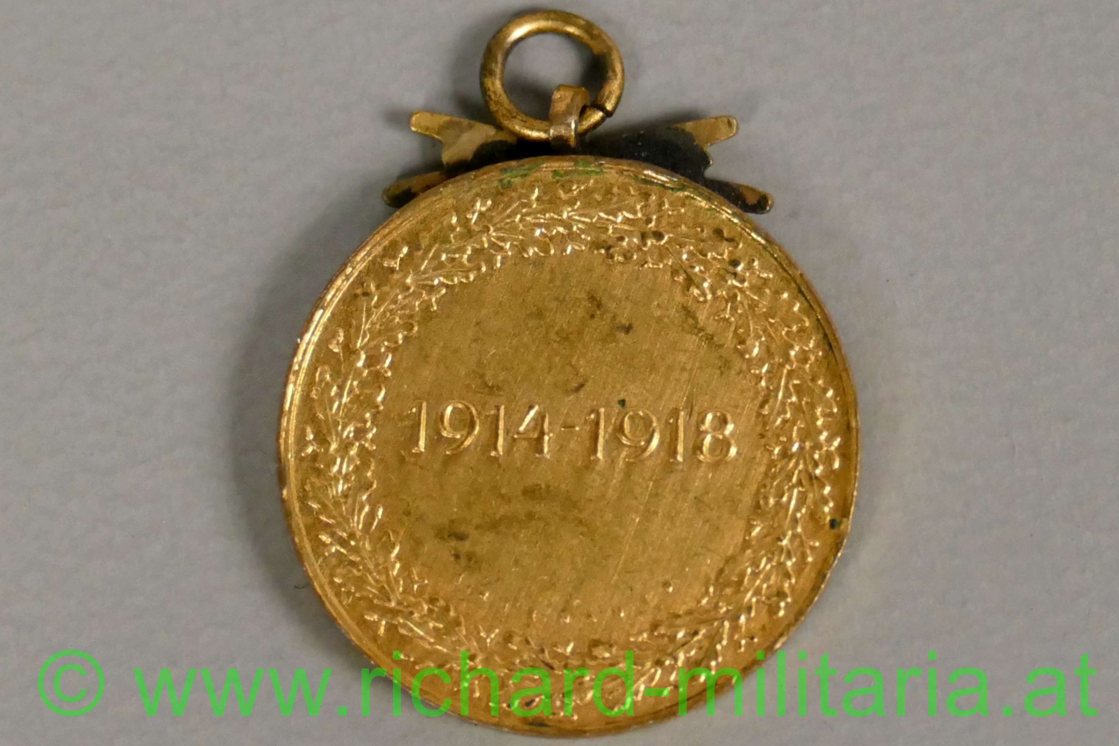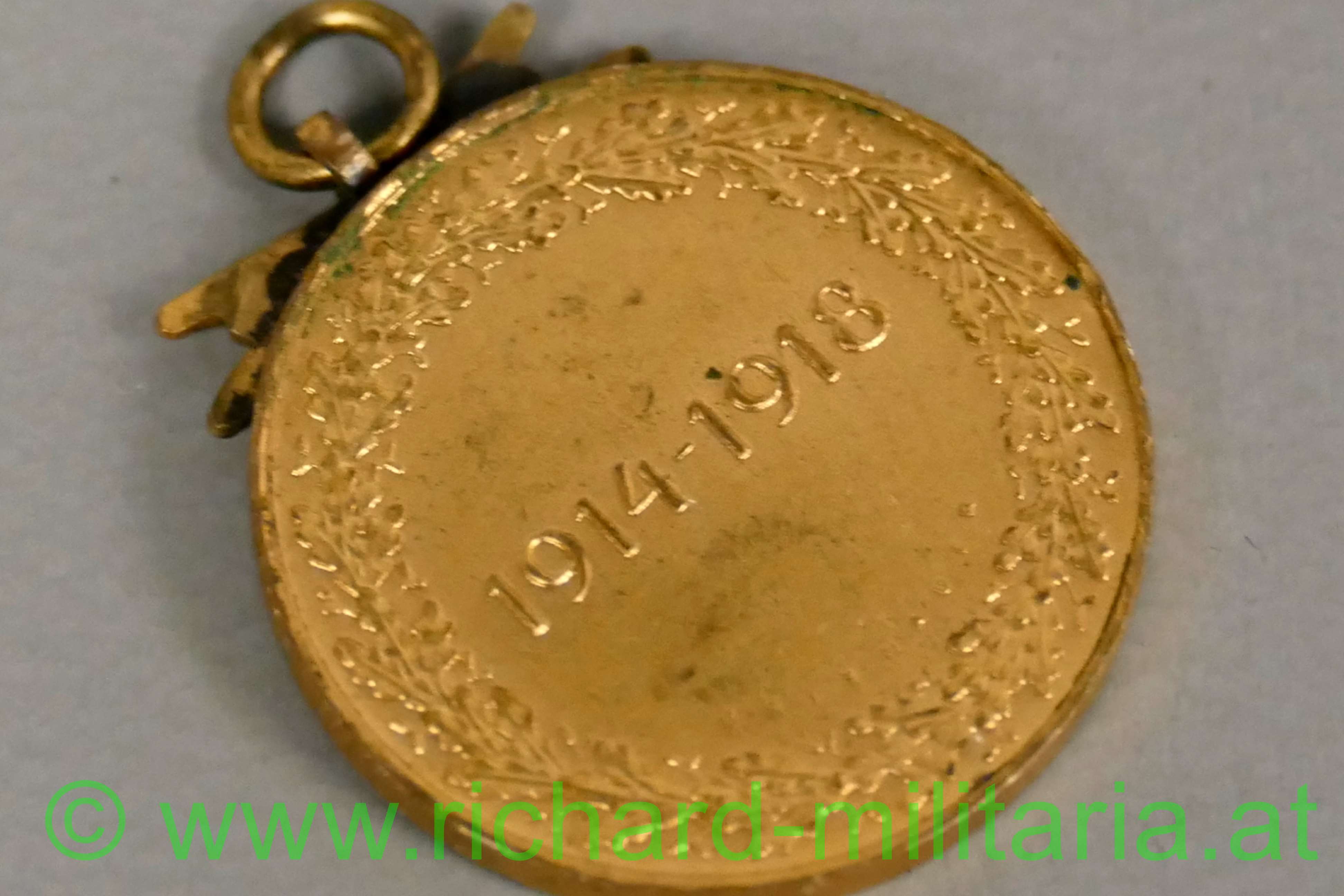 Weltkriegserinnerungsmedaille 1914-1918 mit Schwerter - Miniatur, Tombak vergoldet mit Tragering; DM ca.: 18mm