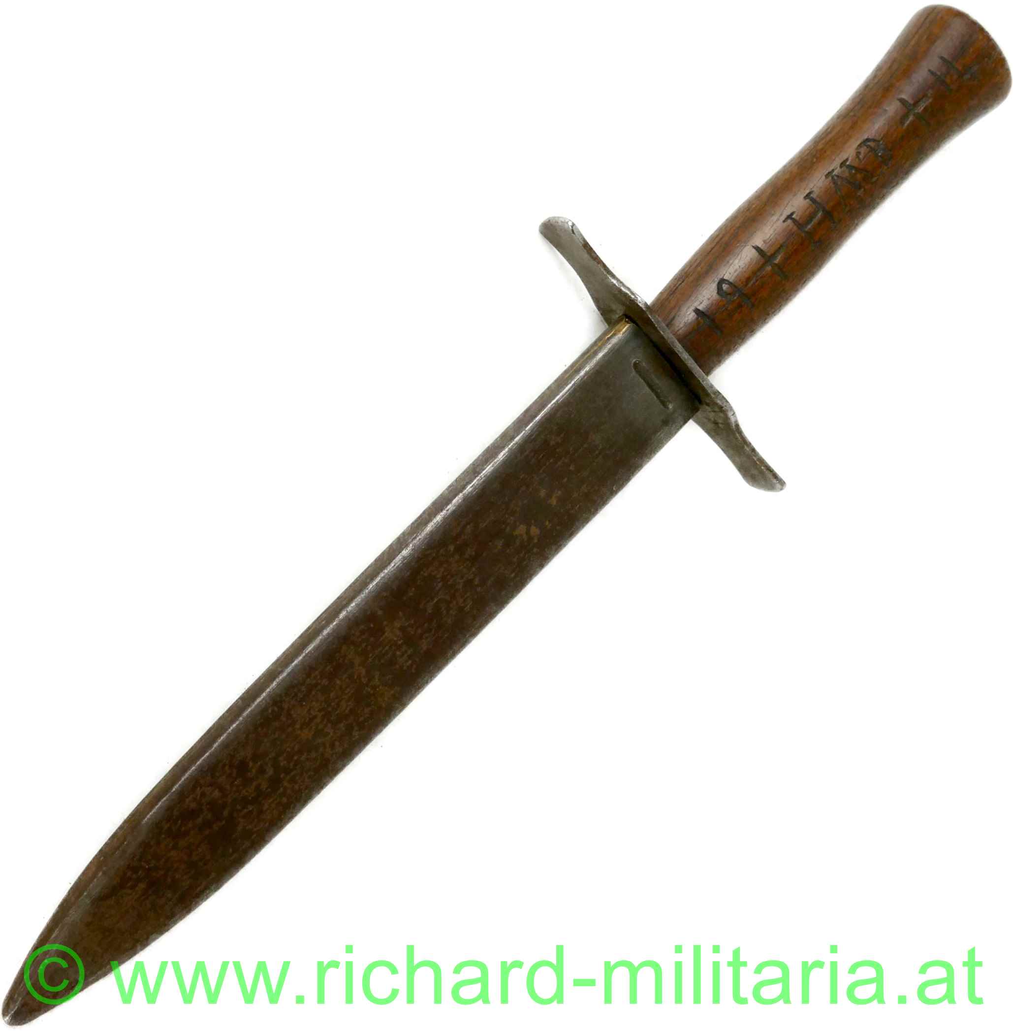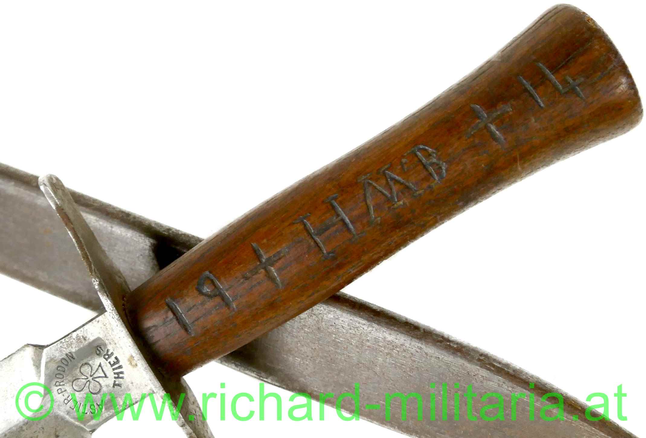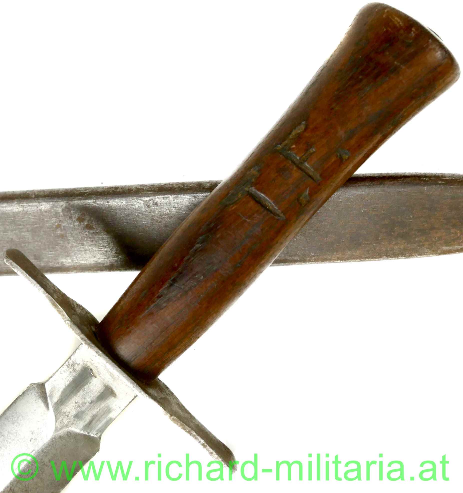 Personalisierter französischer Grabendolch (Couteau Poignard Mle 1916) des Herstellers "Astier-Prodon Thiers"; zweischneidige leicht fleckige Klinge; Punzierung "W" und Sternchen auf der Parierstange; Holzgriff personalisiert mit eingeschnitzten Initialen "T.F." und "19 + HMB + 14"; Scheide mit dem typischen "Henkel";