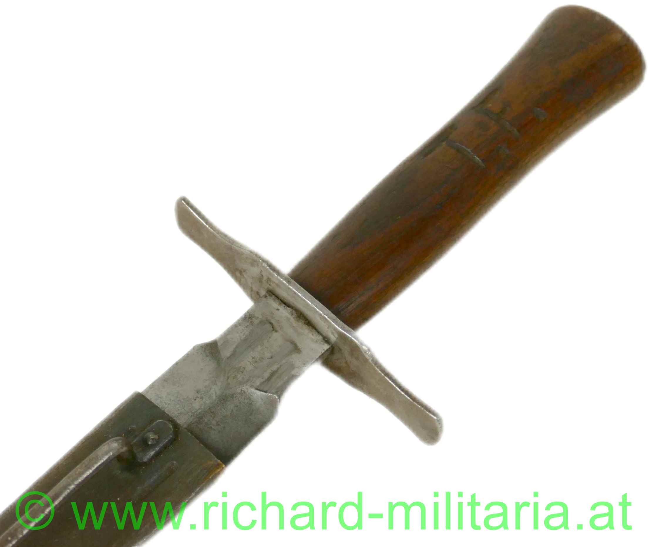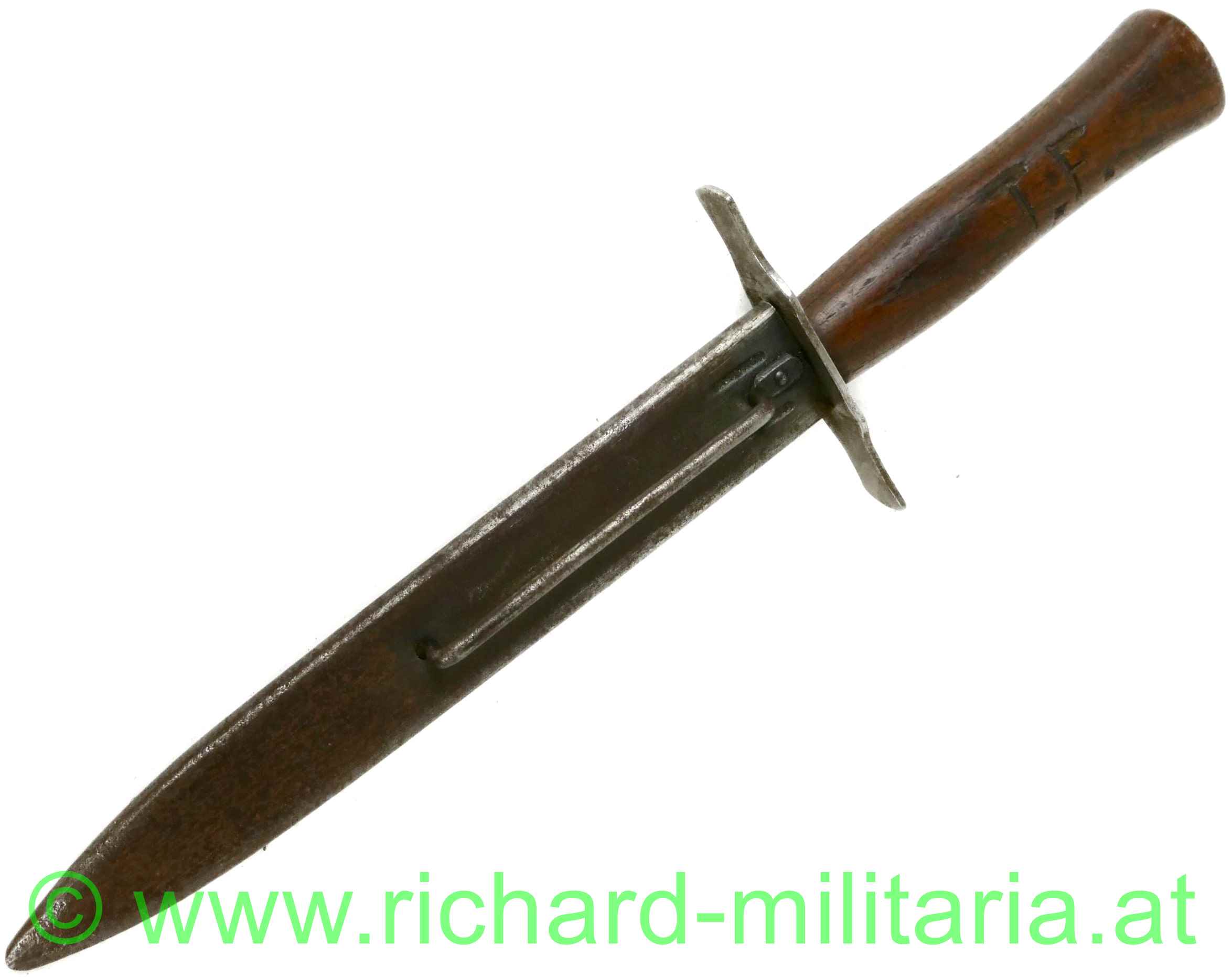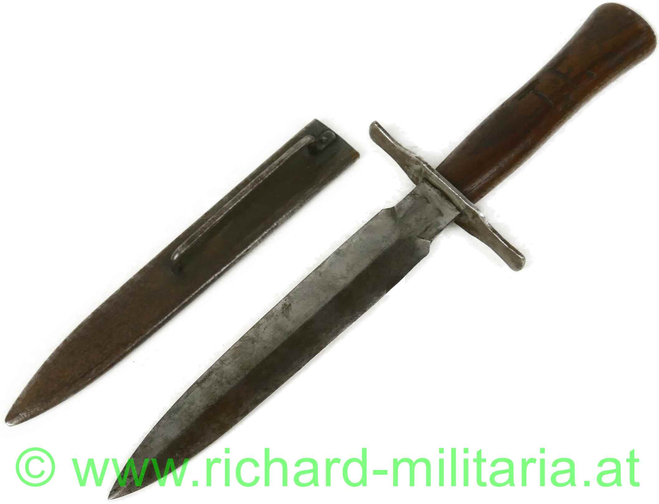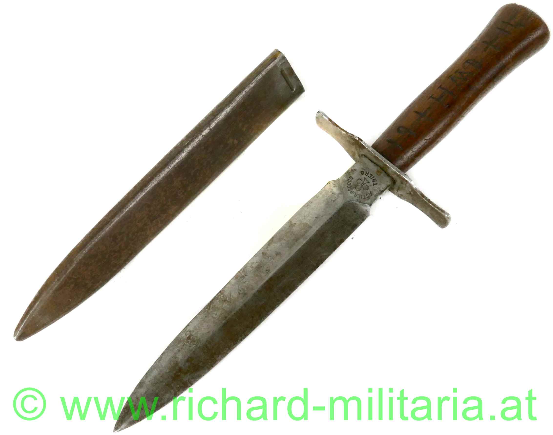 Personalisierter französischer Grabendolch (Couteau Poignard Mle 1916) des Herstellers "Astier-Prodon Thiers"; zweischneidige leicht fleckige Klinge; Punzierung "W" und Sternchen auf der Parierstange; Holzgriff personalisiert mit eingeschnitzten Initialen "T.F." und "19 + HMB + 14"; Scheide mit dem typischen "Henkel";